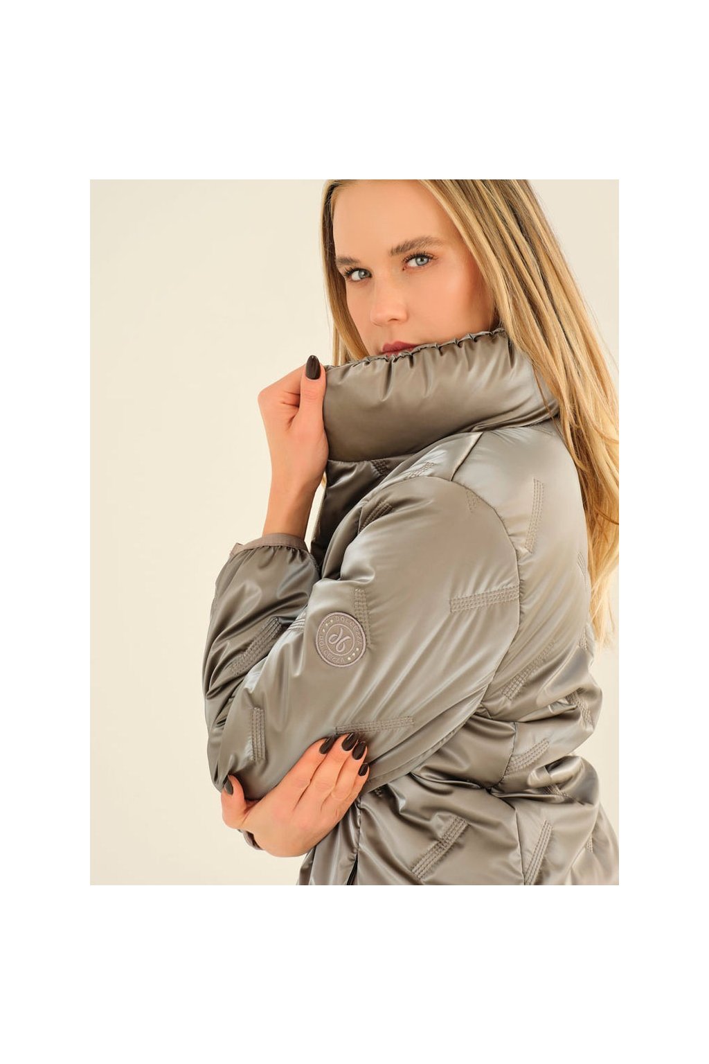 Krátka lesklá bunda s výrazným golierom - teplo a štýl. Táto krátka bunda s lesklým efektom a výrazným golierom je ideálna pre chladnejšie dni. Vďaka teplému prevedeniu vás spoľahlivo zahreje, zatiaľ čo moderný dizajn a lesklý materiál dodávajú outfitu šmrnc. Perfektný na každodenné nosenie a jednoduché kombinovanie s džínsami alebo sukňou.
