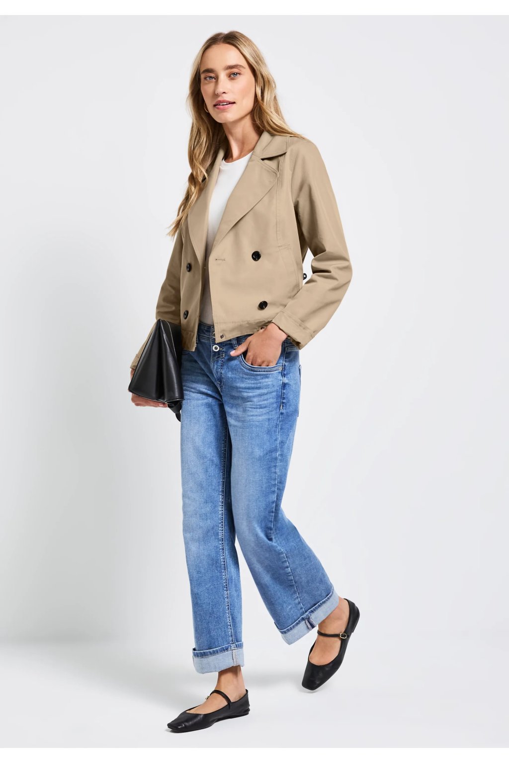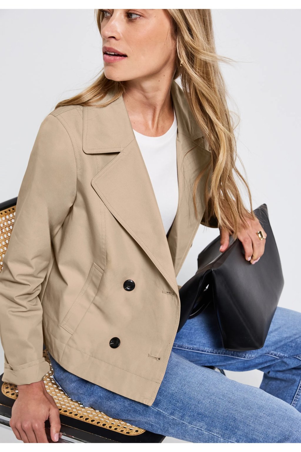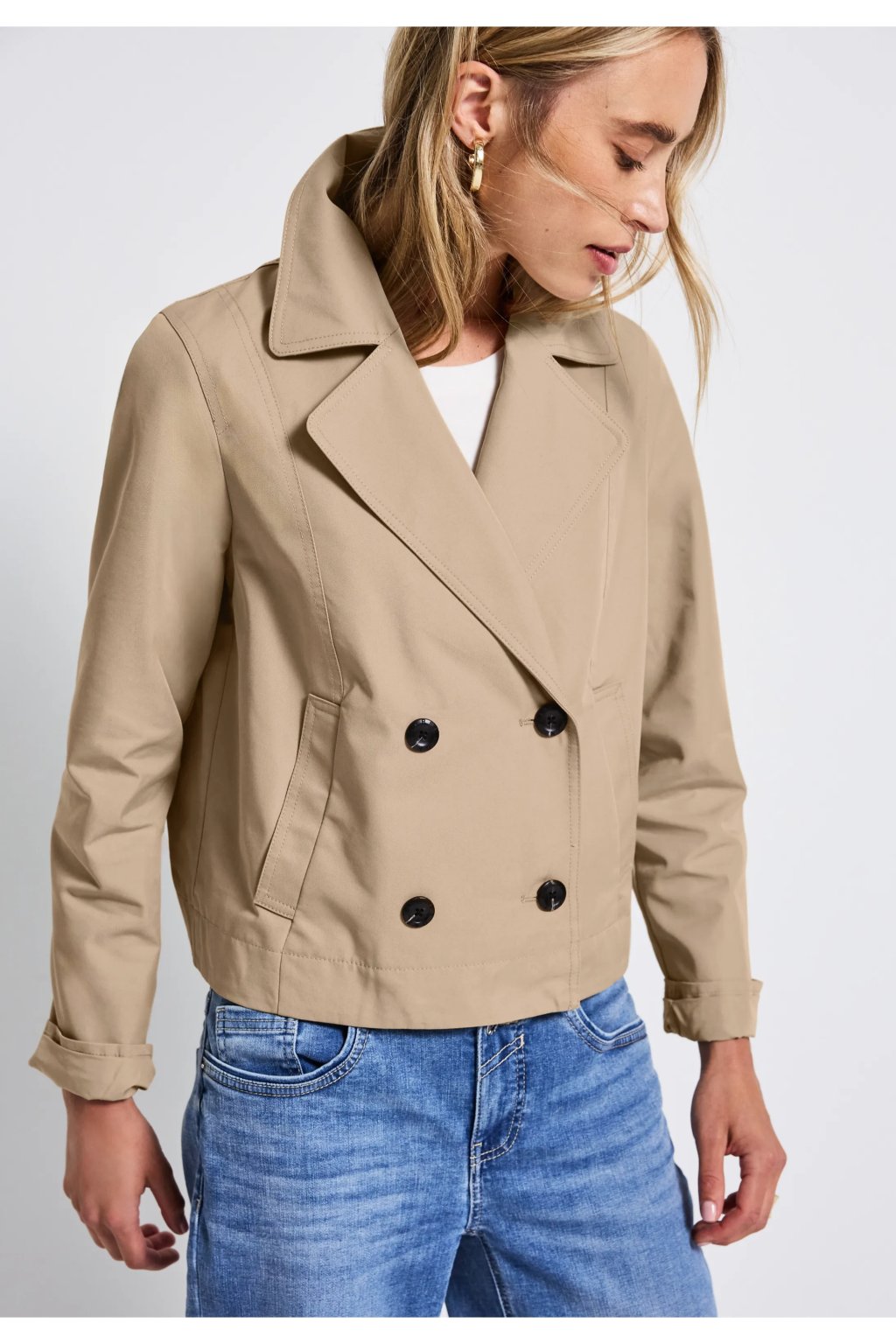 Tento krátky trenčkot od Street One pre ženy kombinuje klasický štýl s modernými detailmi. Zapínanie na dva gombíky, elegantný klopový golier a bočné vrecká vytvárajú charakteristický trenčkotový vzhľad, zatiaľ čo elastický pás vzadu vytvára ženskú siluetu. Táto ľahká bunda, vyrobená z robustného kepru, je ideálnym doplnkom k štýlovým prechodným outfitom.