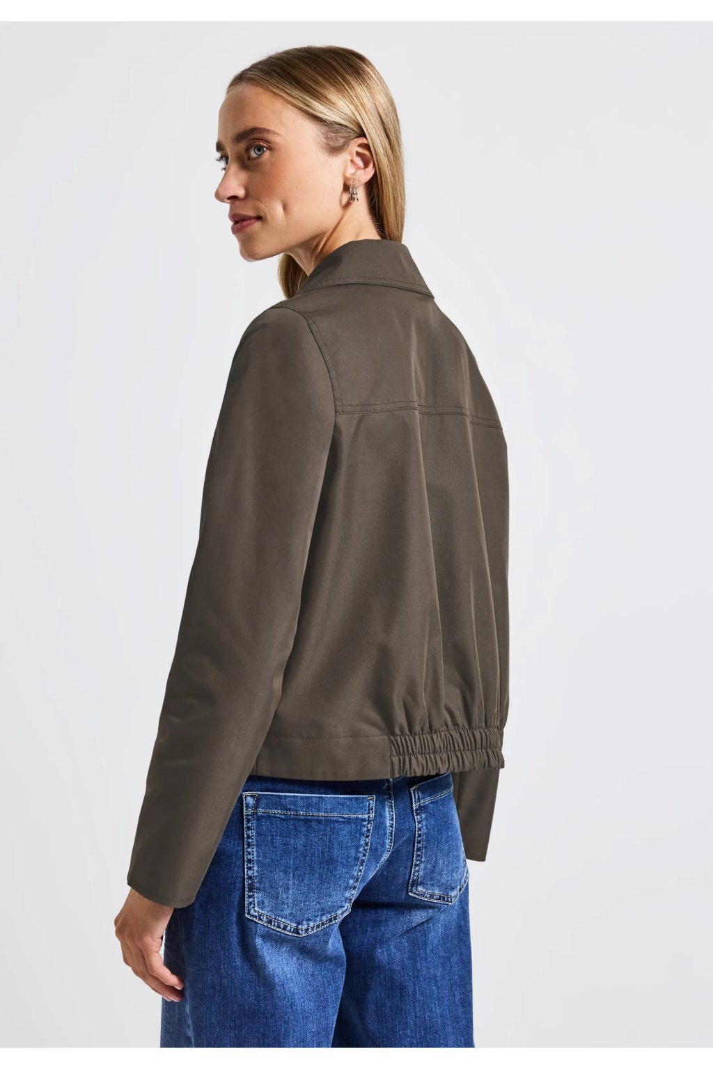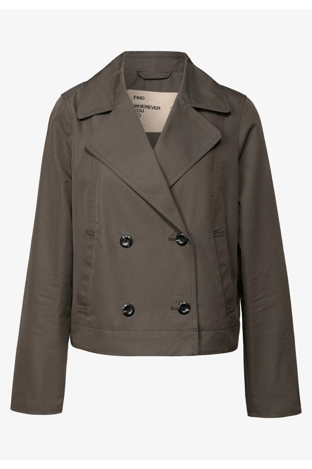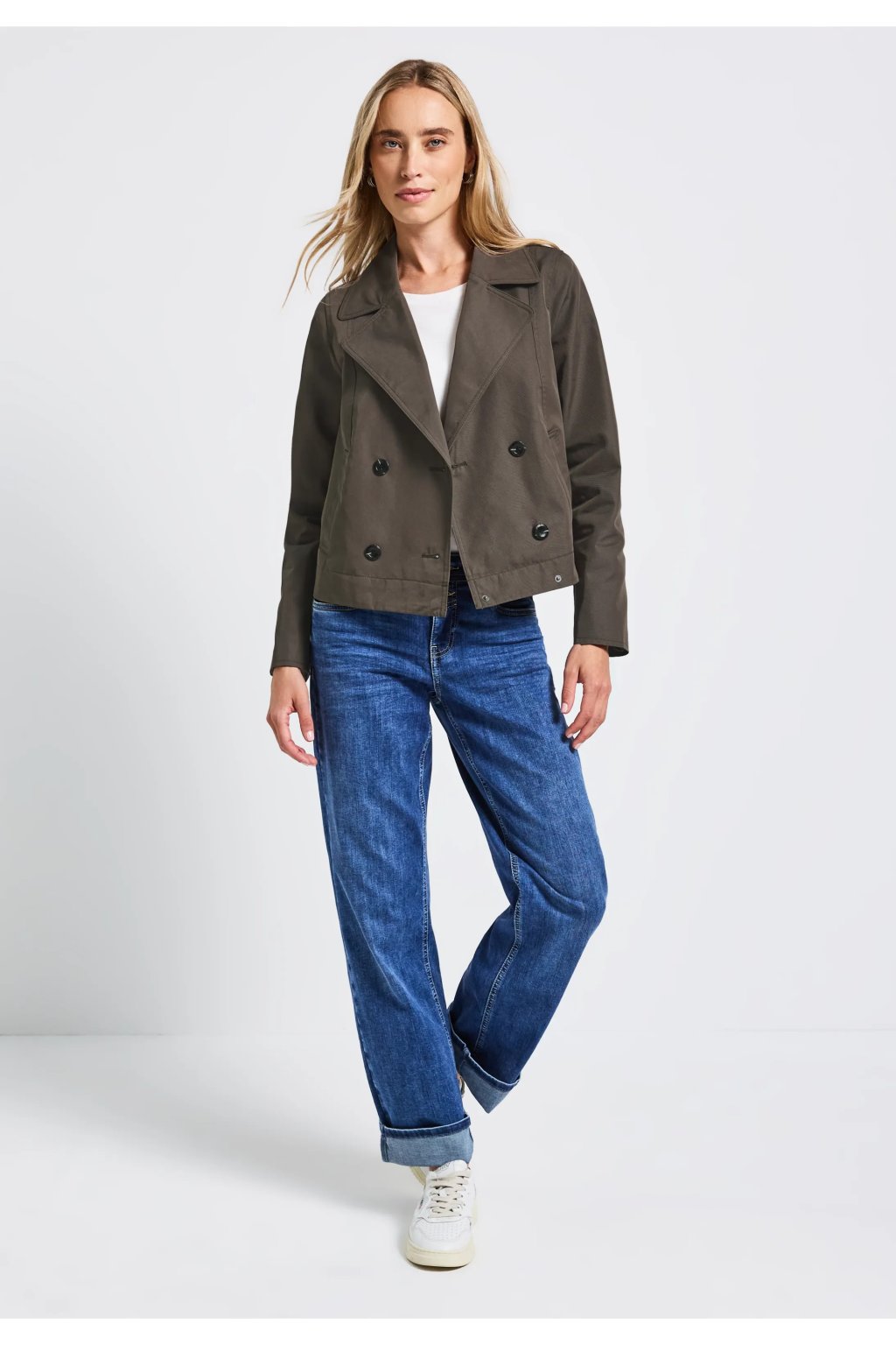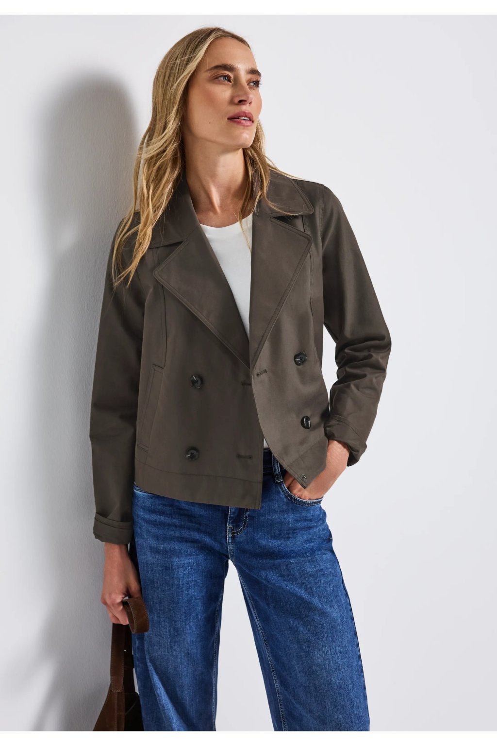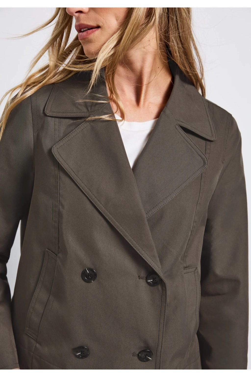 Tento krátky trenčkot od Street One pre ženy kombinuje klasický štýl s modernými detailmi. Zapínanie na dva gombíky, elegantný klopový golier a bočné vrecká vytvárajú charakteristický trenčkotový vzhľad, zatiaľ čo elastický pás vzadu vytvára ženskú siluetu. Táto ľahká bunda, vyrobená z robustného kepru, je ideálnym doplnkom k štýlovým prechodným outfitom.