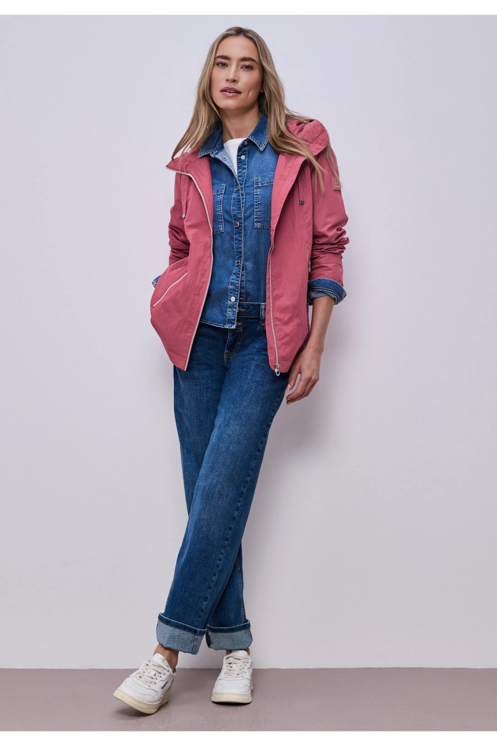 Táto moderná dámska vetrovka od Street One je vašim ľahkým spoločníkom na outdoorové aktivity so športovým nádychom. Zips po celej dĺžke dodáva bunde čistý vzhľad, zatiaľ čo kapucňa so sťahovacou šnúrkou umožňuje praktické nastavenie. Bočné vrecká ponúkajú priestor na drobnosti a dopĺňajú funkčný dizajn. Ideálna voľba pre veterné dni a ležérne voľnočasové štýly.