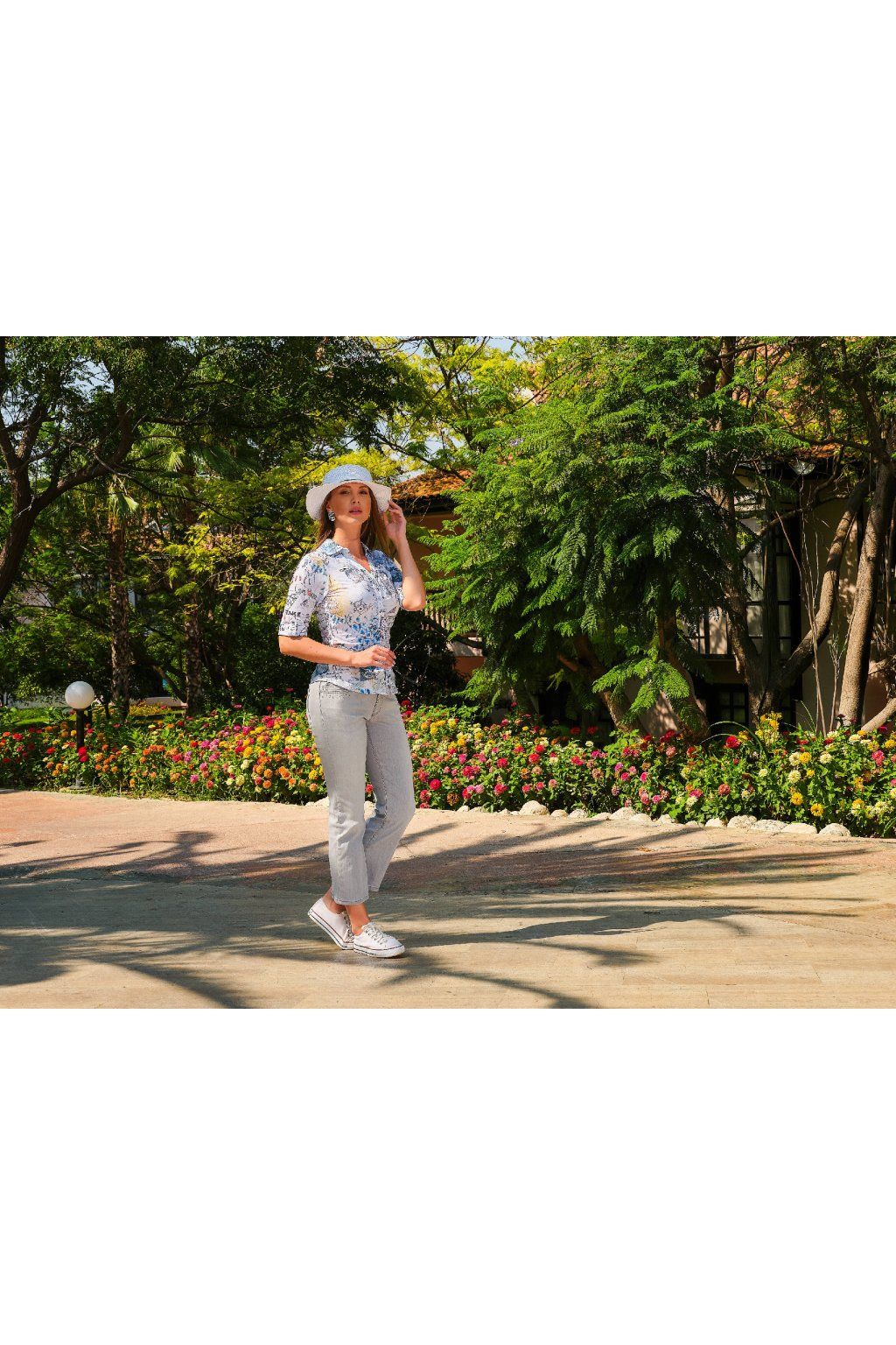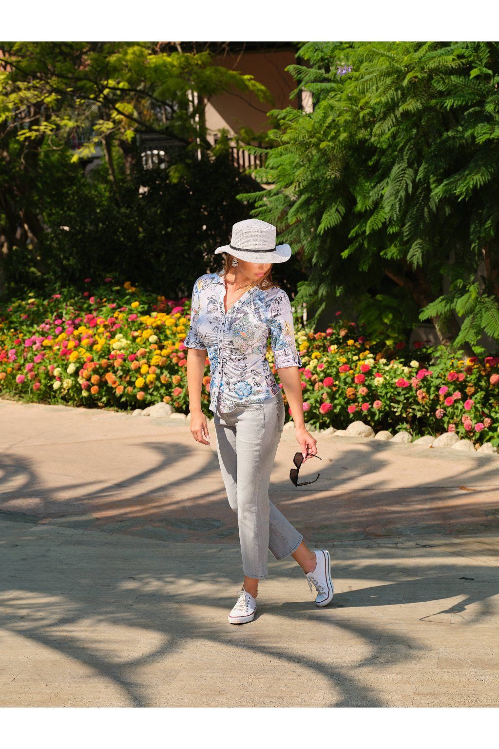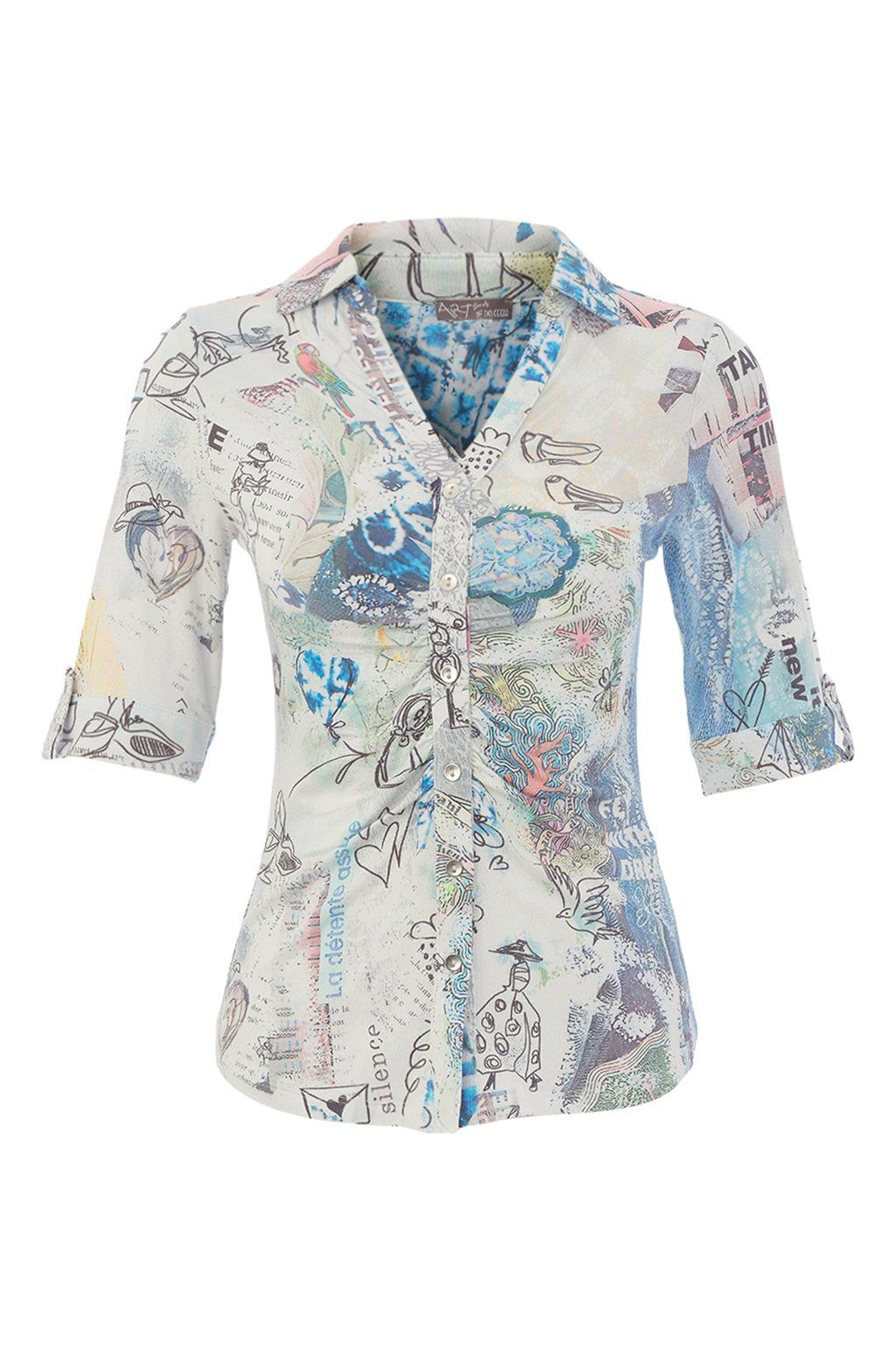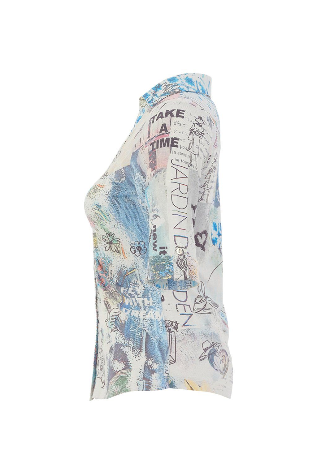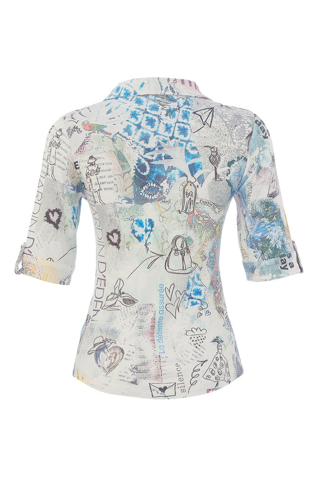 Dámska blúzka s originálnou celoplošnou potlačou zaujme na prvý pohľad svojou nápaditosťou, jemnými farbami a umeleckým výrazom. Kombinácia modrých, béžových a pastelových tónov s ilustratívnymi detailmi vytvára jedinečný vzhľad, ktorý oživí každý outfit. Košeľový golier, zapínanie na gombíky a rukávy s možnosťou vyhrnutia dodávajú modelu praktický aj elegantný charakter. Blúzka sa skvele hodí k jednoduchým nohaviciam, džínsom aj sukni a je ideálnou voľbou pre ženy, ktoré majú rady výrazné, ale zároveň vkusné módne kúsky.