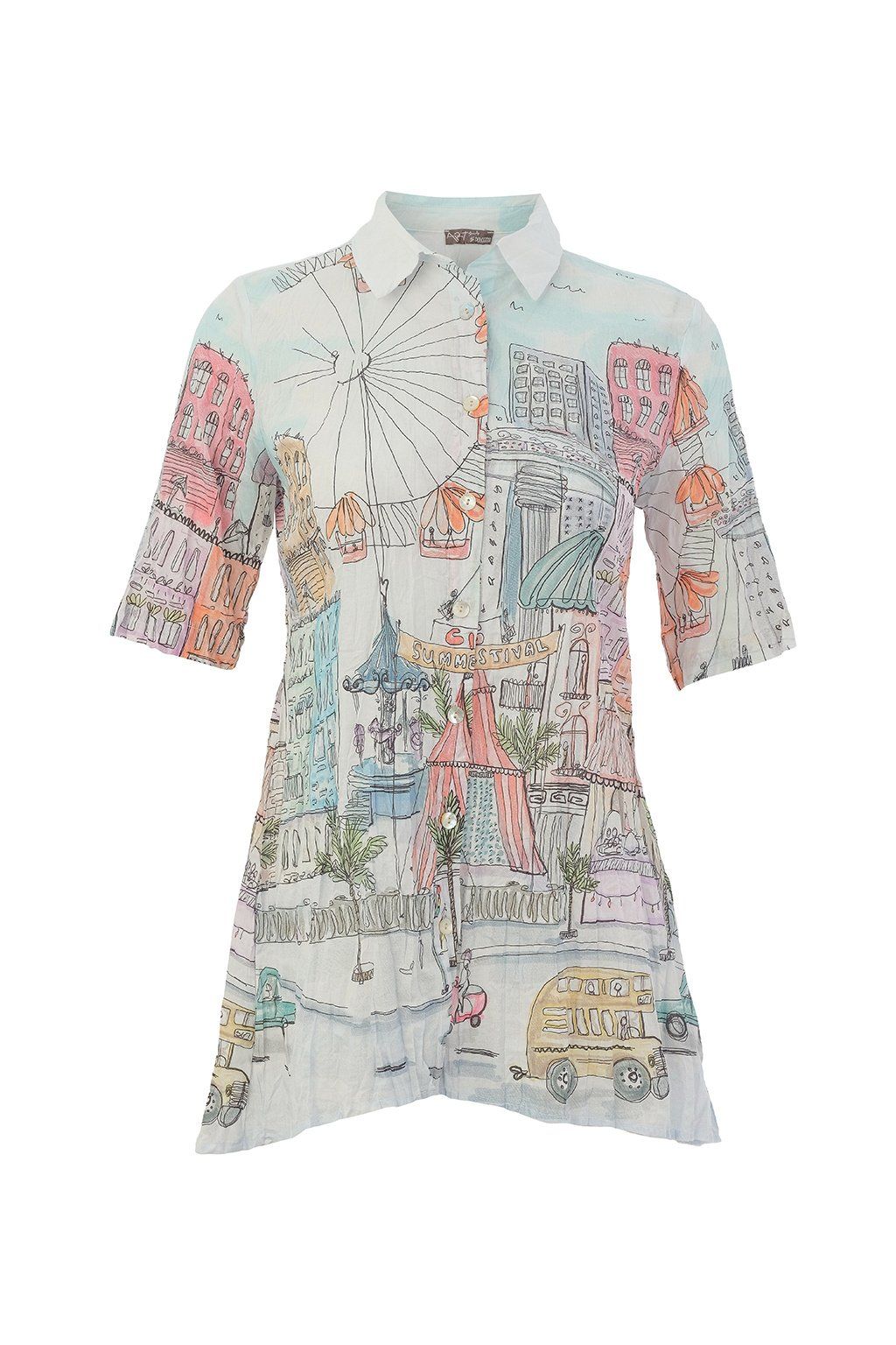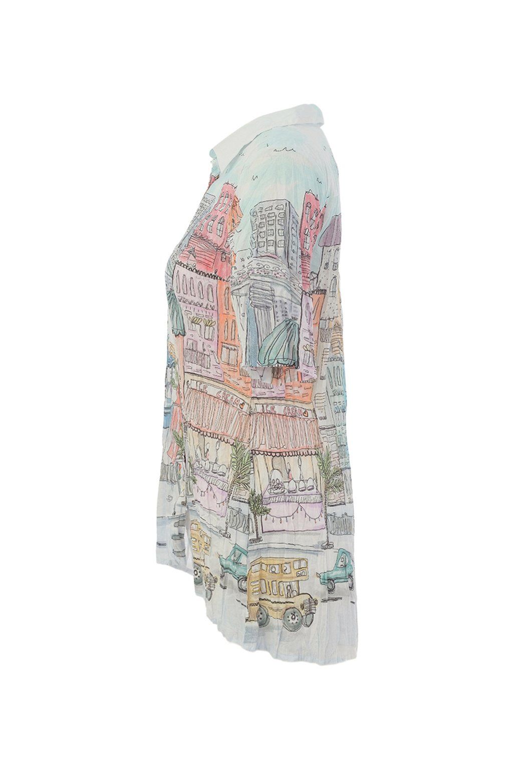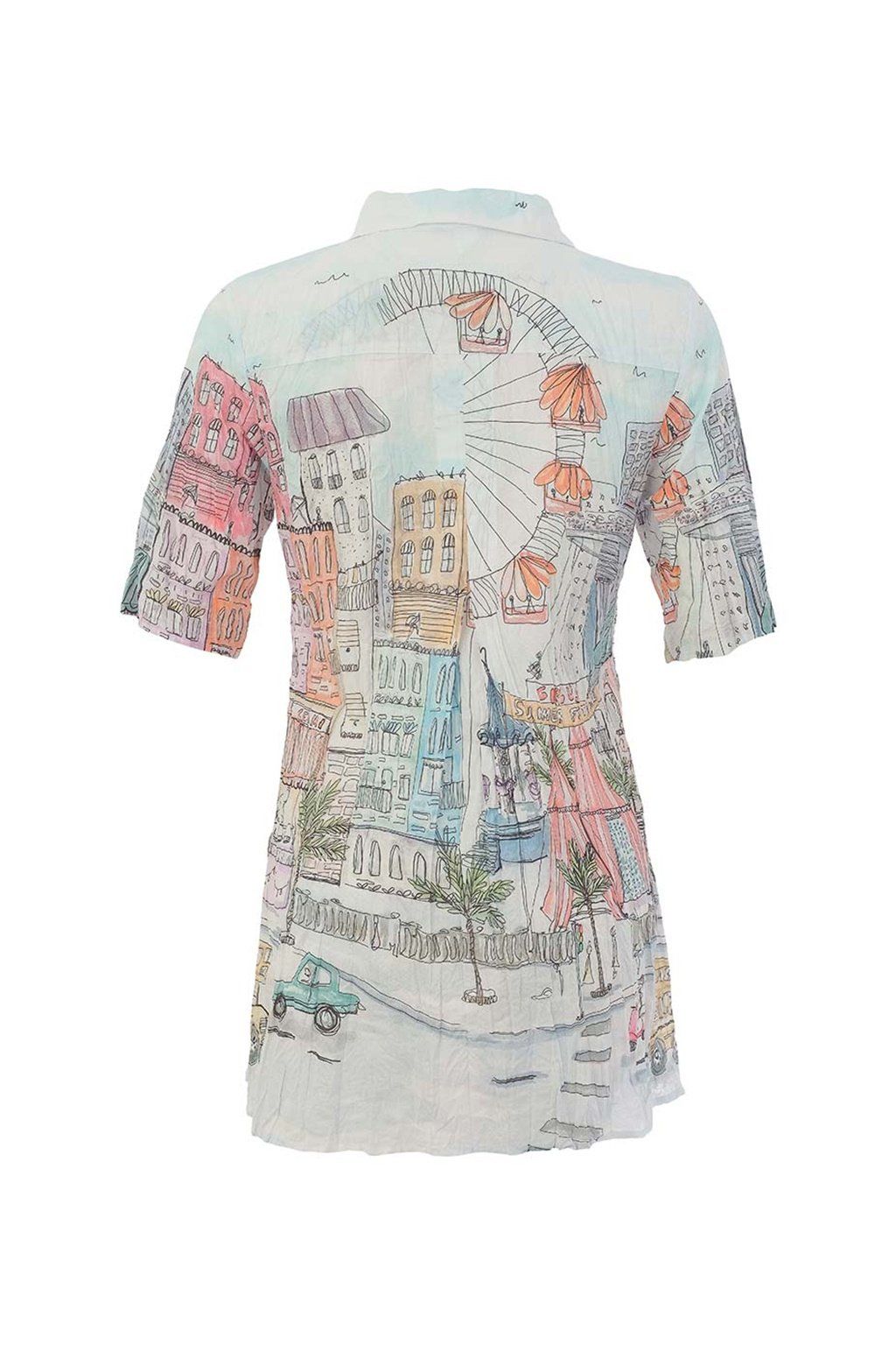 Dámska blúzka s originálnou ilustratívnou potlačou zaujme na prvý pohľad hravým a umeleckým vzhľadom. Jemné pastelové tóny v kombinácii s motívom mestskej scenérie dodávajú modelu svieži, nápaditý a veľmi ženský charakter. Košeľový golier, zapínanie na gombíky a kratšie rukávy podčiarkujú elegantný strih, ktorý sa príjemne nosí a ľahko kombinuje. Skvelá voľba k jednoduchým nohaviciam, džínsom aj sukni pre outfit, ktorý pôsobí štýlovo, ľahko a originálne.