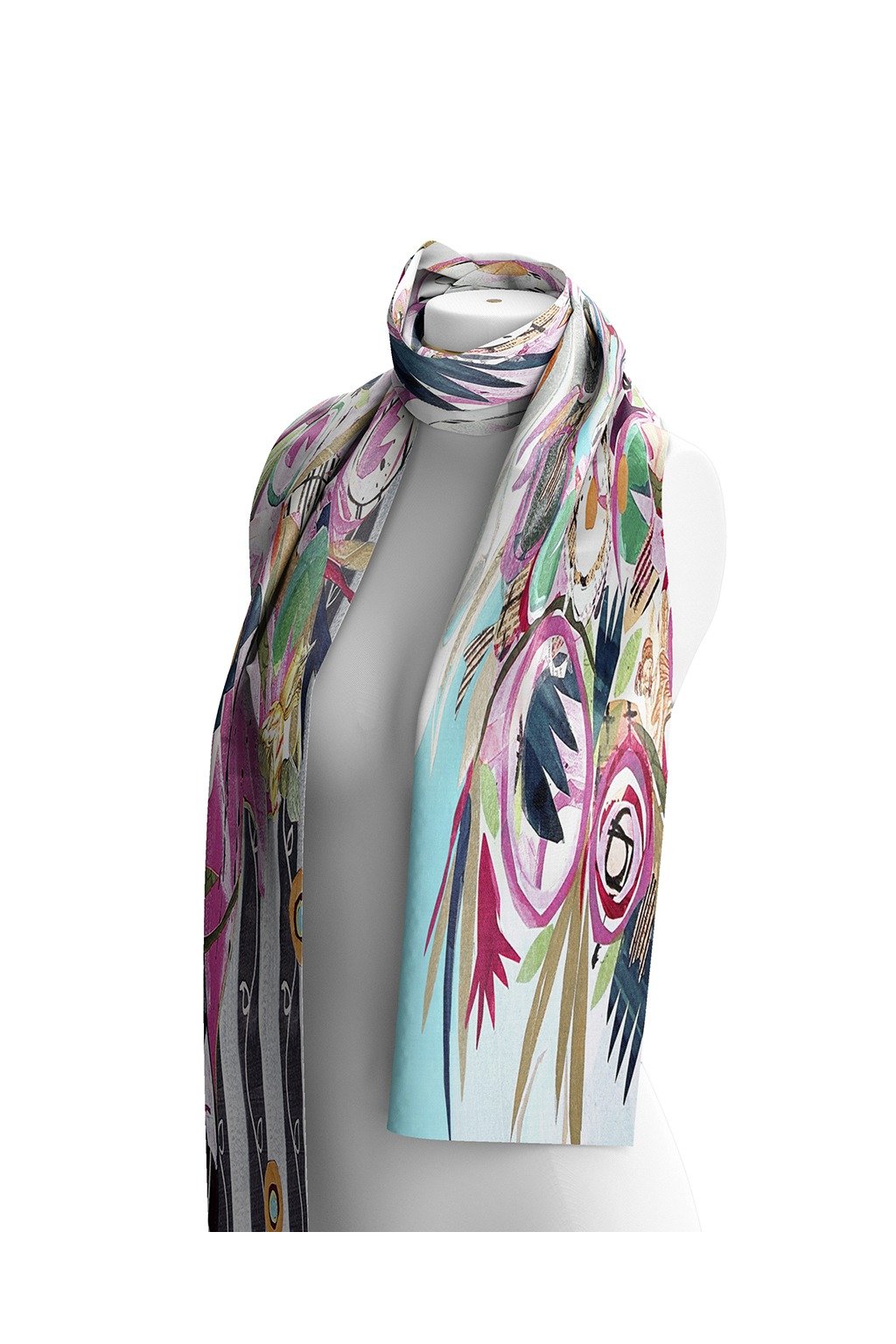 Dámska šatka s výrazným abstraktným vzorom v pestrej kombinácii ružovej, tyrkysovej, zelenej, béžovej a tmavo modrej je neprehliadnuteľným doplnkom, ktorý rozžiari každý outfit. Originálny motív pôsobí ako umelecké dielo a dodáva šatke moderný, sebavedomý charakter. Ľahký a príjemný materiál sa krásne splýva, ľahko sa viaže a poskytuje komfort pri celodennom nosení. Vďaka svojej farebnosti sa skvele hodí k jednoduchým jednofarebným kúskom, ktorým dodá energiu a štýl, a využijete ho ako do práce, tak na voľný čas či spoločenské príležitosti. Ideálna voľba pre ženy, ktoré milujú výrazné doplnky a chcú podčiarknuť svoju osobitosť.