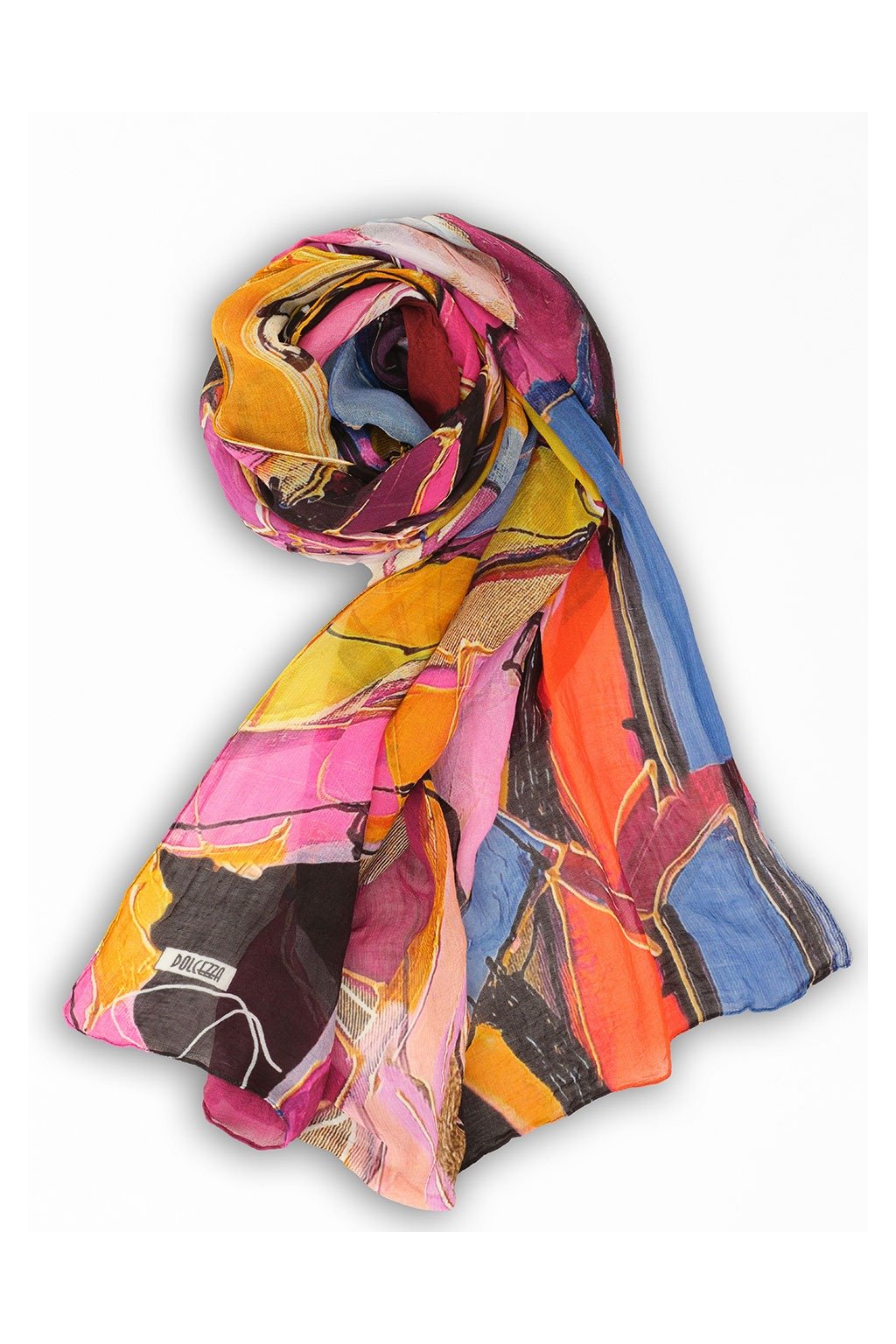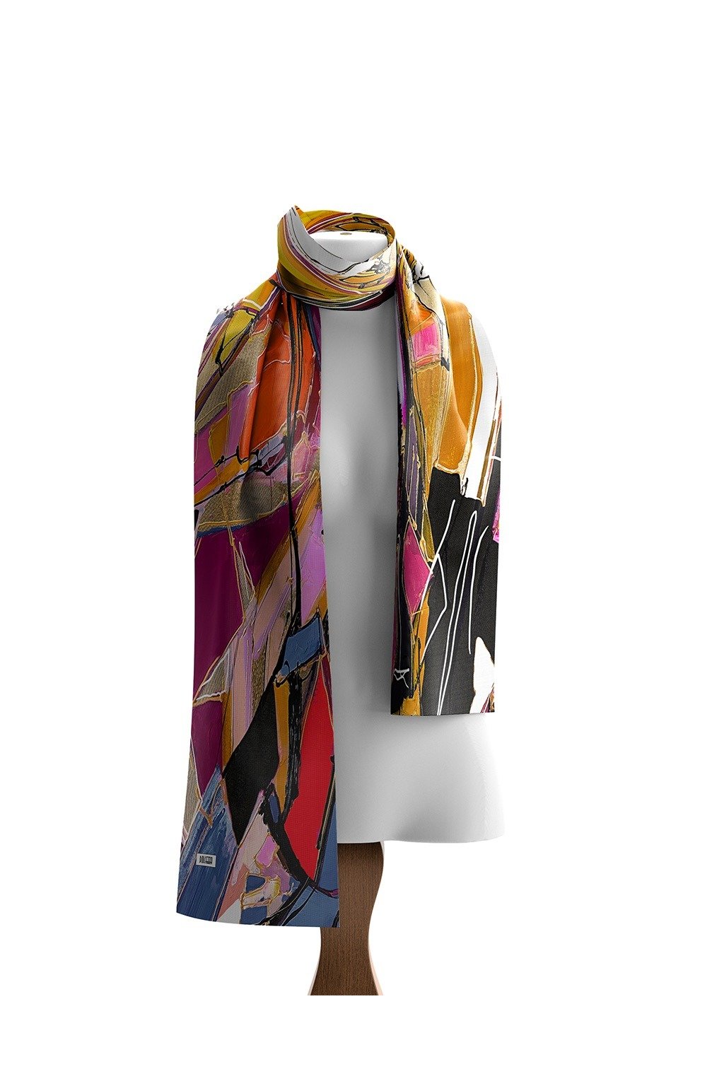 Elegantná šatka, ktorá na prvý pohľad zaujme svojim výrazným umeleckým dizajnom v kombinácii sýtych farieb – červenej, fialovej, ružovej i zlatej. Každý detail pôsobí ako maliarsky ťah štetcom, vďaka čomu sa zo šatky stáva originálny módny doplnok pre každú príležitosť. Vyrobený z ľahkej, jemnej tkaniny, ktorá je príjemná na dotyk a ľahko sa upravuje. Skvele doplní jednoduchý outfit a dodá mu nádych elegancie a individuality.