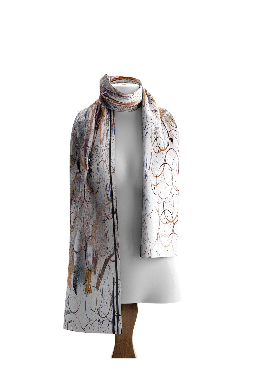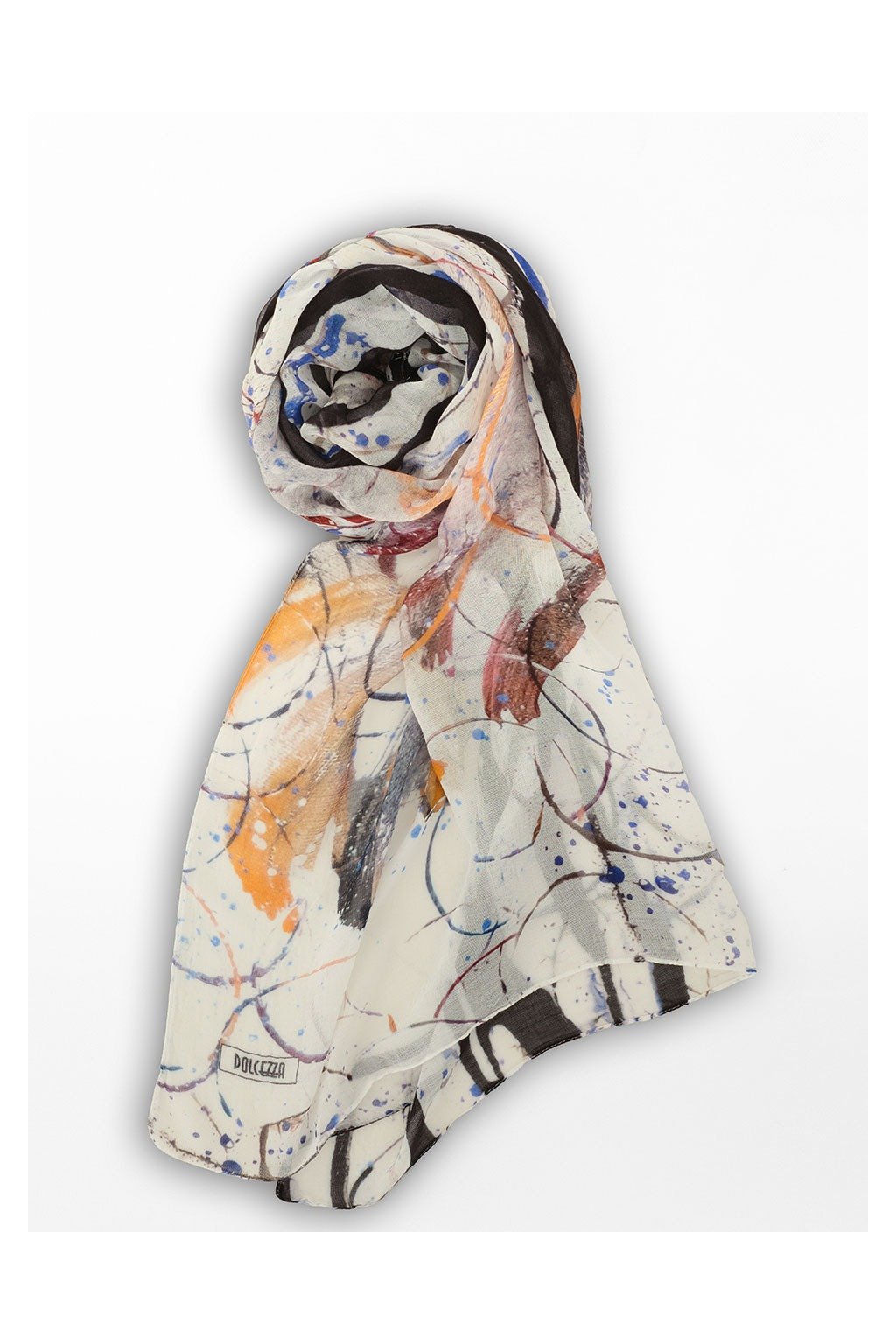 Táto elegantná šatka značky Dolcezza prináša jedinečný abstraktný motív v tónoch oranžovej, modrej, hnedej a čiernej na svetlom podklade. Vyrobený z jemného, priedušného materiálu, ktorý je príjemný na dotyk a krásne sa nosí po celý deň. Skvelý doplnok k akémukoľvek outfitu - dodá mu šmrnc aj eleganciu.