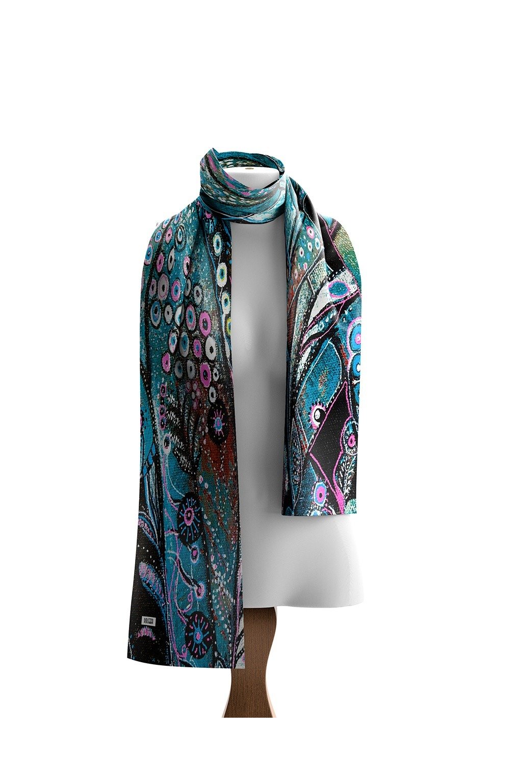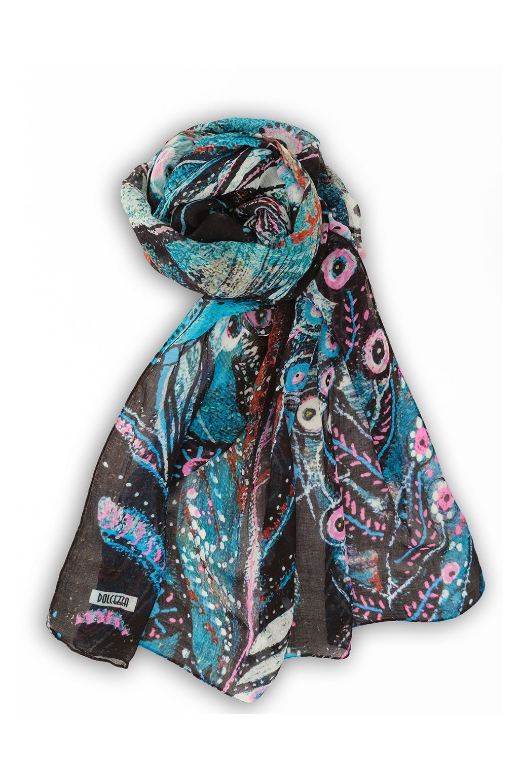 Originálna šatka, ktorá očarí výraznou umeleckou potlačou v odtieňoch tyrkysovej, čiernej, ružovej a bielej. Kombinácia živých farieb a abstraktného designu pripomína maliarske ťahy a dodá každému outfitu nádych kreativity a osobitého štýlu. Ľahký, priedušný materiál je príjemný na dotyk a ľahko sa upravuje – ideálny doplnok na každodenné nosenie aj špeciálne príležitosti.