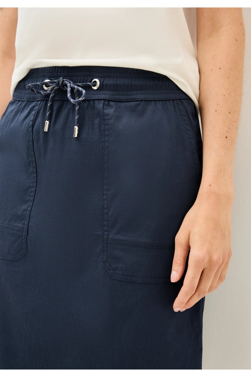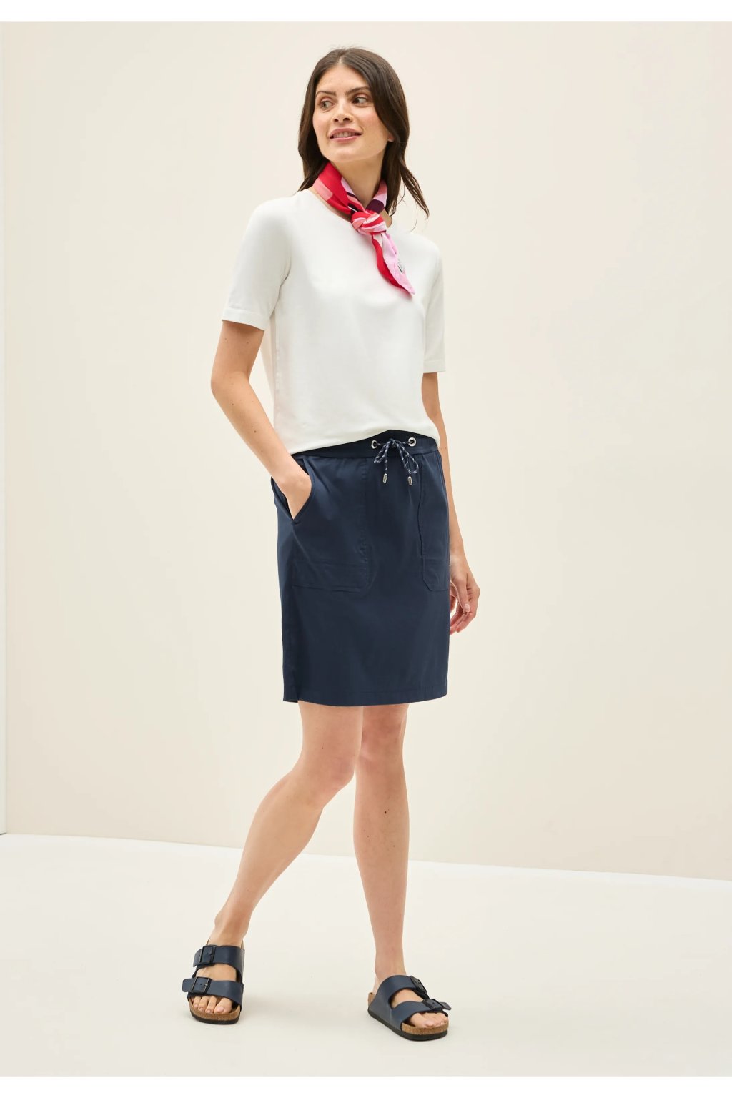 Letný favorit s jemným pruhovaným vzorom: Táto sukňa od CECIL pre ženy v dĺžke po kolená má elastický pás, sťahovaciu šnúrku a bočné vrecká. Zmes bavlny s pružným materiálom ponúka výnimočné pohodlie.