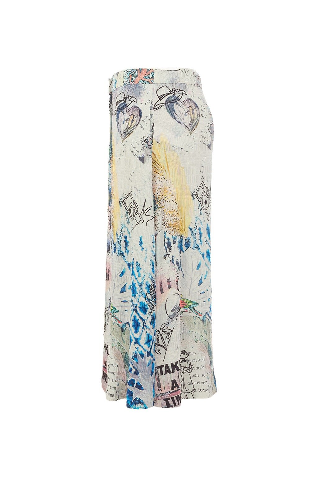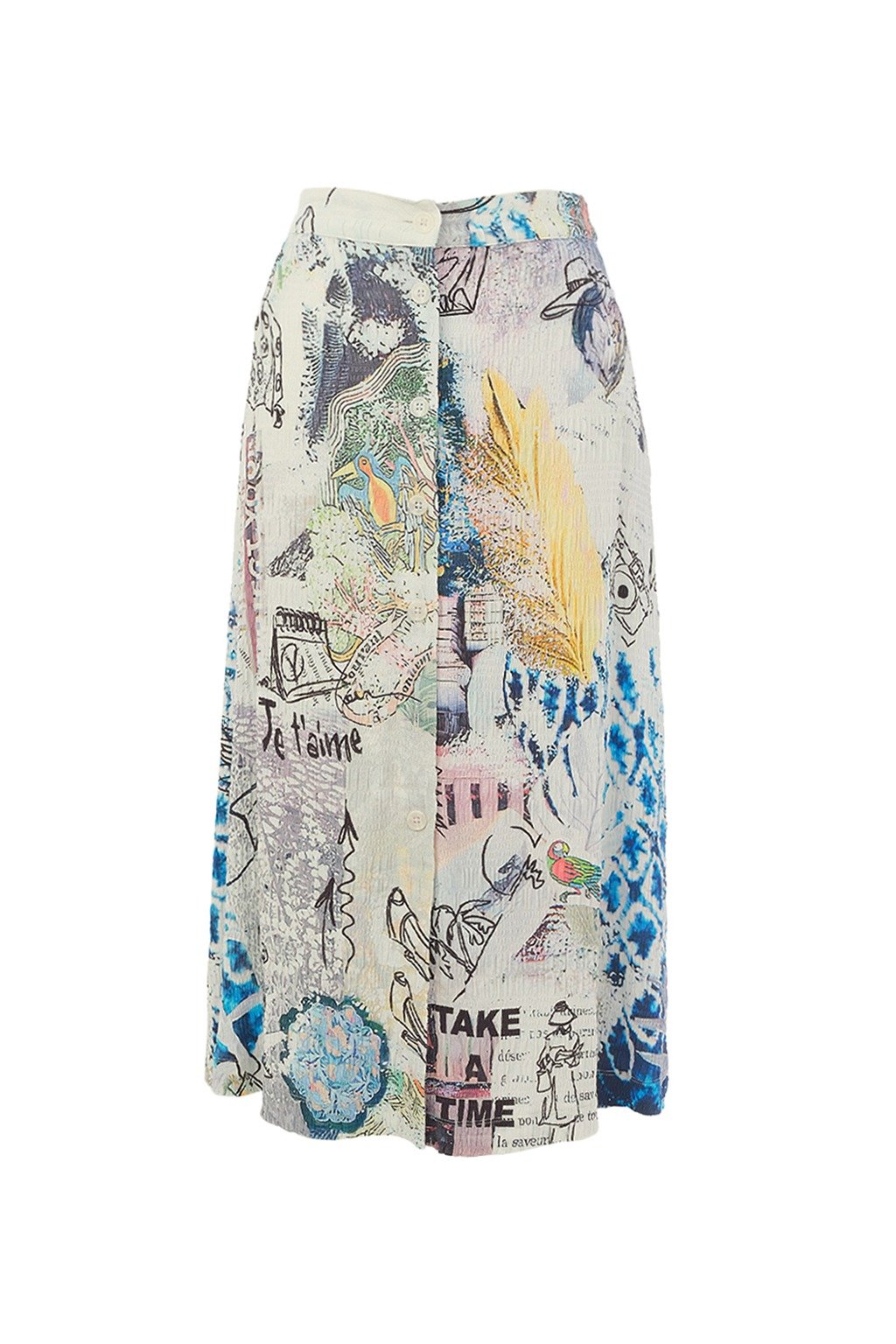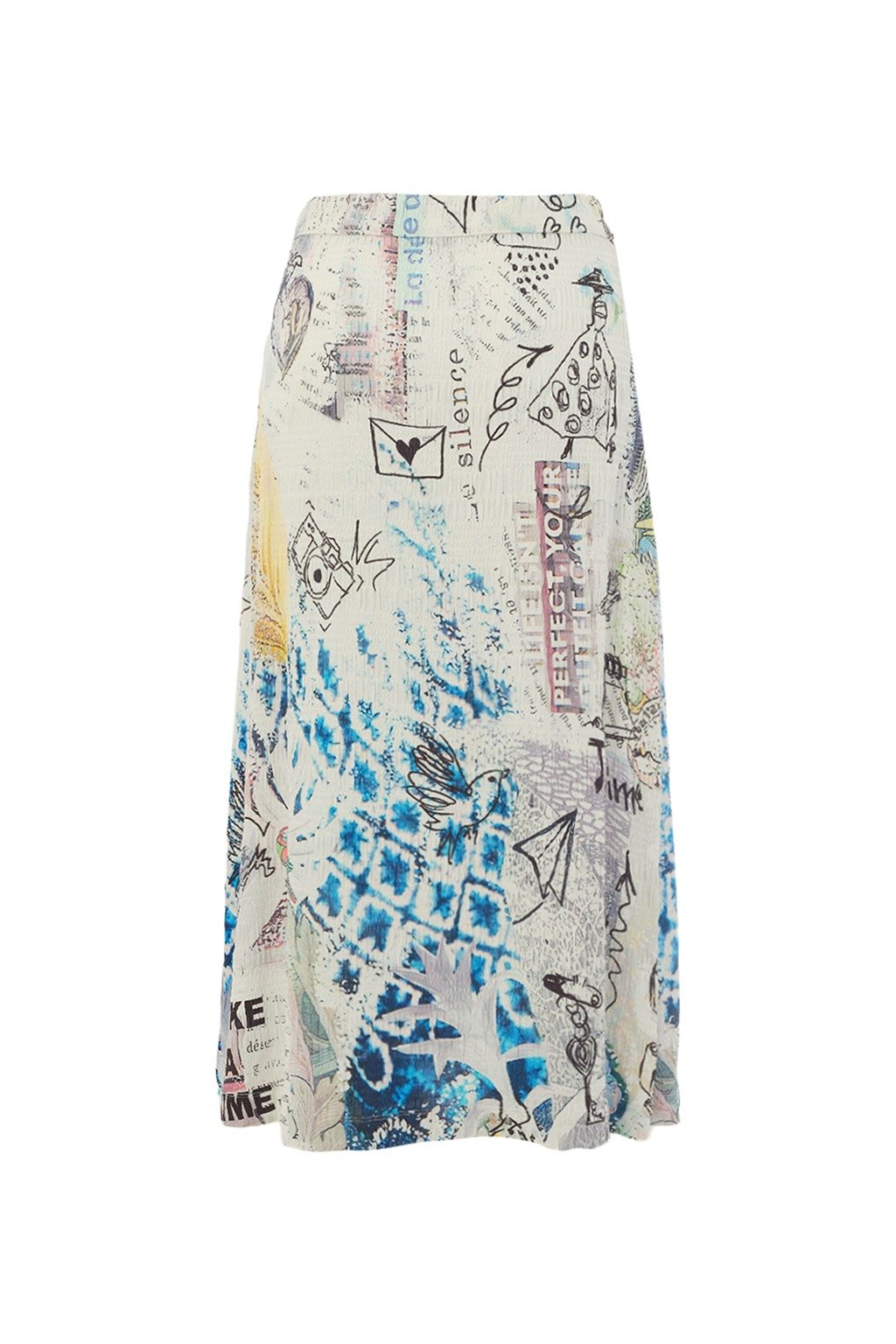 Štýlová dámska sukňa s originálnou umeleckou potlačou zaujme kombináciou kreslených motívov, typografie a abstraktných vzorov v jemných tónoch modrej, béžovej a čiernej. Splývavý strih spolu s pohodlným pásom zaisťuje príjemné nosenie a lichotivý vzhľad po celý deň. Sukňa je ideálna pre každodenné nosenie aj voľný čas, ľahko sa kombinuje s jednoduchým topom, blúzkou alebo ľahkým svetrom a dodá outfitu moderný, kreatívny charakter.