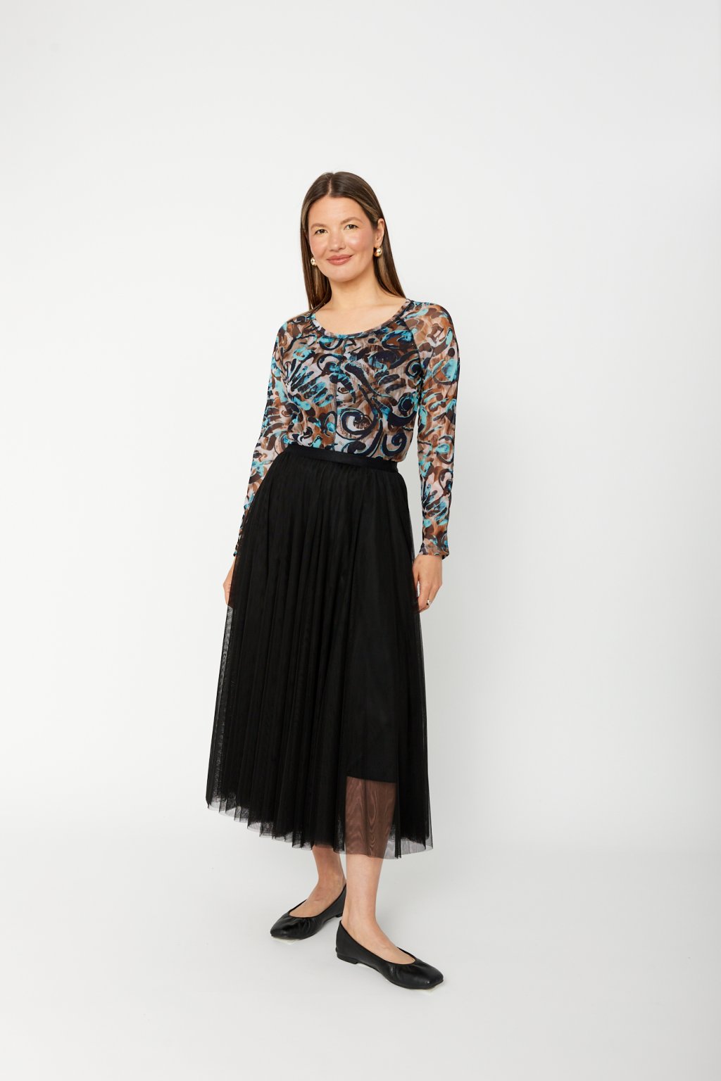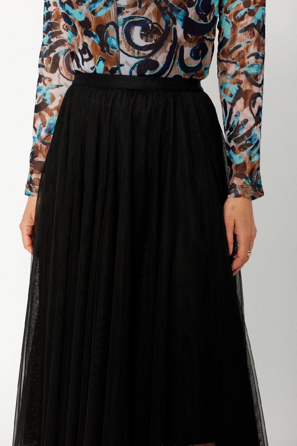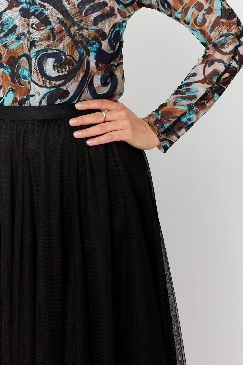 Objavte dokonalú kombináciu elegancie a pohodlia s touto midi sukňou Dolcezza. Táto sukňa s priehľadným prekrytím a plisovaným dizajnom bez námahy kombinuje ženský a ležérny štýl. Stredne zvýšený pás zaisťuje lichotivý strih, takže je všestranným doplnkom vášho šatníka. Táto sukňa je ideálna pre každú príležitosť a sľubuje, že svojou elegantnou a sofistikovanou príťažlivosťou pozdvihne vašu módnu hru.