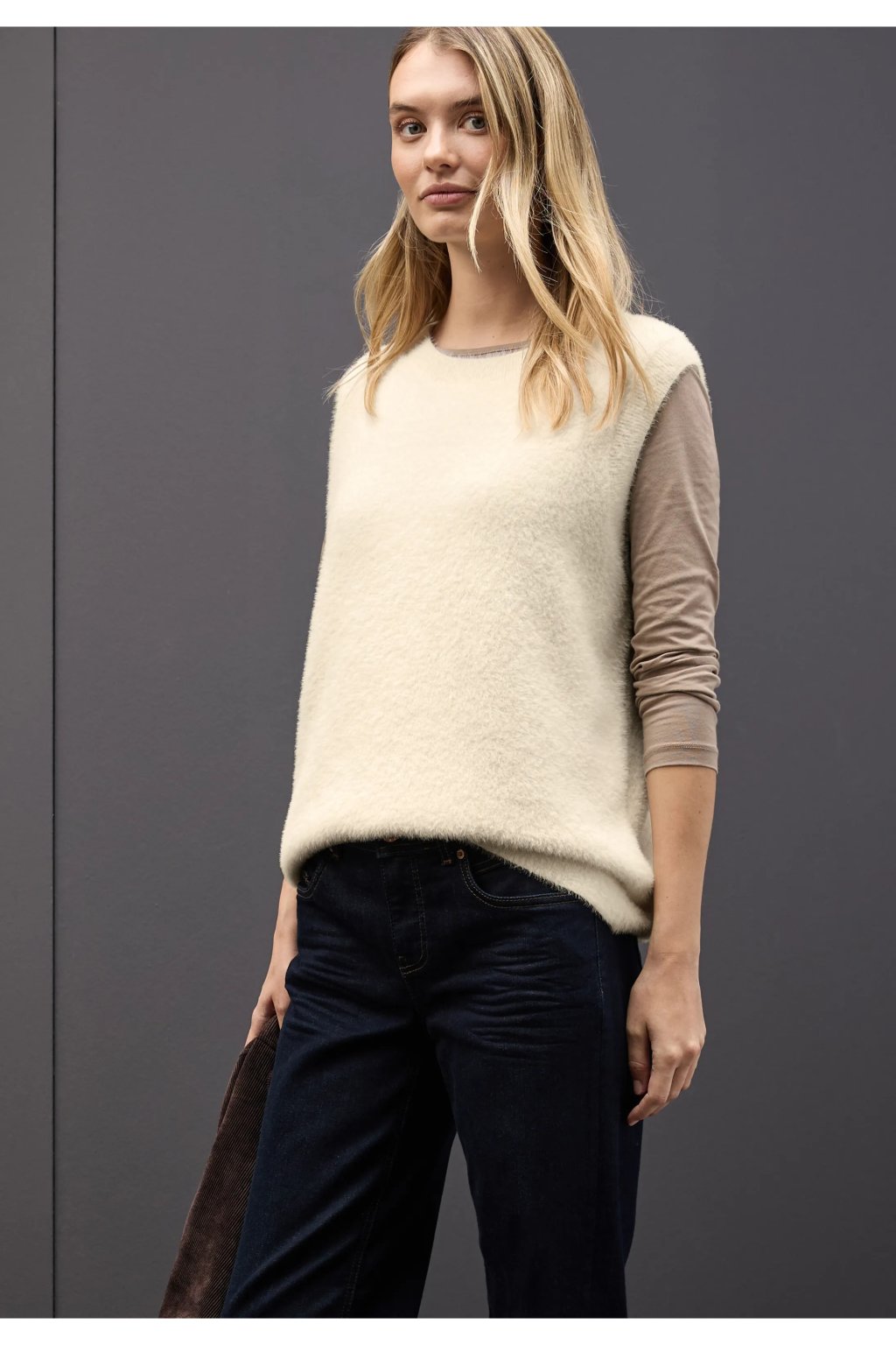 Tento sveter bez rukávov od Street One pre ženy je perfektným doplnkom vášho vrstveného outfitu. Mäkká páperová priadza zaisťuje výnimočne útulný pocit, zatiaľ čo okrúhly výstrih a jednofarebný dizajn ho robí dostatočne všestranným a je možné ho kombinovať s ďalšími kúskami oblečenia. Ideálne cez blúzky alebo košele s dlhým rukávom.