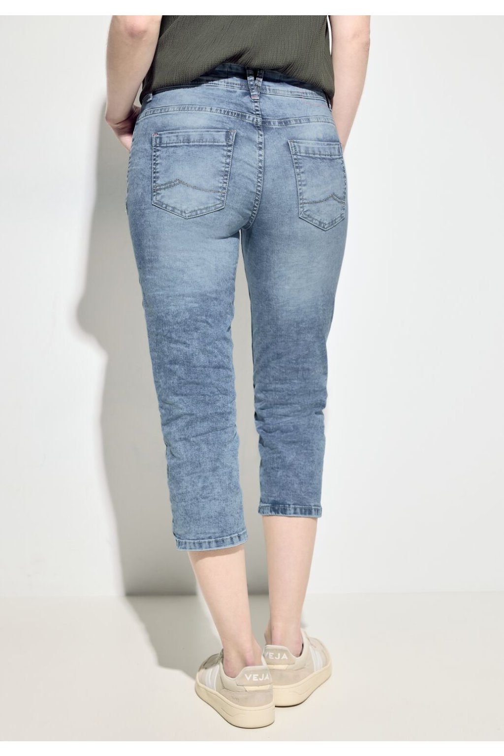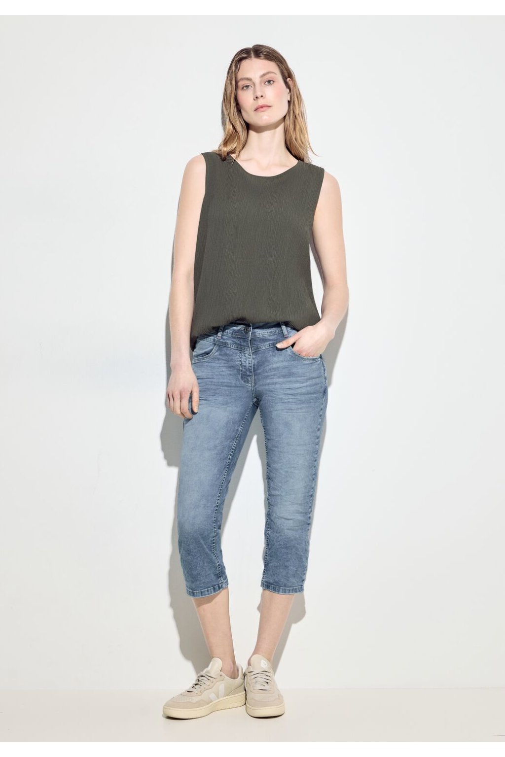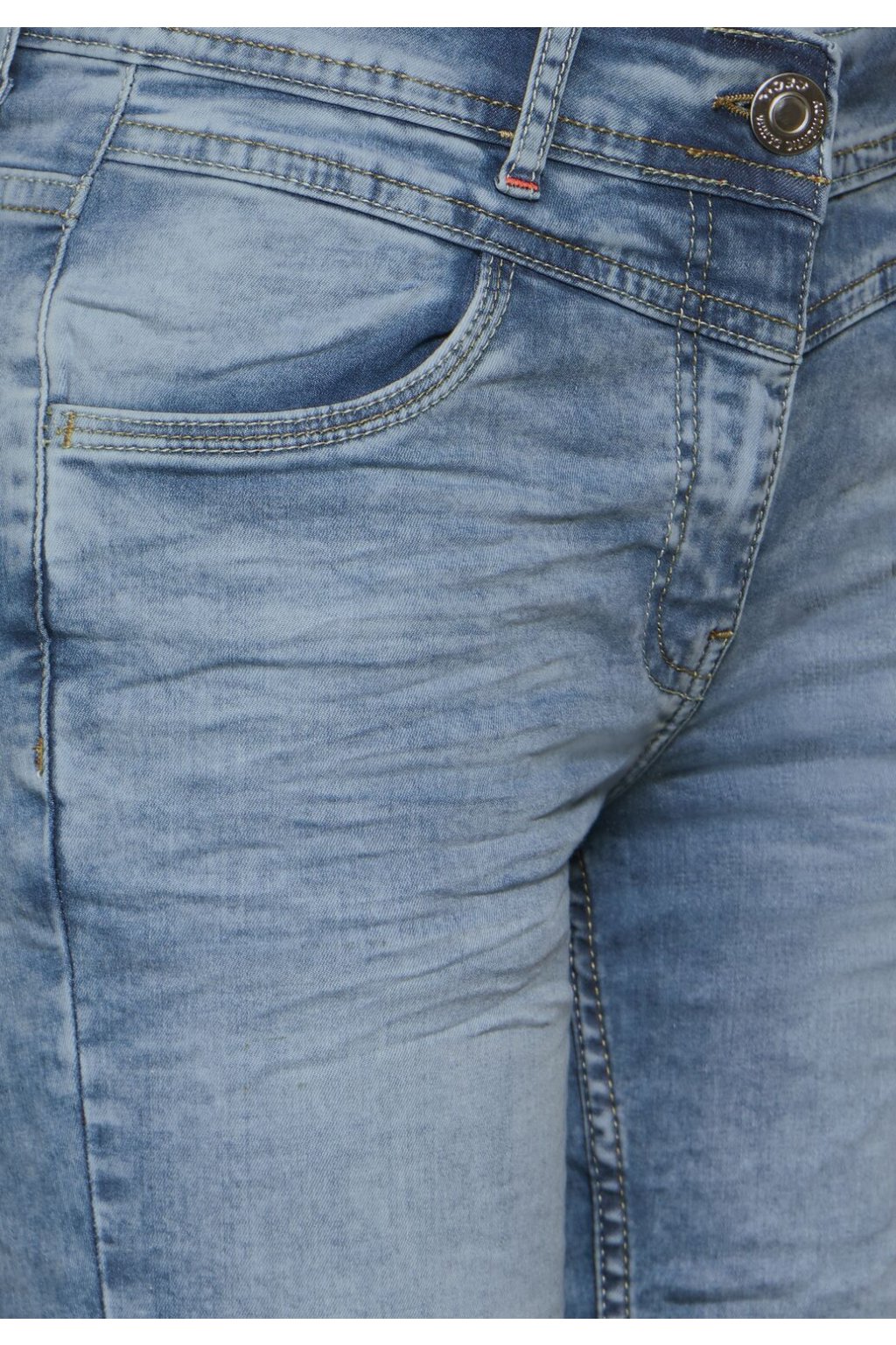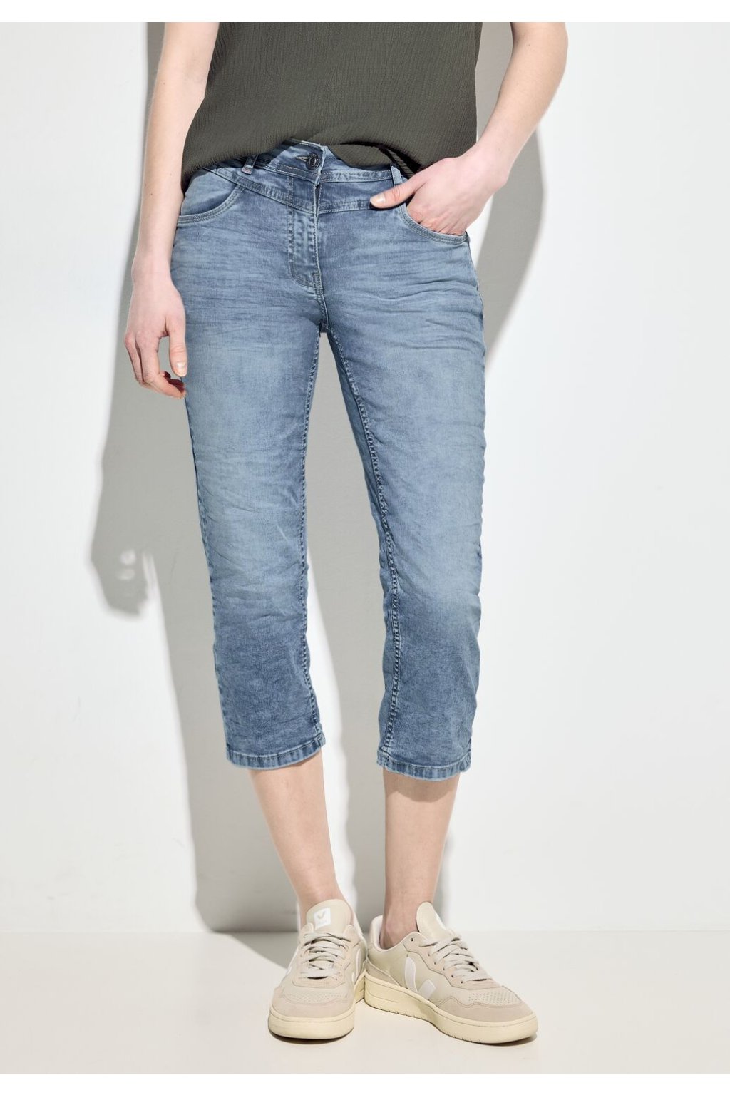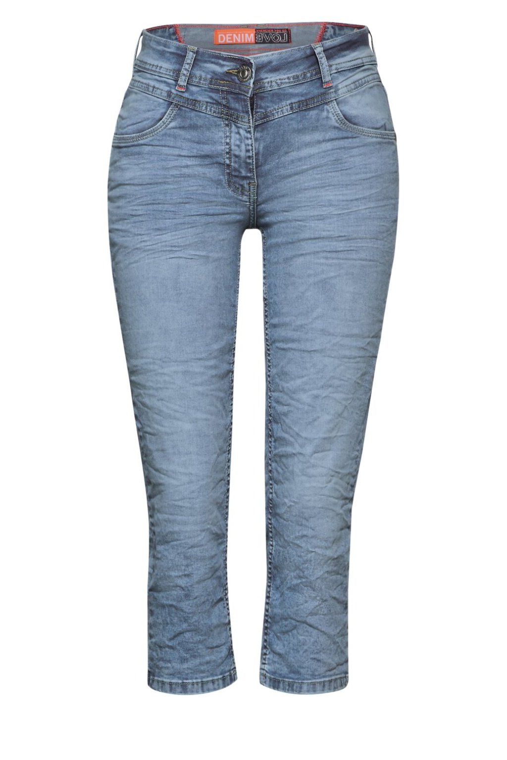Dámske 3/4 džínsy v štýle Scarlett značky CECIL sú krátke džínsy pohodlného ležérneho strihu a stredného pása, ktoré zaistia lichotivý strih. Vďaka štíhlym nohám ponúka modernú siluetu. Svetlomodré použité pranie mu dodáva ležérny vzhľad, zatiaľ čo vrásky pod vreckami poskytujú ďalšie detaily.
