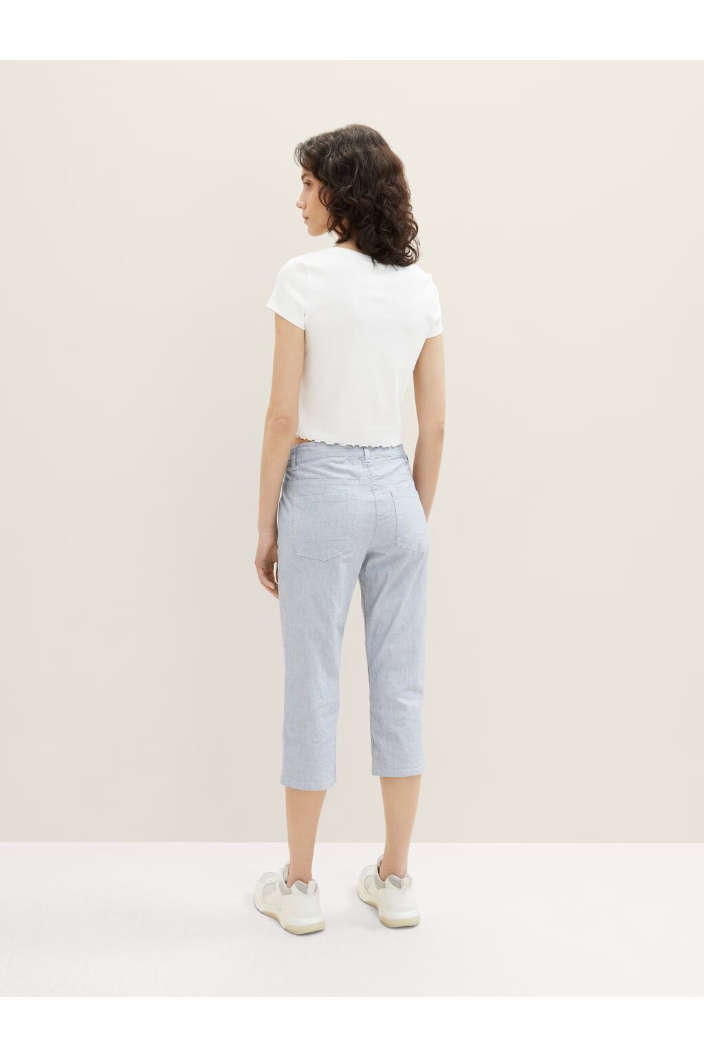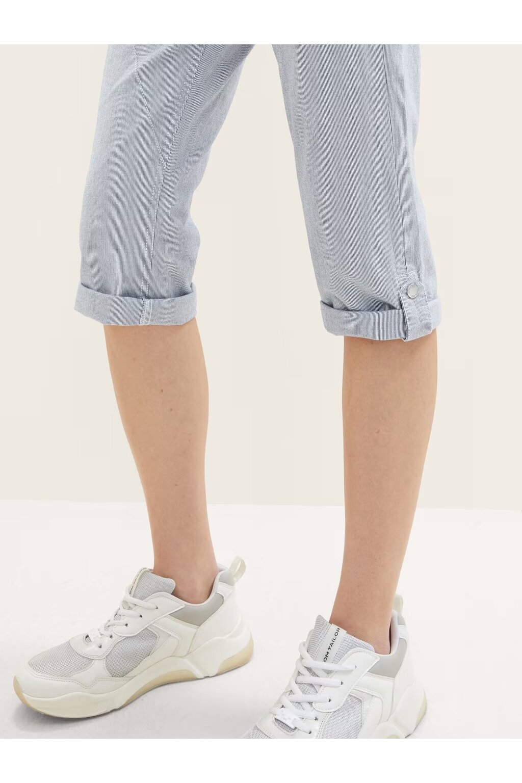 Dámske nohavice ležérneho strihu od Tom Tailor. Majú celoplošnú potlač jemných pruhov a efektné zapínanie na dva viditeľné gombíky. So stredným pásom a malým množstvom streča ich robí veľmi pohodlné. Zvláštnym vrcholom 3/4 nohavíc je lem s otočením, s ktorým je možné meniť dĺžku nohavíc.