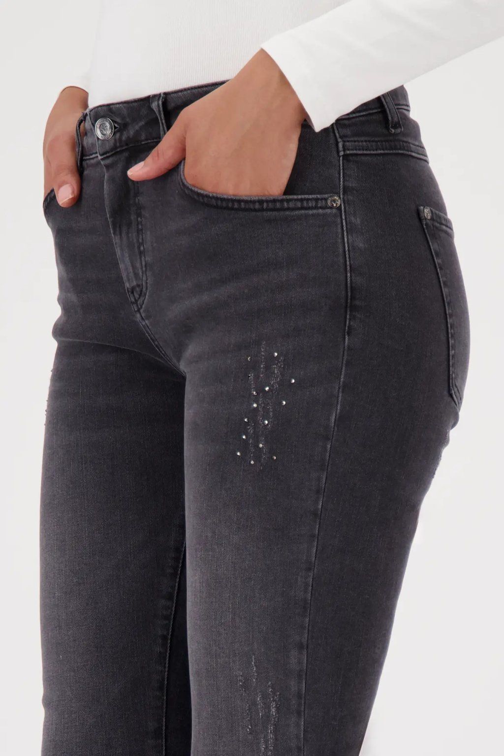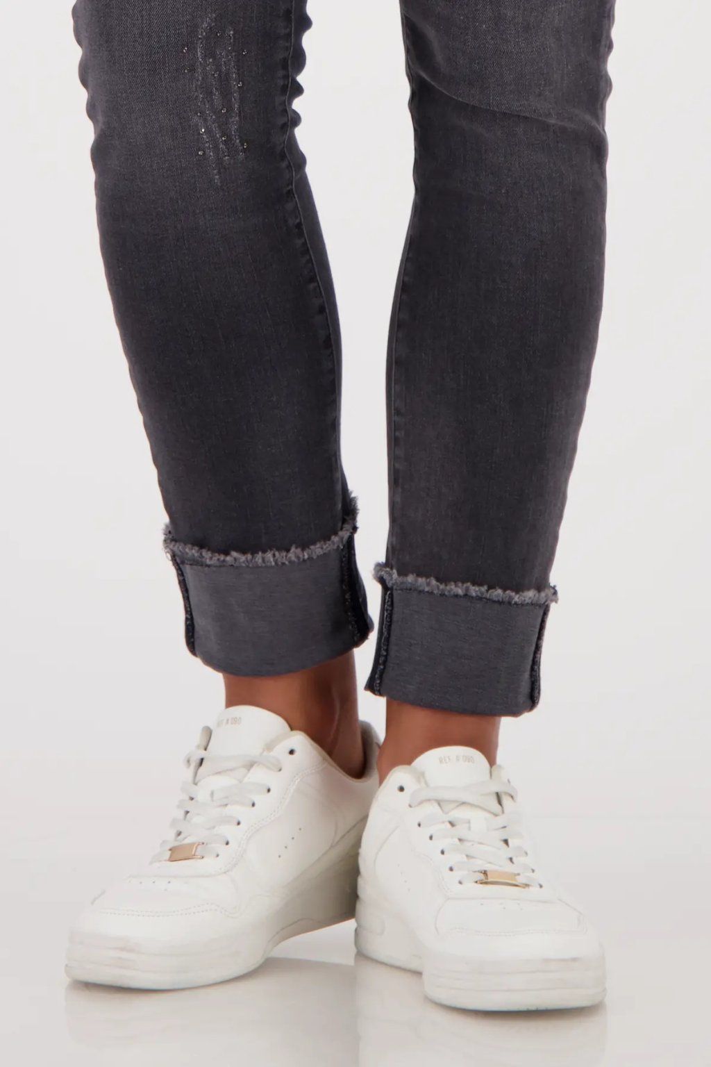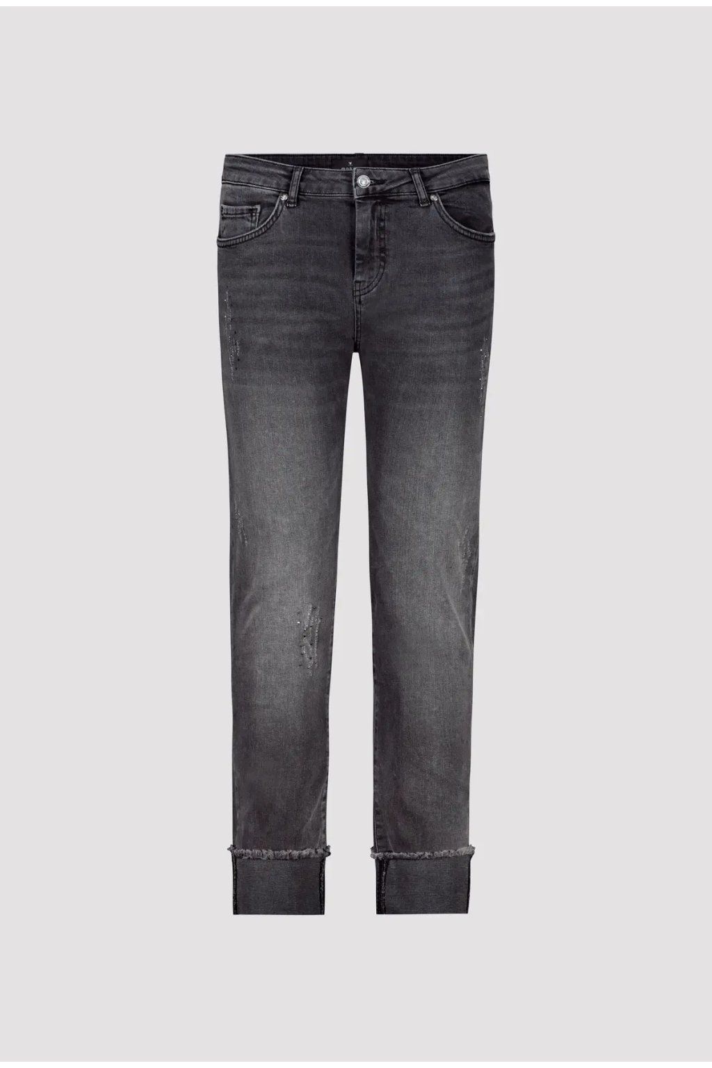 Dámske džínsy v tmavo šedom denimovom odtieni sú štýlovým základom šatníka na každodenné nosenie. Priliehavejší strih krásne zvýrazní postavu, zatiaľ čo vyhrnuté nohavice s jemne rozstrapkaným lemom dodávajú modelu moderný a ležérny vzhľad. Jemné vyšisovanie a decentné ozdobné detaily podčiarkujú ich módny charakter, vďaka ktorému džínsy ľahko skombinujete s tričkom, blúzkou i svetrom. Nadčasový a pohodlný kúsok do mesta, do práce aj na voľný čas.