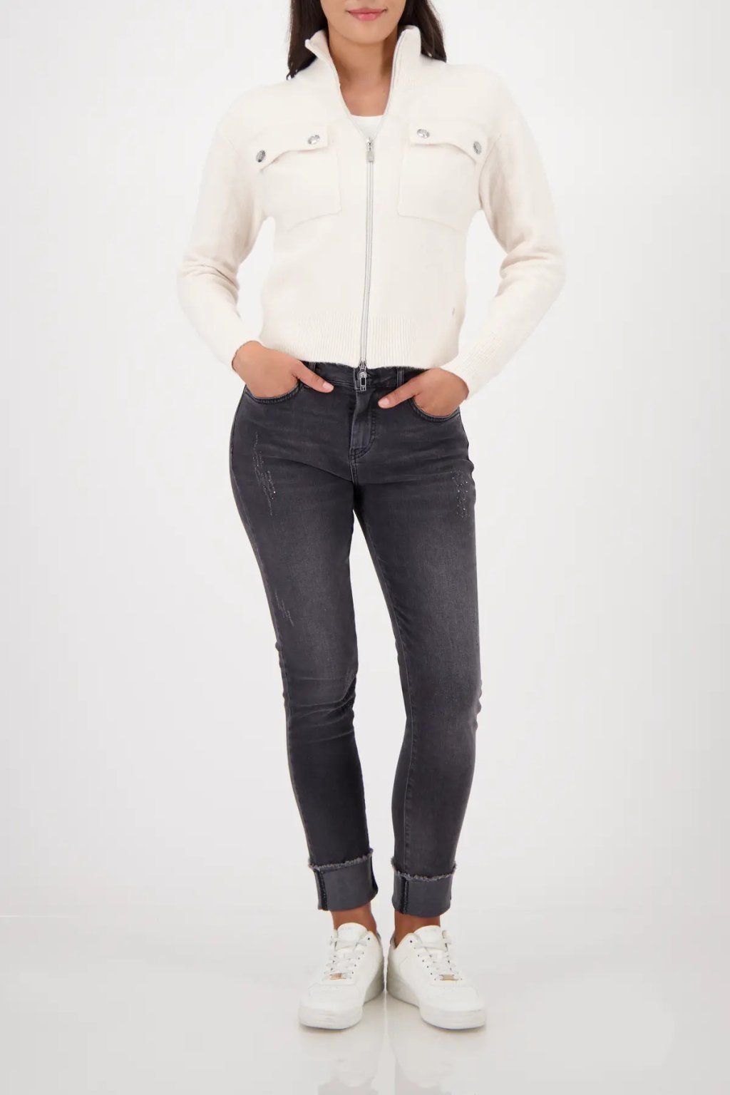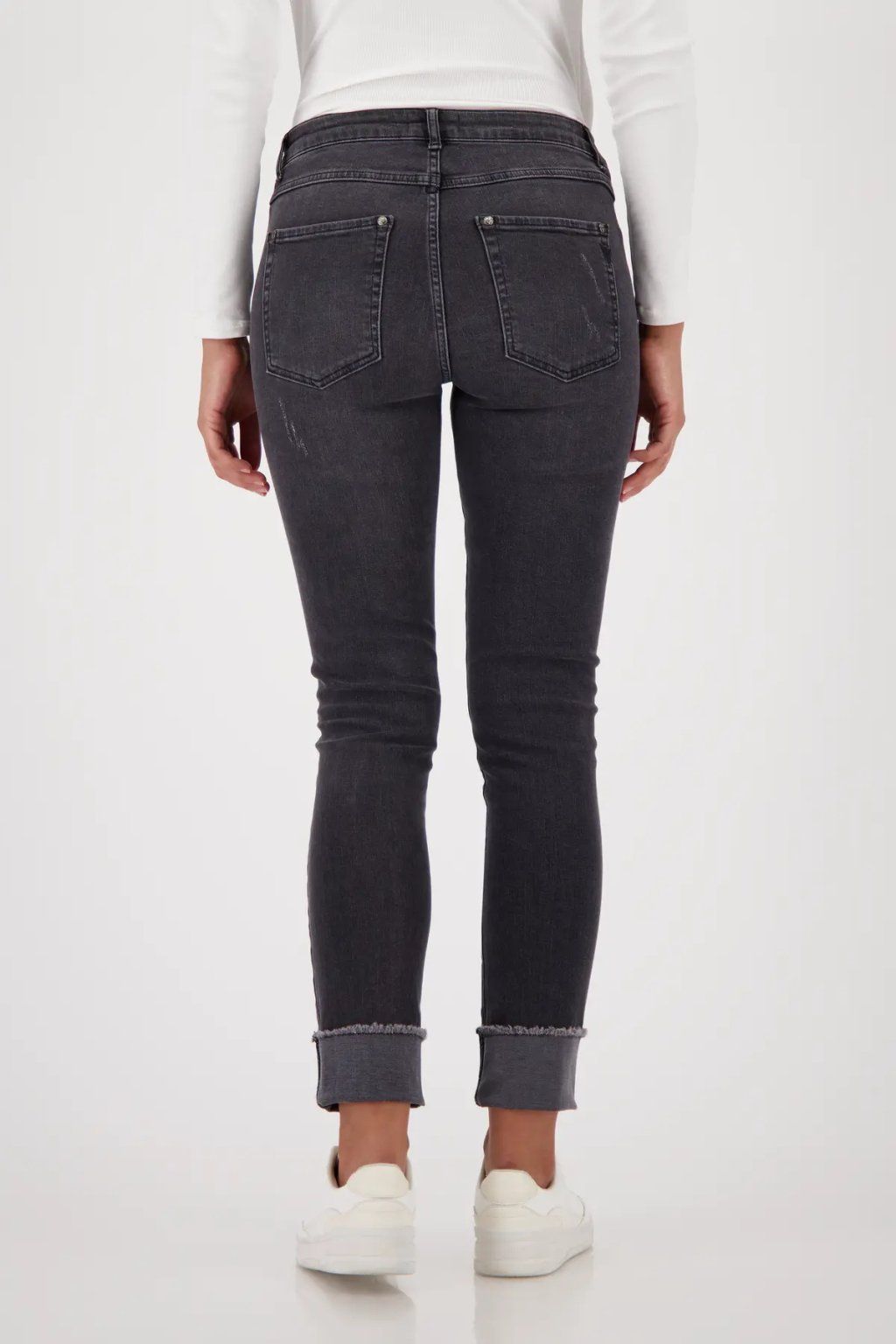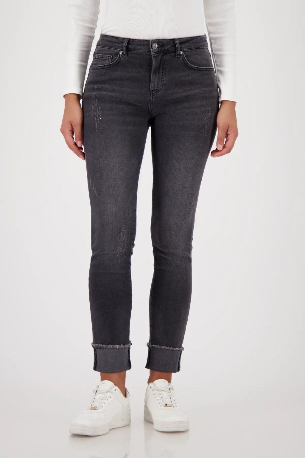Dámske džínsy v tmavo šedom denimovom odtieni sú štýlovým základom šatníka na každodenné nosenie. Priliehavejší strih krásne zvýrazní postavu, zatiaľ čo vyhrnuté nohavice s jemne rozstrapkaným lemom dodávajú modelu moderný a ležérny vzhľad. Jemné vyšisovanie a decentné ozdobné detaily podčiarkujú ich módny charakter, vďaka ktorému džínsy ľahko skombinujete s tričkom, blúzkou i svetrom. Nadčasový a pohodlný kúsok do mesta, do práce aj na voľný čas.