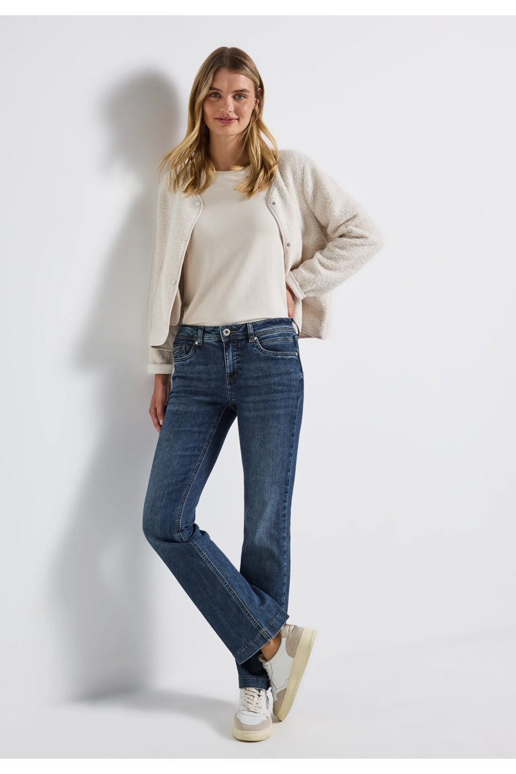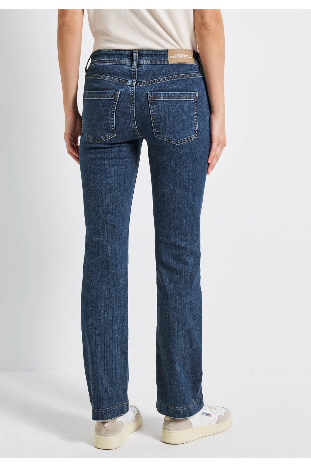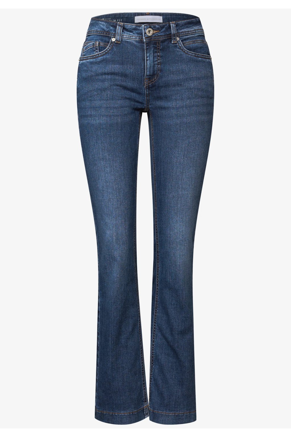 Tieto džínsy od značky Street One pre ženy kombinujú priliehavý slim strih s módnymi nohavicami s rozšírením pri členkoch. Modré pranie vytvára klasický džínsový vzhľad, zatiaľ čo zmes bavlny so strečom zaisťuje vysokú úroveň pohodlia. Stredne vysoký pás a 5 vreciek robia z týchto džínsov všestranný kúsok pre každodenný život.
