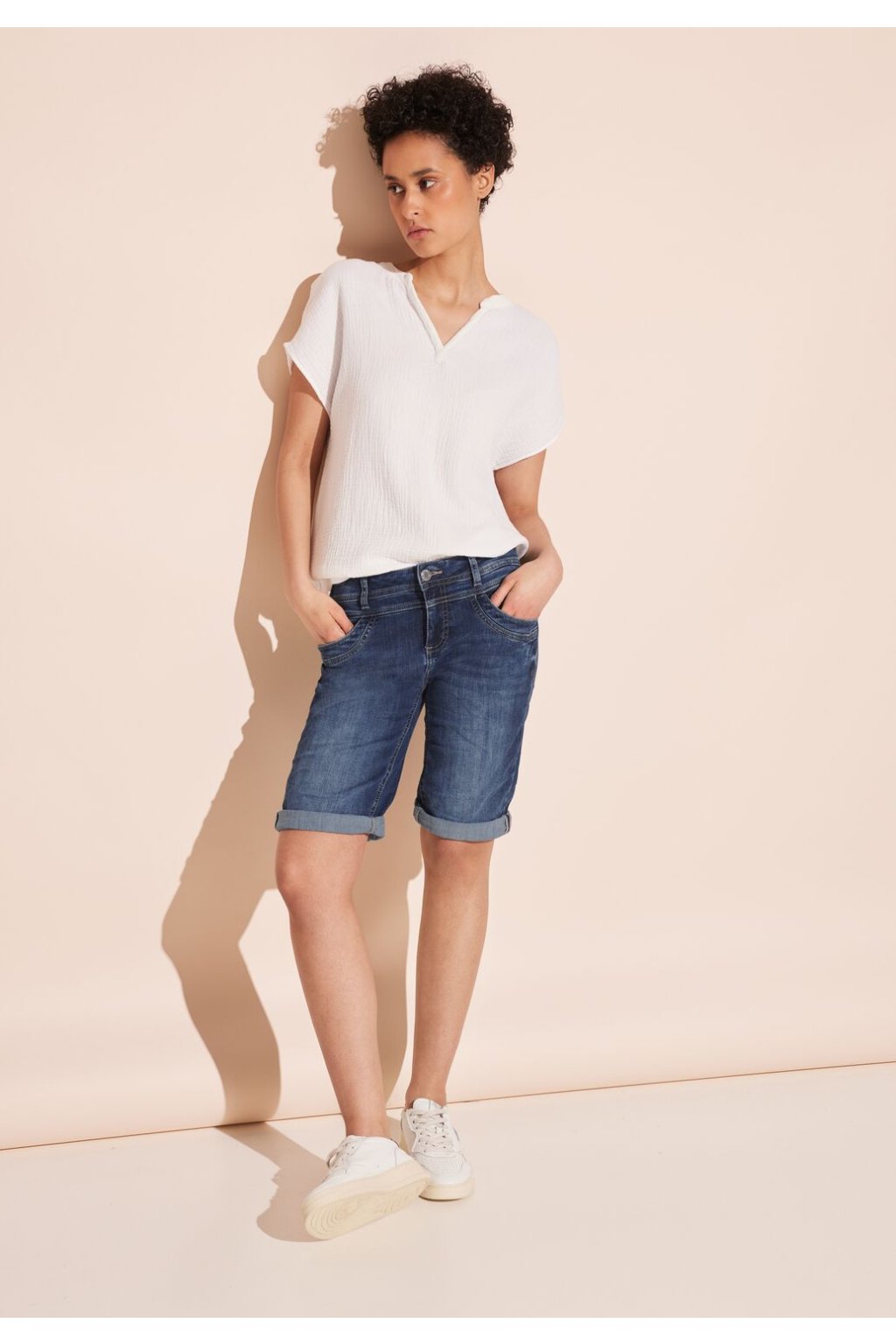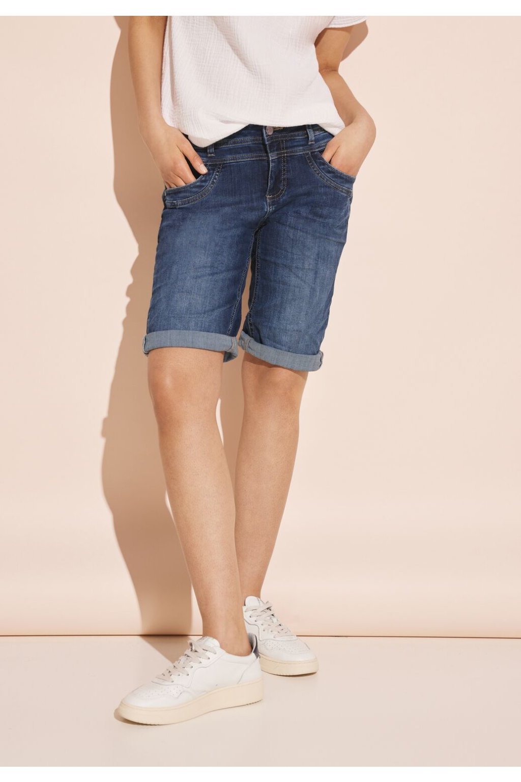 Bermudy v štýle Jane od Street One pre ženy sú prezentované ako šortky v ležérnom strihu s vyhrnutým lemom. Je vybavená praktickými vreckami na ruky a zadnými vreckami a ponúka štýl aj funkčnosť. Ozdobné švy na vreckách mu dodávajú ďalší akcent a podčiarkujú jeho ležérne kúzlo.