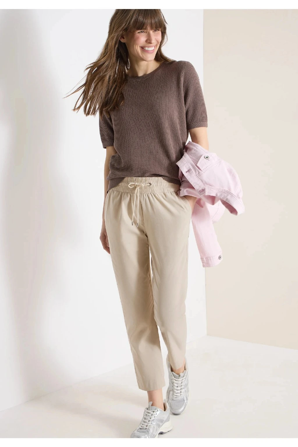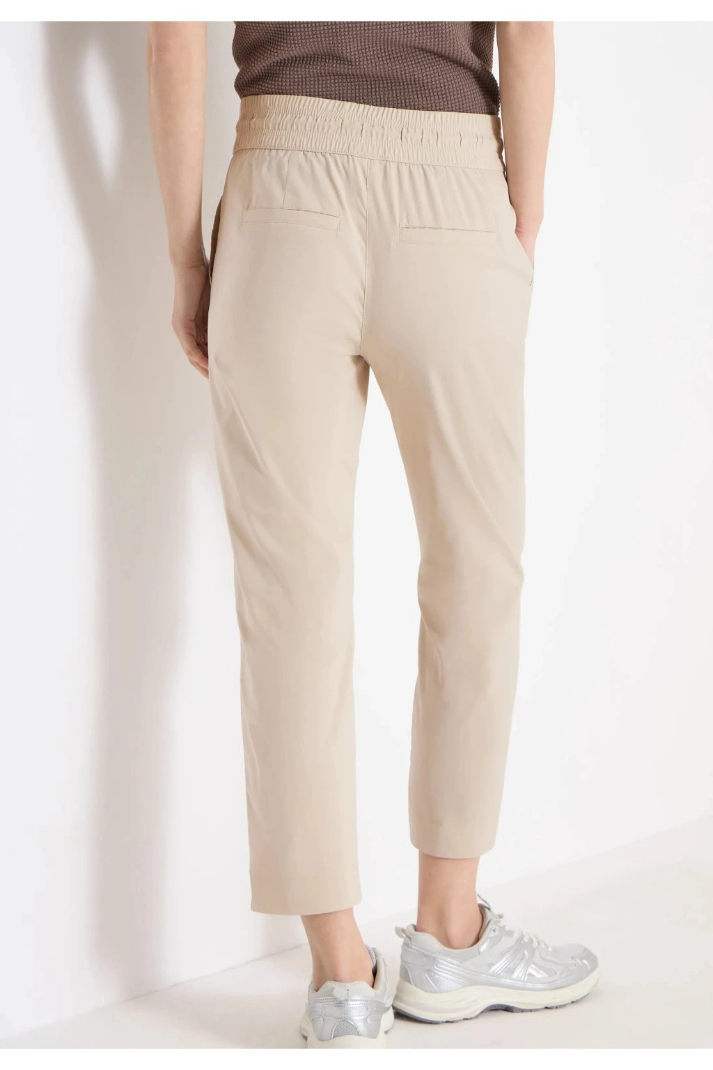 Štýlové dámske nohavice v modernom béžovom odtieni sú ideálnou voľbou pre pohodlný a zároveň elegantný každodenný outfit. Príjemný, ľahký materiál zaisťuje komfort pri nosení po celý deň a pružný pás so šnúrkou umožňuje perfektné prispôsobenie postave. Nohavice majú praktické vrecká a skrátenú dĺžku nohavíc, ktorá skvele vynikne v kombinácii s teniskami aj sandále. Ľahko ich zladíte so svetrom, tričkom aj košeľou a vytvoríte tak štýlový look pre voľný čas aj do mesta.