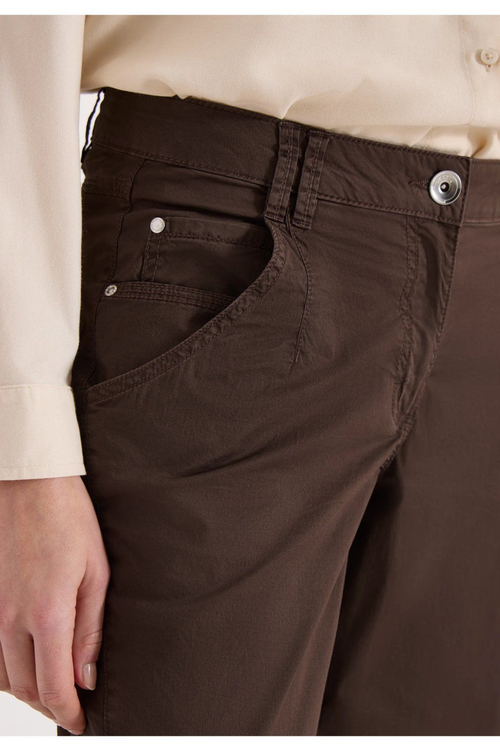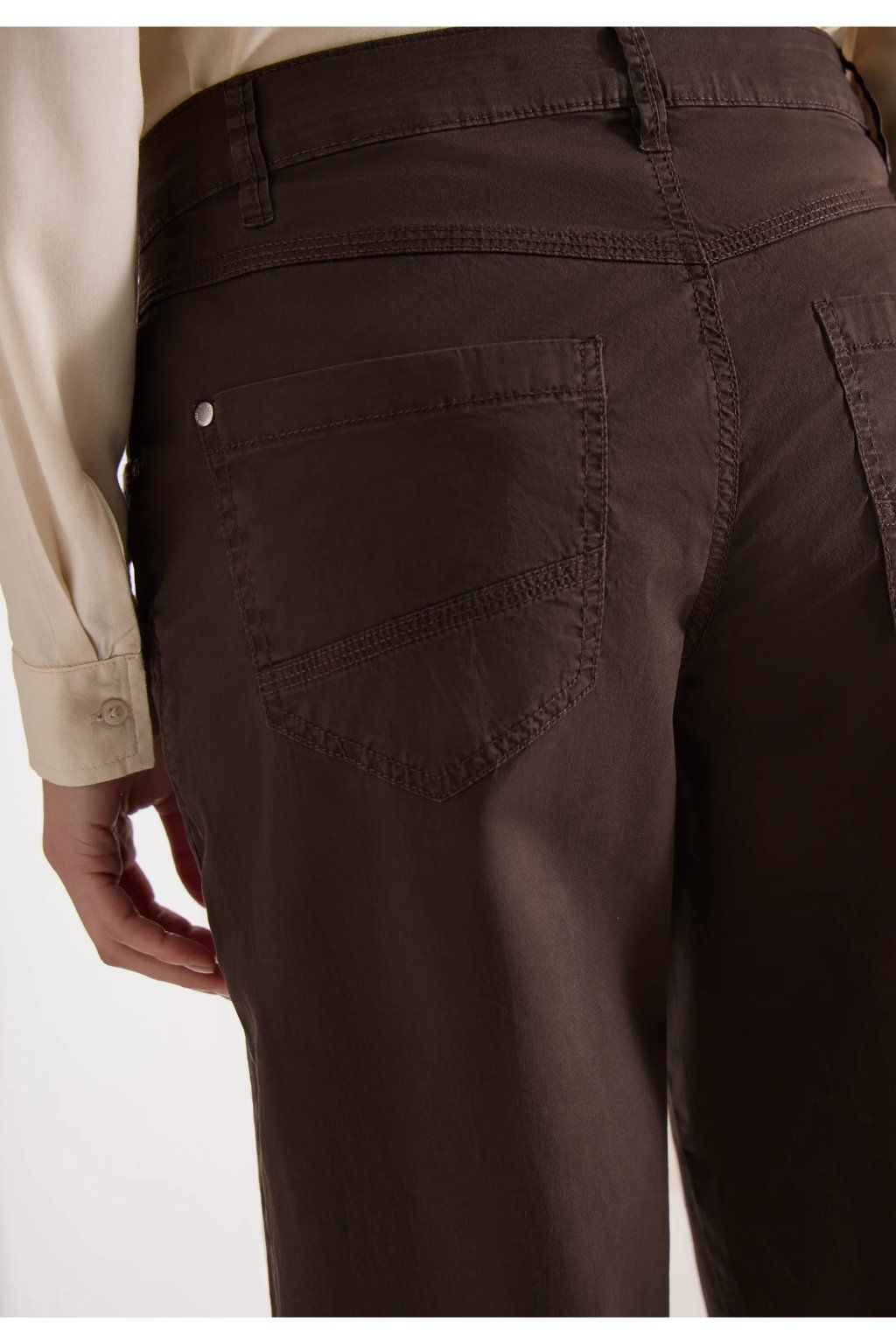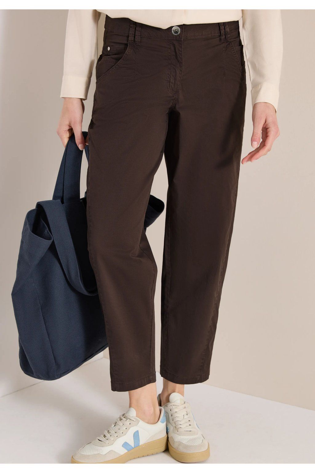 Dámske nohavice v elegantnom tmavo hnedom odtieni sú skvelou voľbou pre ženy, ktoré hľadajú pohodlný, univerzálny a zároveň štýlový kúsok do každodenného šatníka. Nohavice majú klasický strih s užšou, ľahko skrátenou nohavicou, ktorá pôsobí moderne a veľmi dobre sa kombinuje s teniskami, mokasínami aj členkovou obuvou. Jednoduchý dizajn dopĺňa klasické zapínanie na gombík a zips, pútka na opasok a praktické vrecká, ktoré podčiarkujú ich ležérne elegantný vzhľad.
