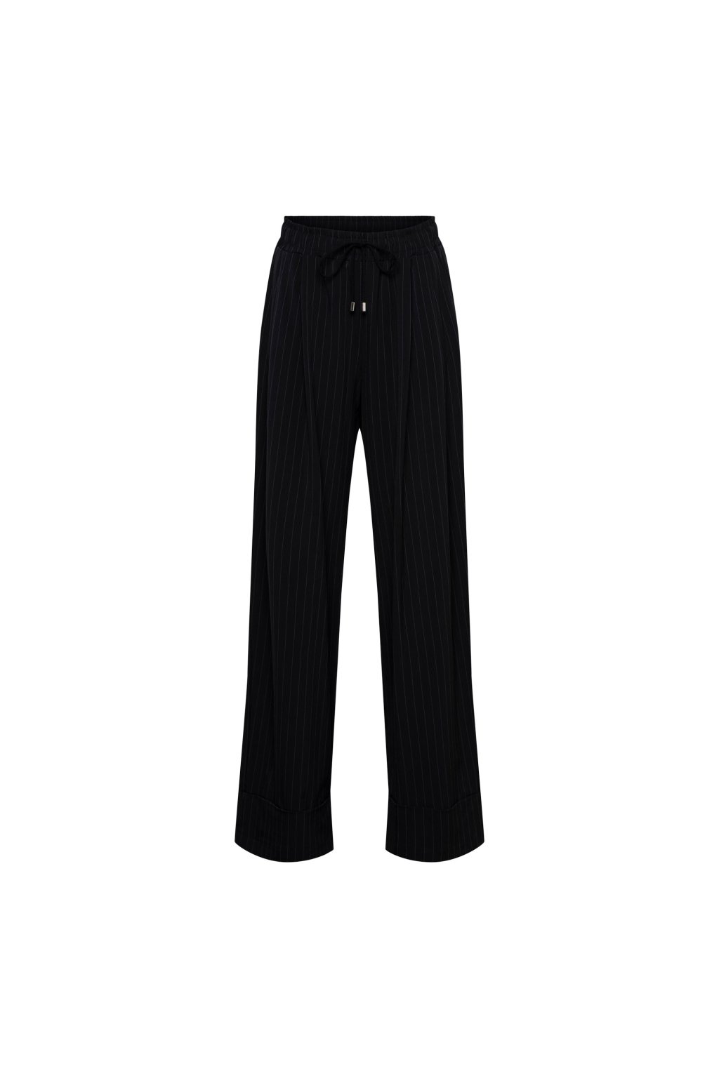 Tieto dámske nohavice sú vyrobené z praktického travel stripe materiálu, ktorý je pohodlný, nekrčí sa a skvele sa hodí na celodenné nosenie aj cestovanie. V páse majú elastickú gumu doplnenú o elegantnú mašľu z toho istého materiálu, vpredu praktické bočné vrecká a vzadu lištové vrecko. Rovný strih nohavíc s decentným falošným prekryvom dodáva nohaviciam moderný a upravený vzhľad. Vďaka kombinácii pohodlia a elegancie sa stanú univerzálnym kúskom do práce aj na voľný čas.