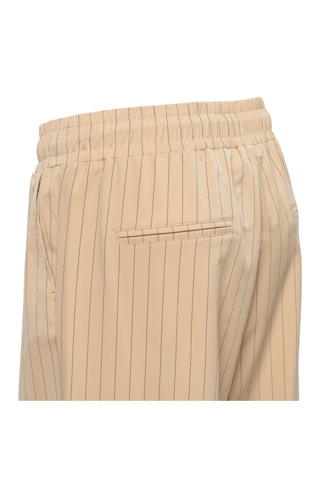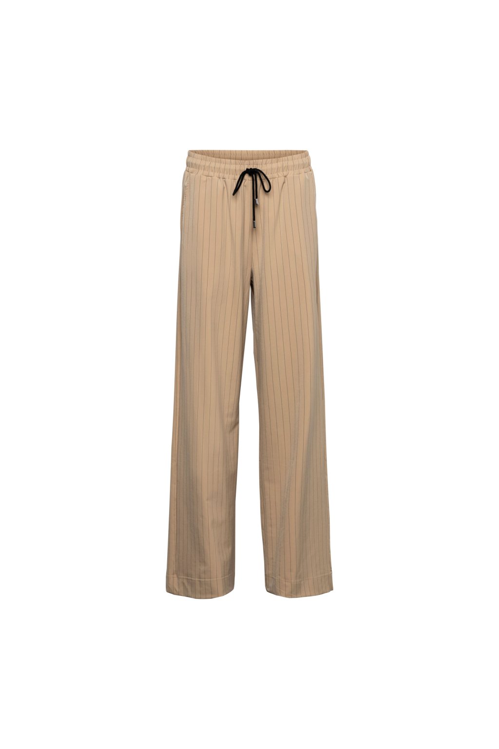 Elegantné nohavice sú vyrobené z kvalitného pruhovaného cestovného materiálu, ktorý je pohodlný, praktický a ideálny na každodenné nosenie aj cestovanie. Pás s pružnou gumou zaisťuje komfort, zatiaľ čo ozdobná mašľa z rovnakého materiálu v páse dodáva modelu ženský a štýlový akcent. Nohavice majú predné bočné vrecká a zadné výpustkové vrecko. Rovný strih nohavíc vytvára nadčasovú siluetu a umožňuje ľahké kombinovanie s rôznymi typmi vrškov.