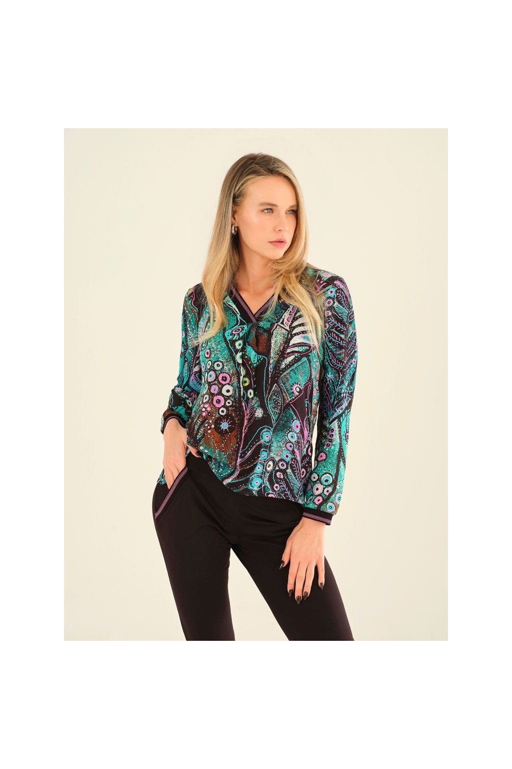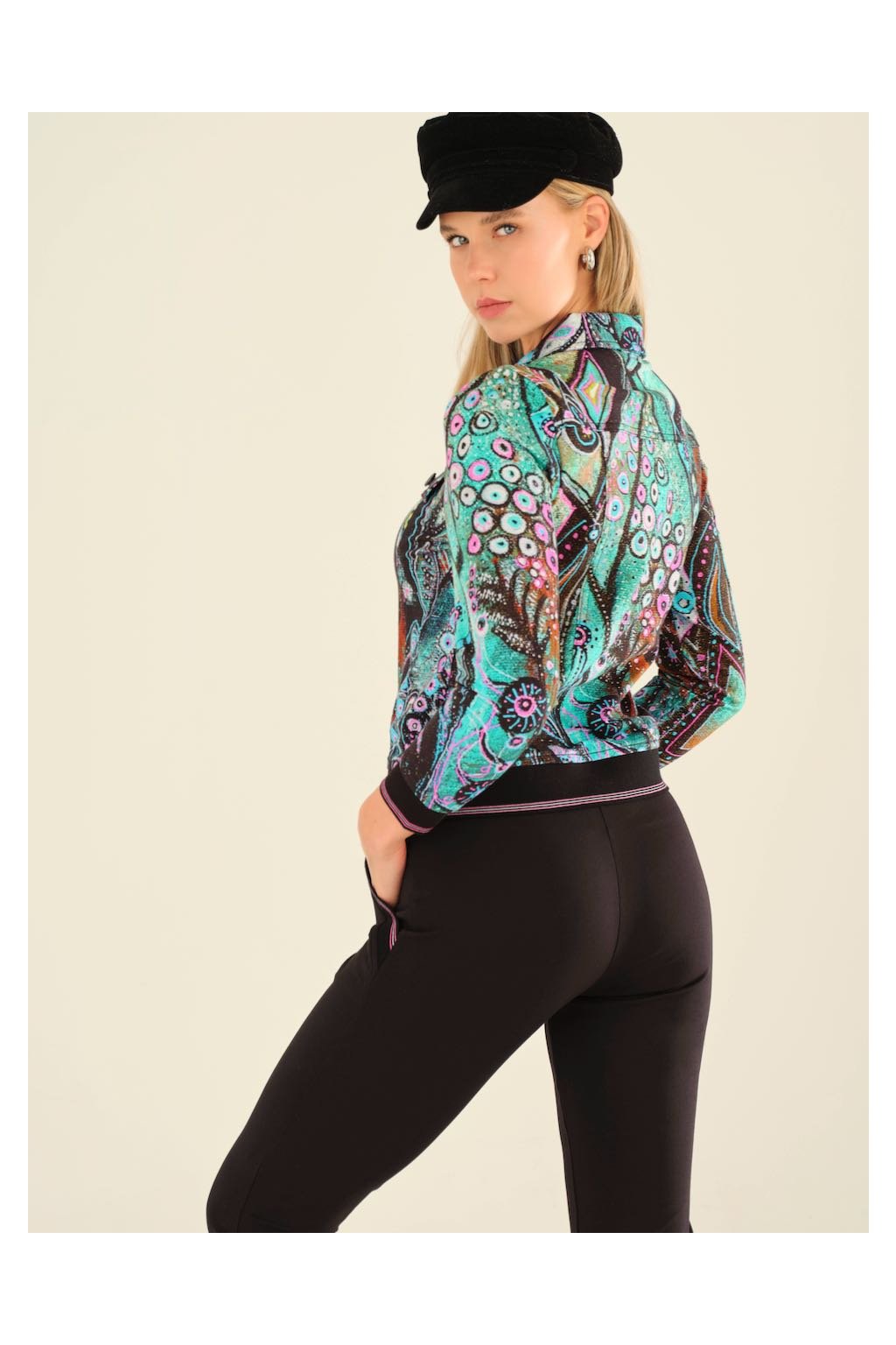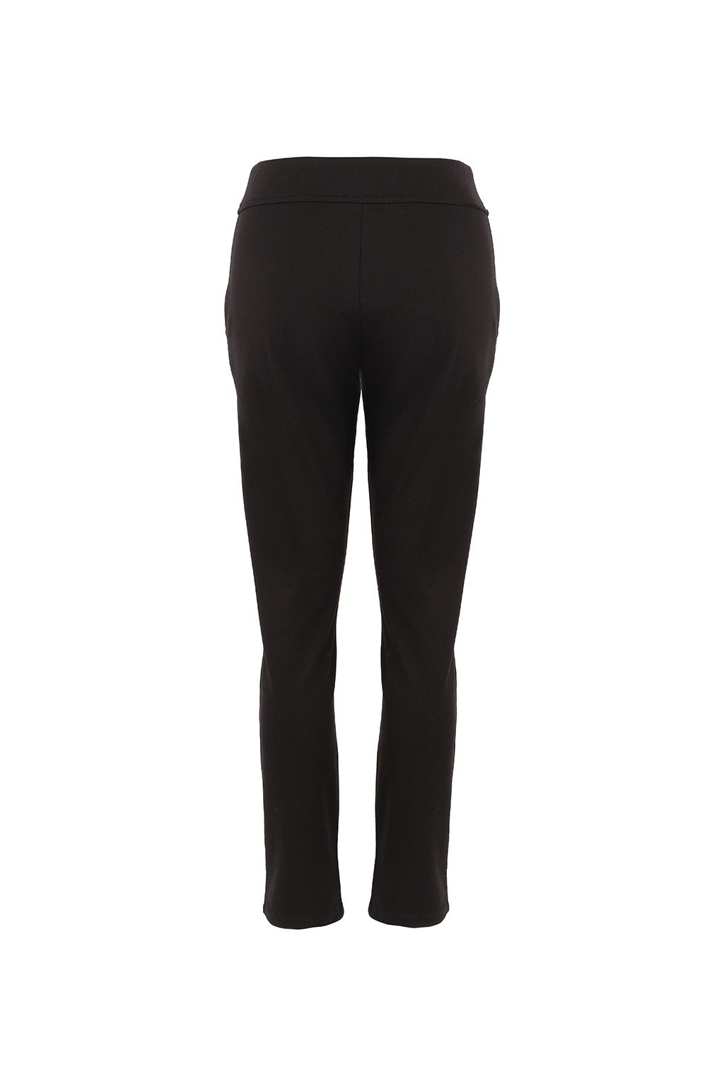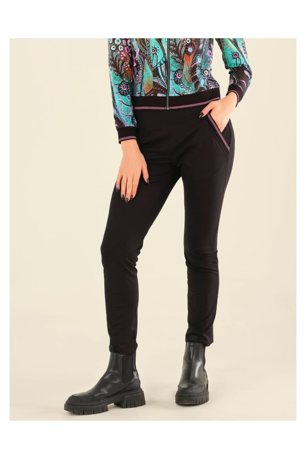 Čierne úpletové nohavice v pohodlnom strihu s elastickým pásom a praktickými vreckami. Kontrastné detaily a umelecký motív od Laurie DeVault (California, USA) v odtieňoch tyrkysovo zelenej, čiernej a ružovej dodávajú originálny vzhľad. Pružný materiál sa príjemne prispôsobí postave a lichotí každej siluete. Pre dokonalý outfit ich môžete skombinovať s topom alebo sakom z rovnakej kolekcie.