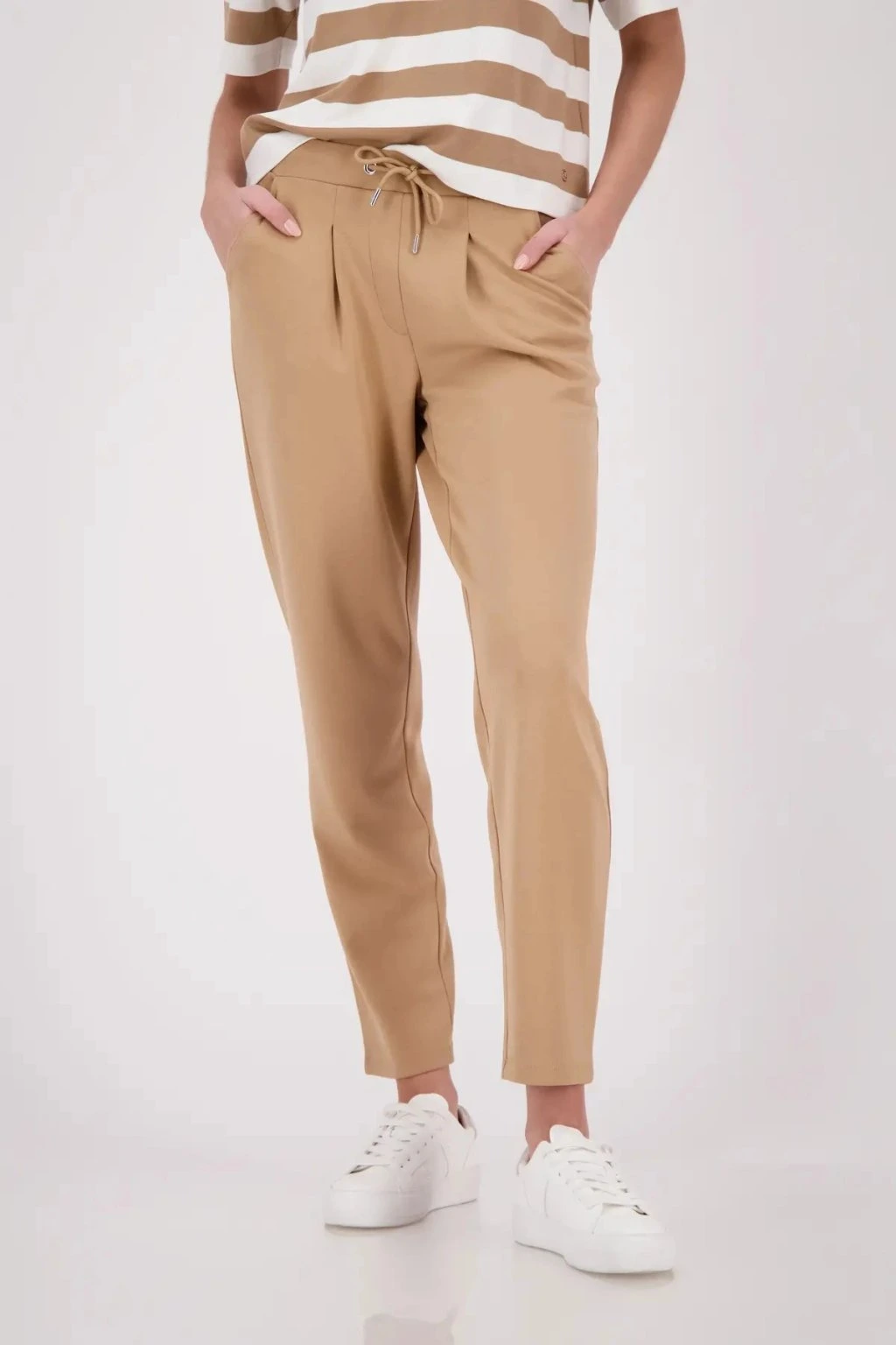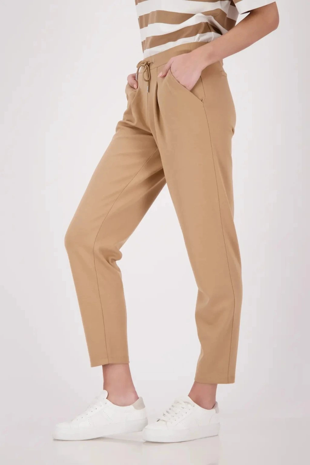 Dámske nohavice v modernom ležérno-elegantnom štýle, ktoré si zamilujete pre ich pohodlie aj nadčasový vzhľad. Majú pružný pás so šnúrkou na stiahnutie, praktické vrecká a príjemný splývavý materiál, ktorý sa skvele prispôsobí postave. Zúžený strih opticky predlžuje nohy a umožňuje ľahké kombinovanie s tričkom, blúzkou aj sakom. Ideálna voľba do práce, na voľný čas aj cestovanie.