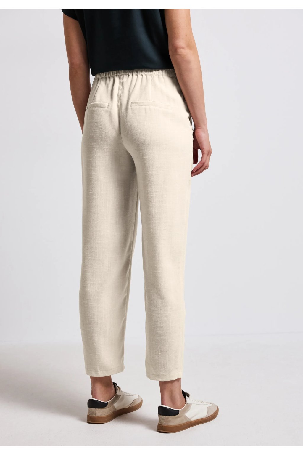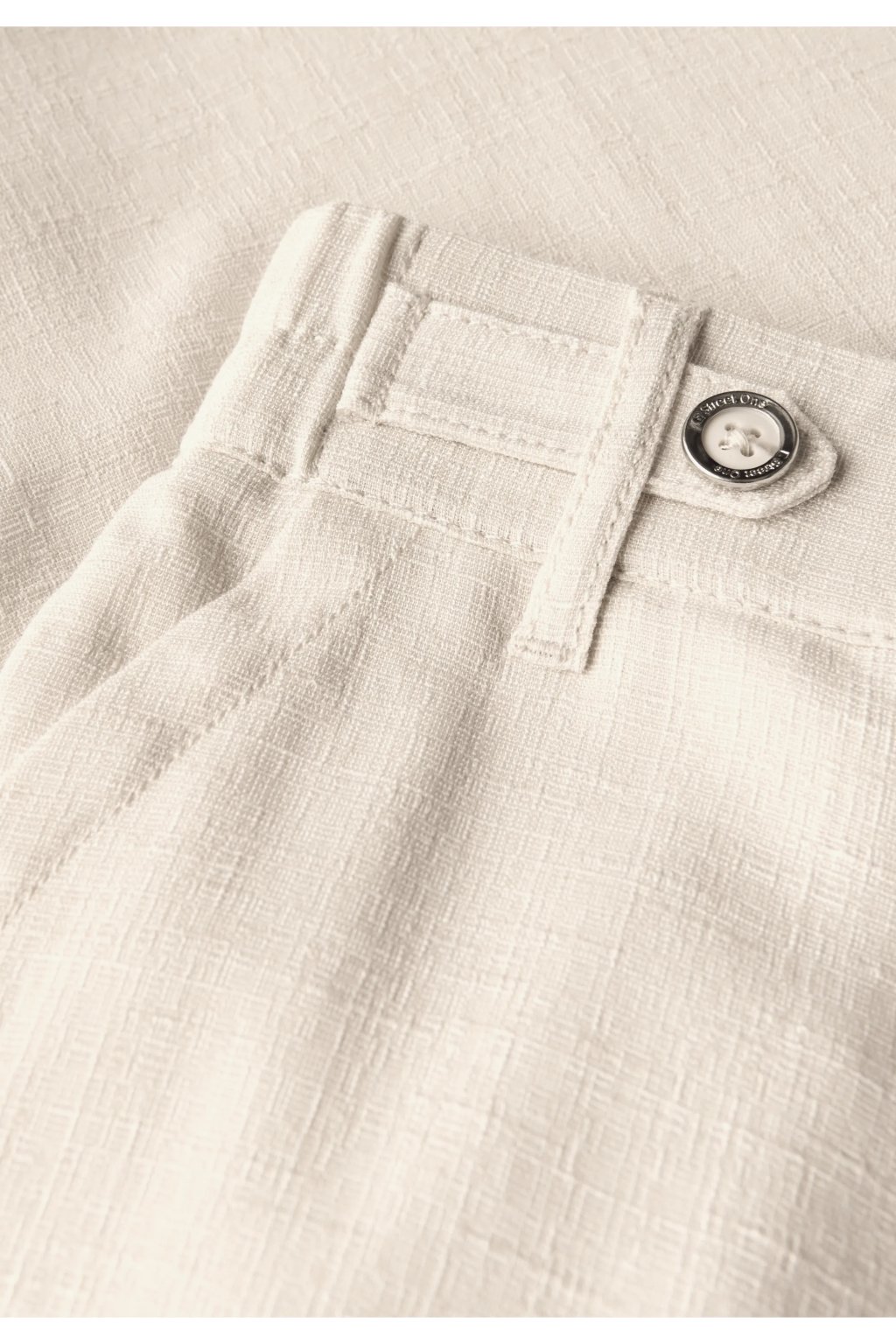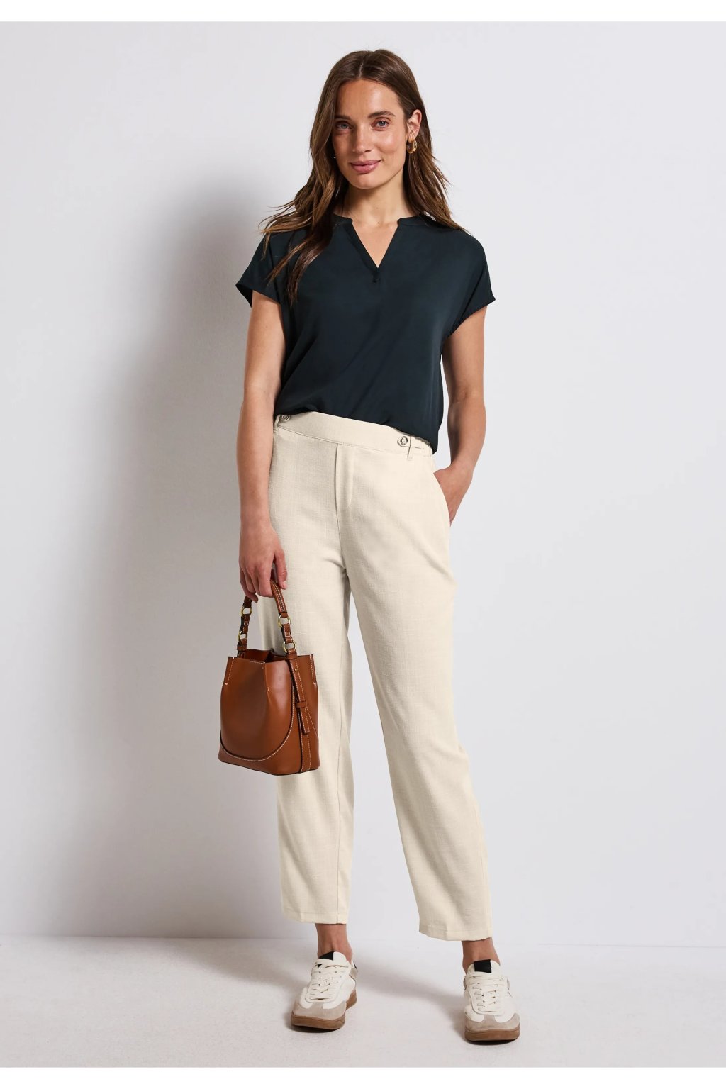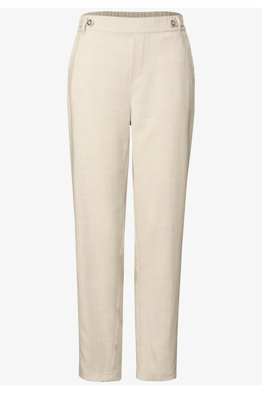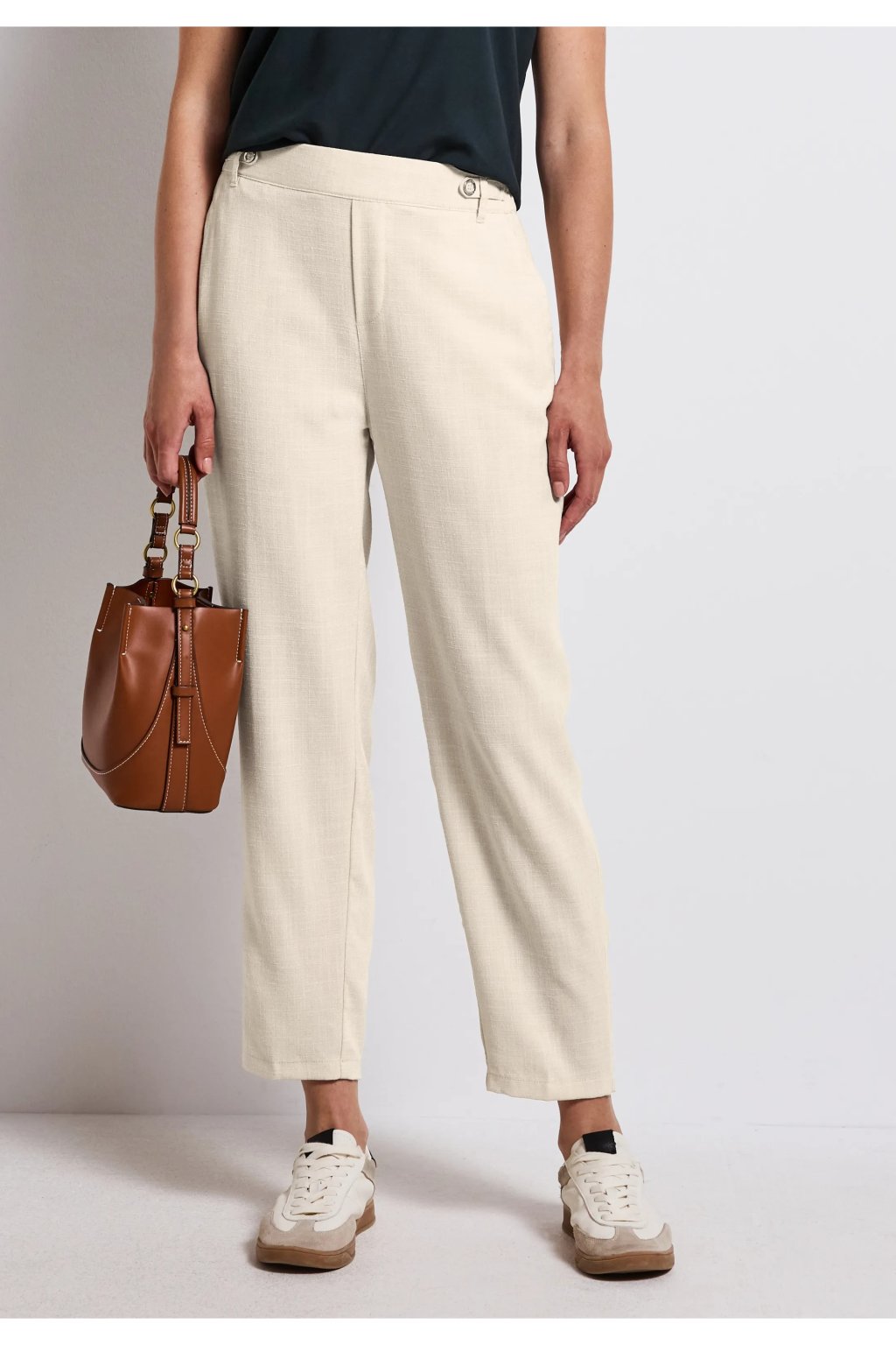 Tieto dámske chino nohavice od Street One zaujmú svojim úzkym strihom a módnymi detailmi na gombíky. Vysoký pás, úzke nohavice a elastický pás vzadu ponúkajú pohodlný ležérny strih. Pružná zmes materiálu zaisťuje celkovo príjemný pocit – ideálny do kancelárie aj na voľný čas.