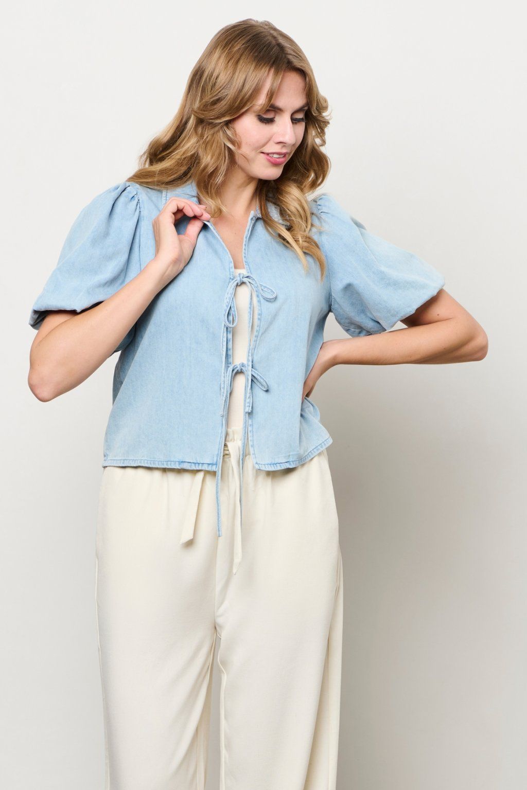 Ľahké dámske sako v denimovom vzhľade, ktoré dodá vášmu outfitu svieži a moderný nádych. Má voľnejší strih, krátke naberané rukávy a zapínanie na štýlové mašličky, ktoré pôsobia jemne a žensko. Vďaka príjemnému materiálu sa skvele nosí a ľahko ho skombinujete ako s nohavicami, tak so sukňou - ideálny kúsok pre každodenný aj ležérne elegantný outfit.