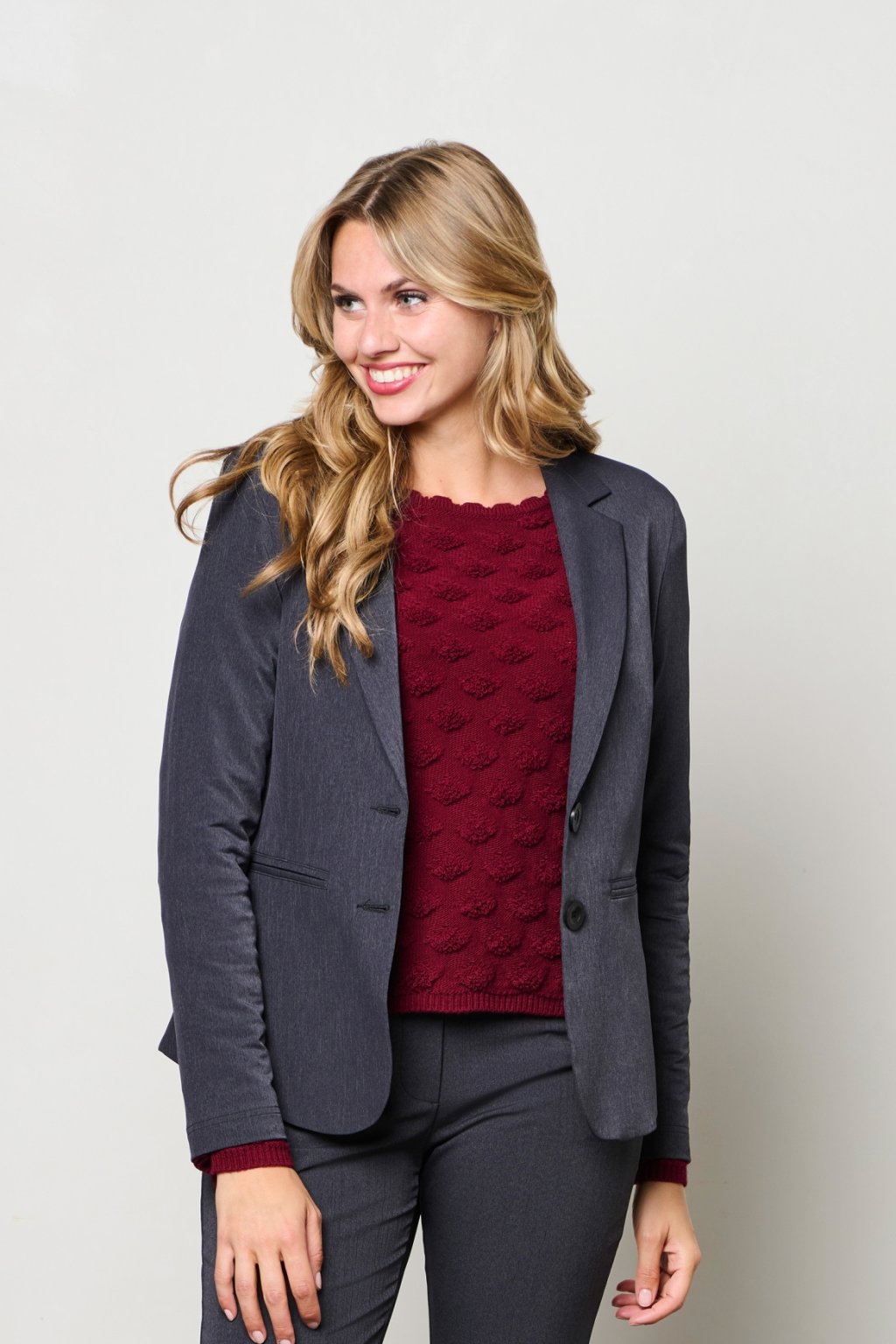 Elegantné dámske sako značky & Co, vyrobené z kvalitného melange materiálu v tzv. travel kvalite, ktorý je ľahký, pohodlný a vhodný na celodenné nosenie aj cestovanie. Nevystužené prevedenie bez podšívky zaisťuje prirodzený vzhľad a vysoký komfort pri nosení. Sako má klasický golier s chlopňami, zapínanie na dva gombíky a praktické paspové vrecká na prednom diele, ktoré podčiarkujú jeho elegantný, nadčasový charakter. Skvele sa hodí ako k formálnym nohaviciam, tak aj k ležérnejším outfitom.