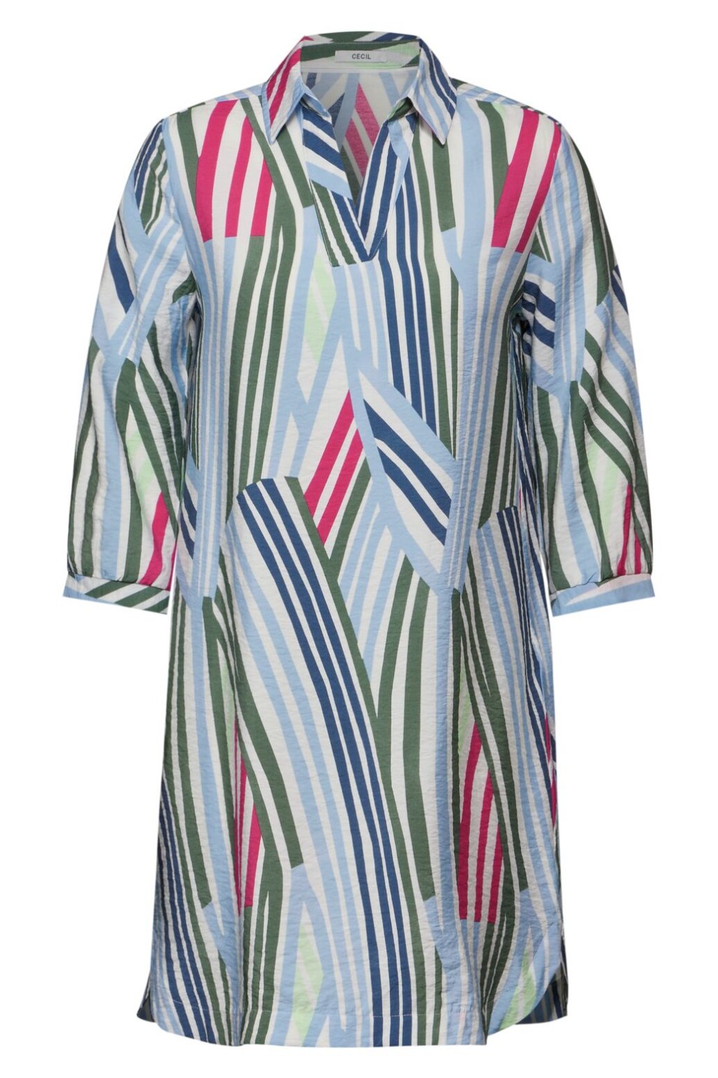 Mušelínové šaty od CECIL sú očarujúce letné šaty pre ženy so siluetou po kolená. S manžetovými 3/4 rukávmi, klasickým golierom a lichotivým výstrihom do V ponúka nadčasovú eleganciu. Rôznofarebné pruhy dodávajú šatám hravý nádych, zatiaľ čo zaoblený lem poskytuje moderný vzhľad.