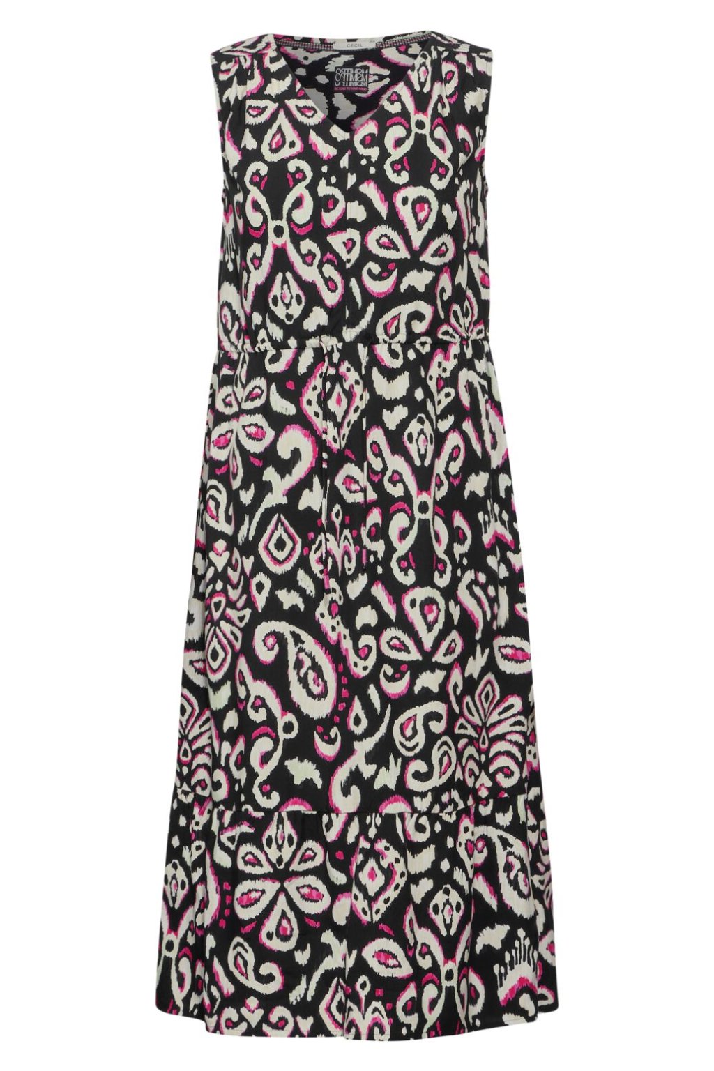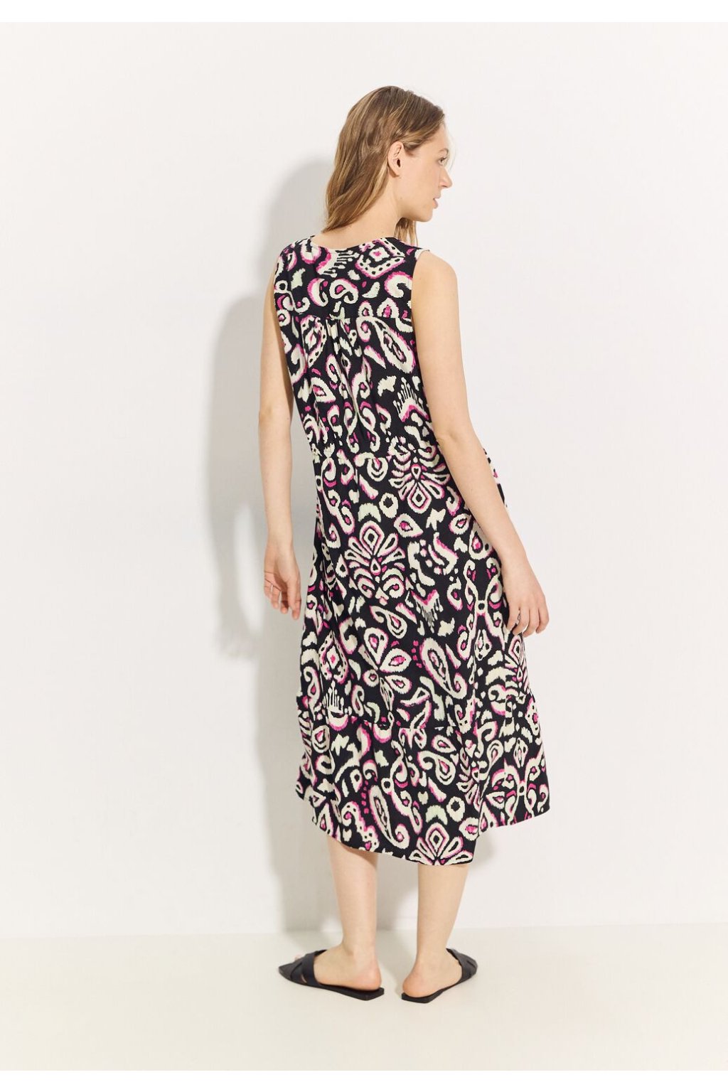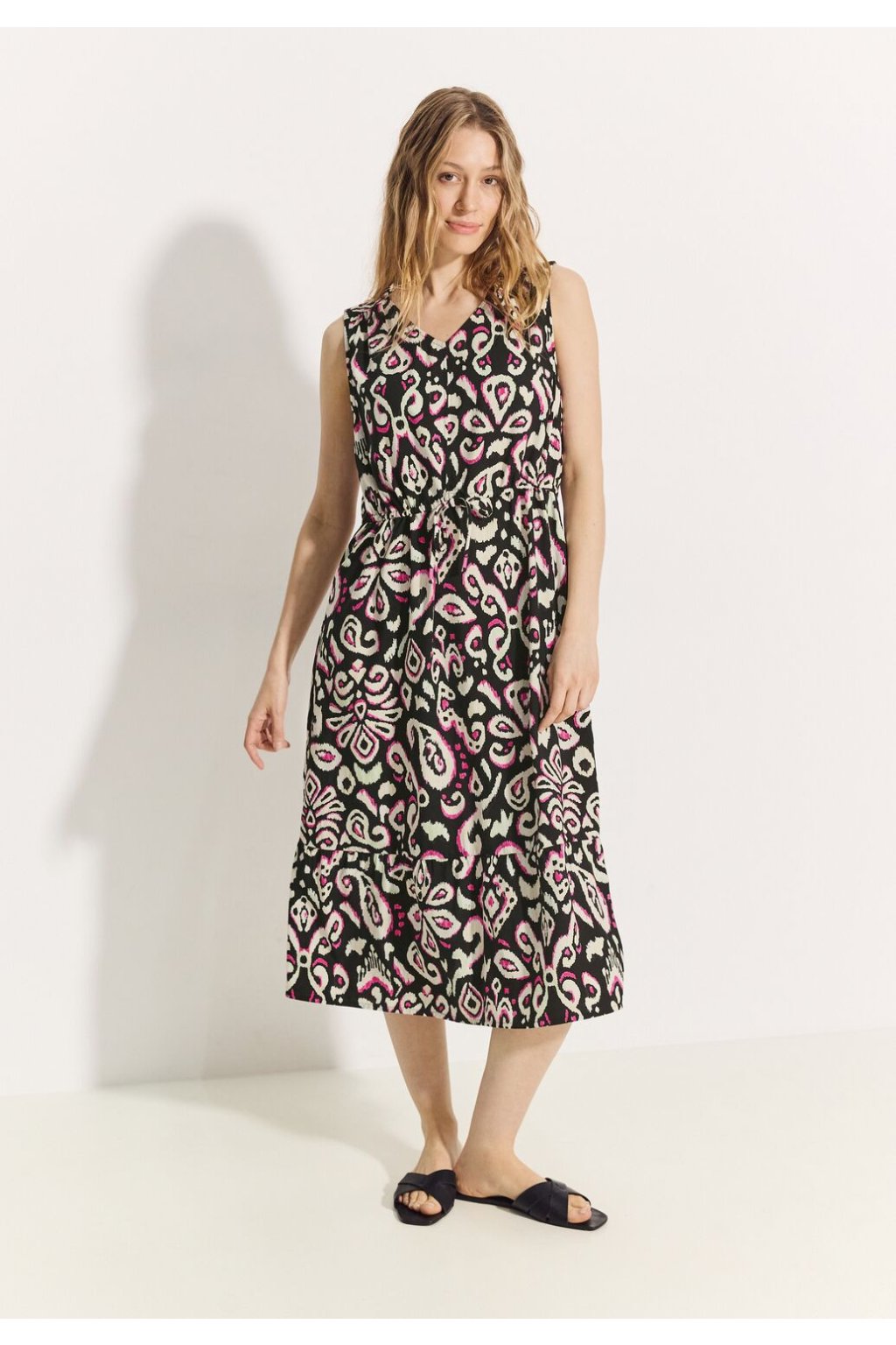 Letné šaty pre ženy CECIL sú midi šaty bez rukávov s okúzľujúcou potlačou a lichotivým výstrihom do V pre ženský vzhľad. Šaty je možné individuálne upraviť pomocou sťahovacej šnúrky v páse. Viacfarebný vzor dodáva šatám živý nádych, zatiaľ čo mäkká viskóza zaisťuje pohodlné nosenie.