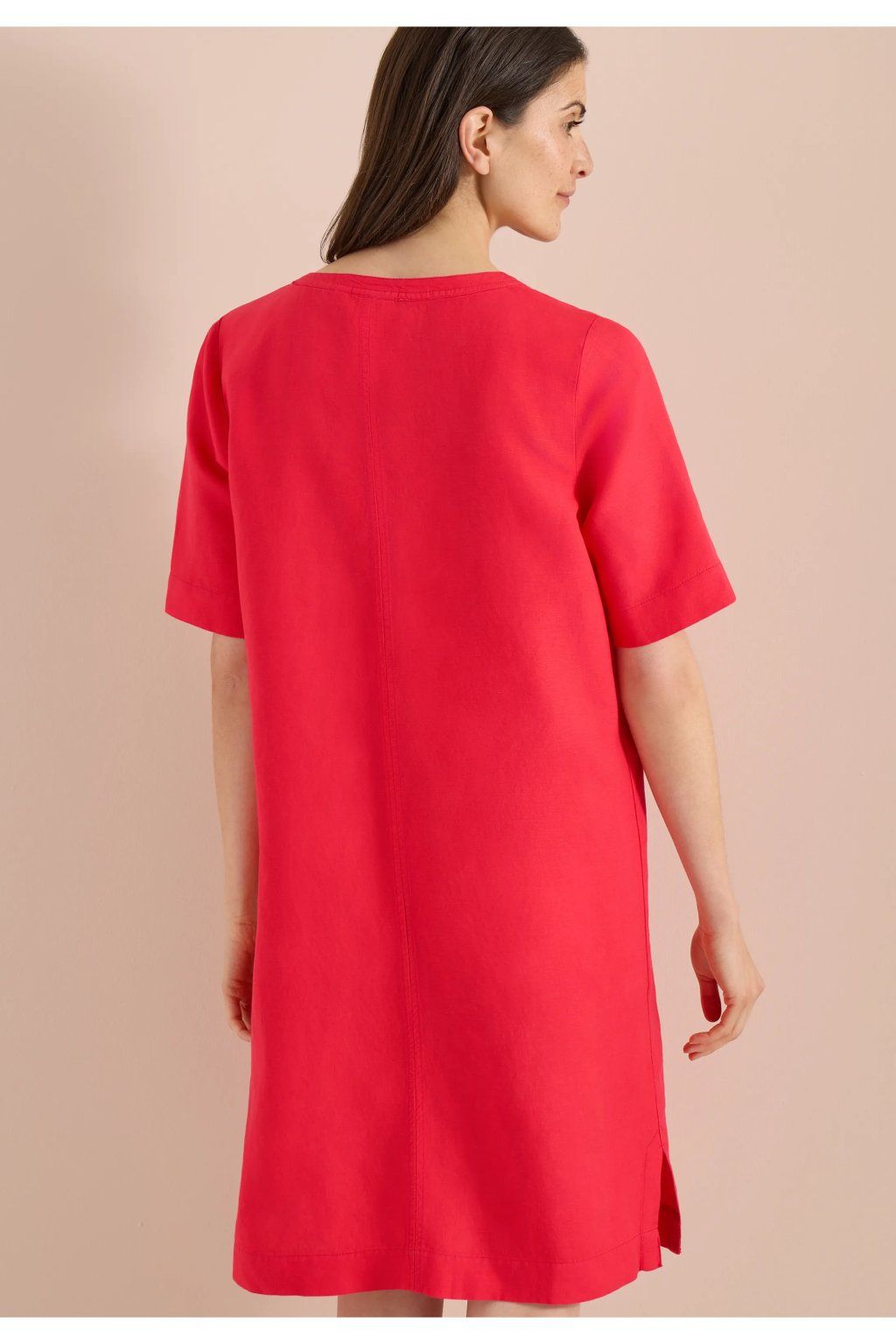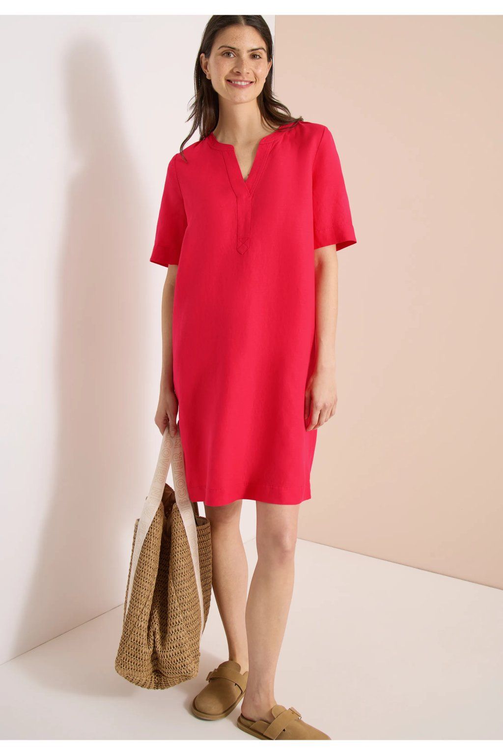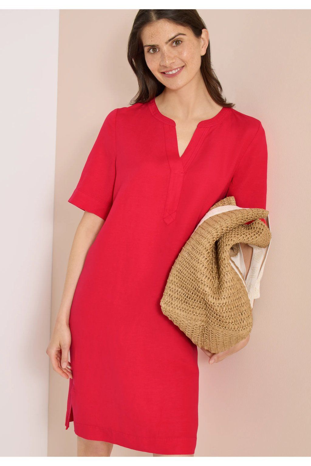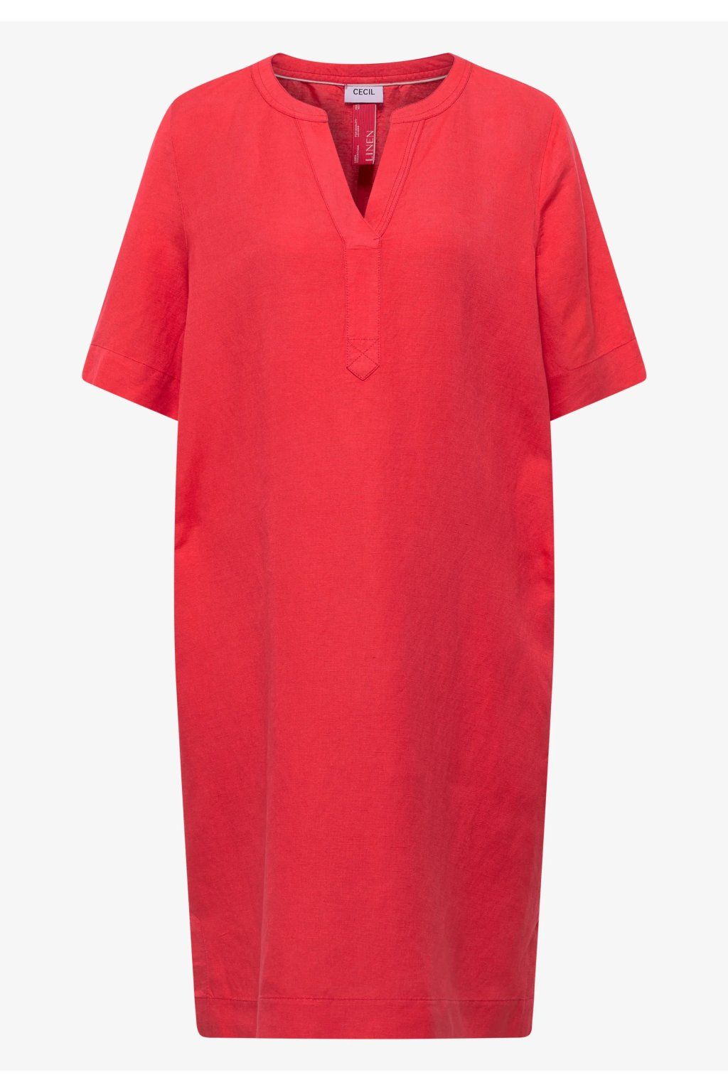 Dámske šaty vo výraznom ružovo-červenom odtieni sú neprehliadnuteľným kúskom, ktorý rozžiari každý letný outfit. Voľnejší rovný strih zaisťuje pohodlné nosenie, zatiaľ čo výstrih do V dodáva modelu jemne ženský a elegantný vzhľad. Krátke rukávy a jednoduchý minimalistický dizajn podčiarkujú ich ľahkosť a univerzálnosť. Ideálna voľba do mesta, na dovolenku aj pre chvíle, kedy chcete staviť na farbu, pohodlie a svieži štýl.