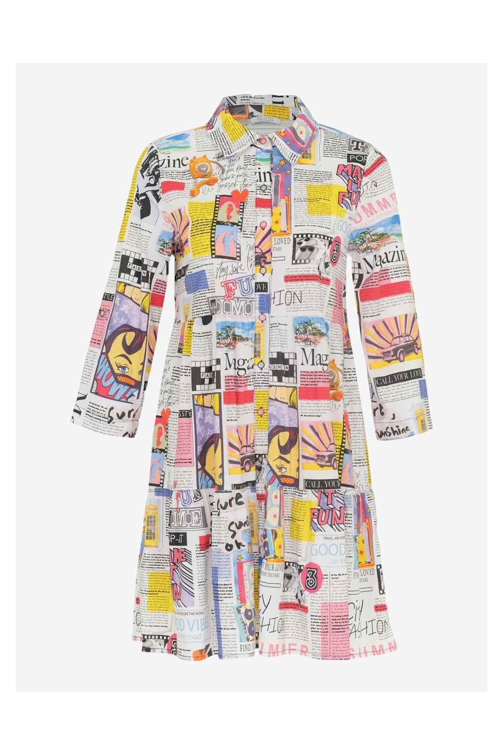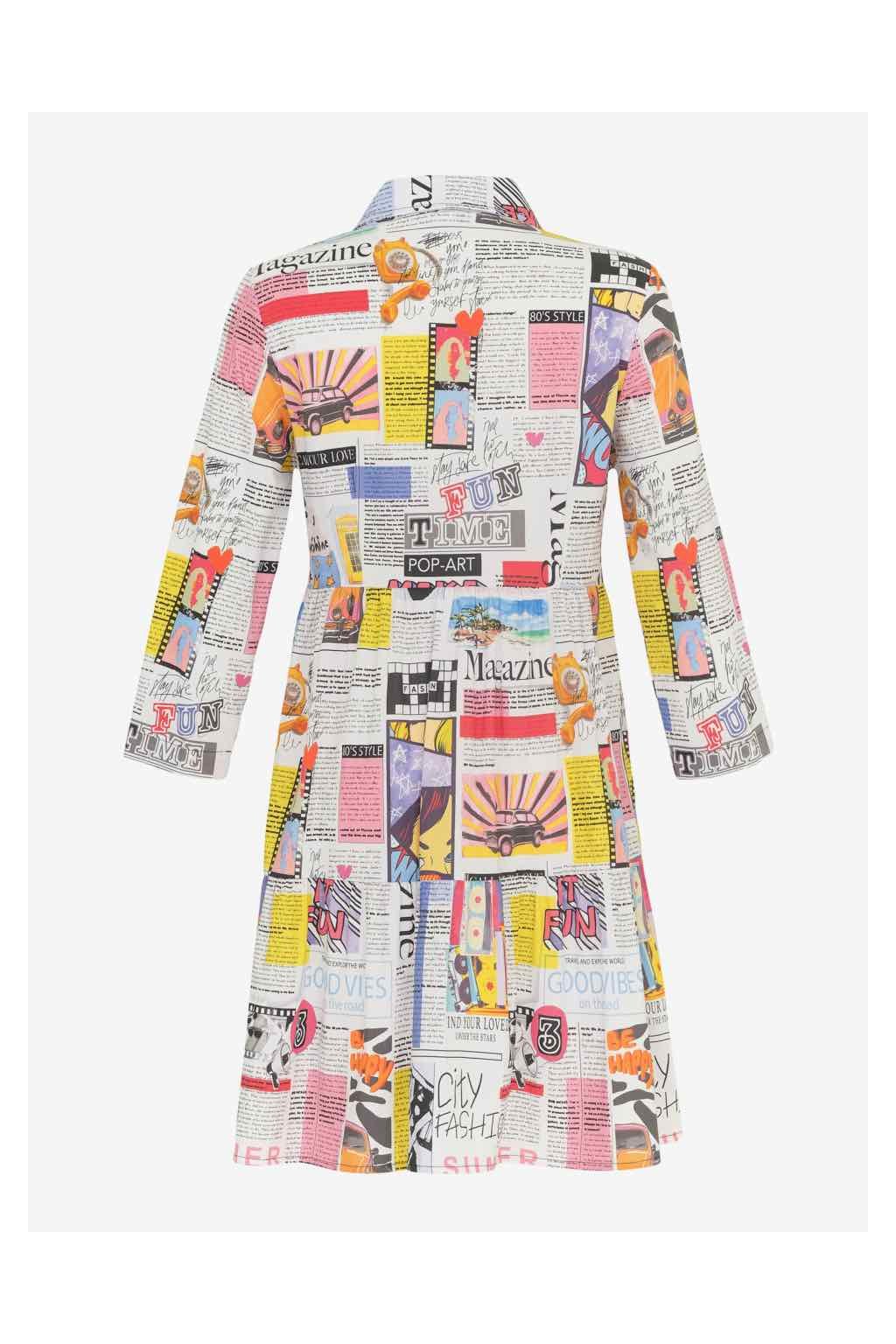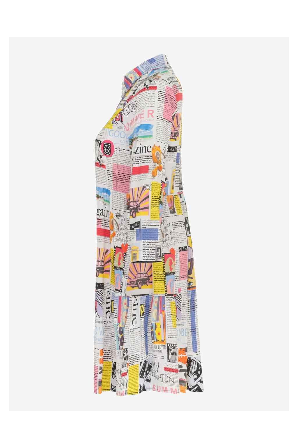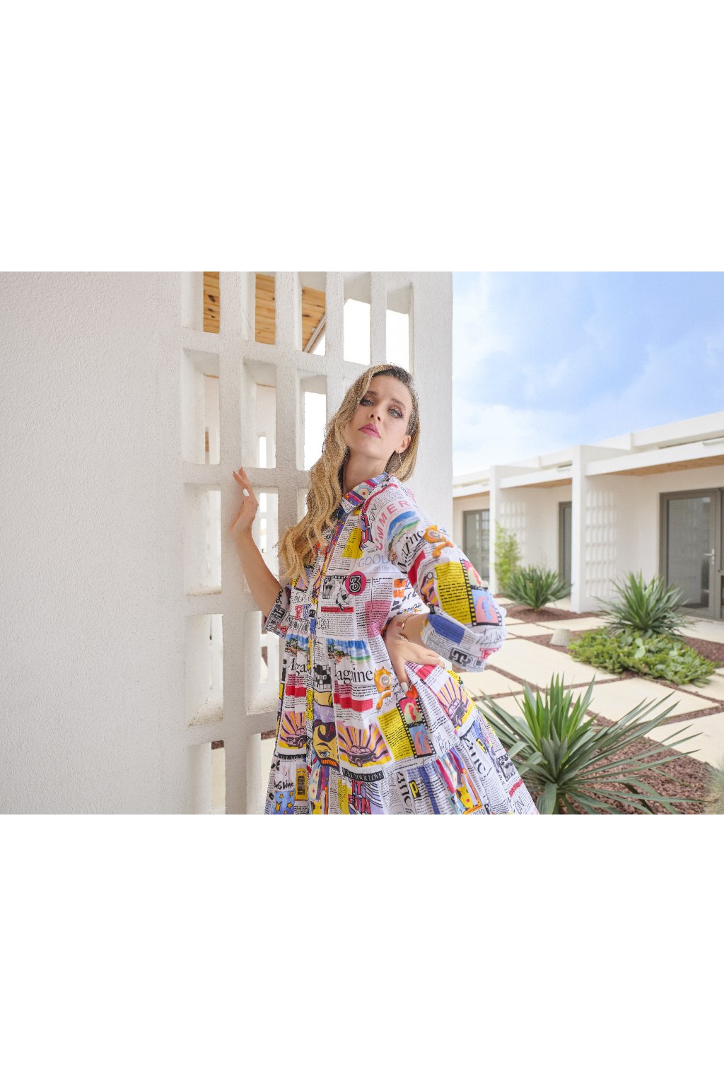 nádherné letné šaty tkané zo zmesi bavlny s 3/4 dlhými rukávmi, dĺžka ku kolenám. predné zapínanie na gombíky, golier na košeli, stupňovitá nariasená sukňa s celoplošným umeleckým mixom časopisových potlačí v žiarivo sviežej farebnej palete, pohodlný voľný strih,