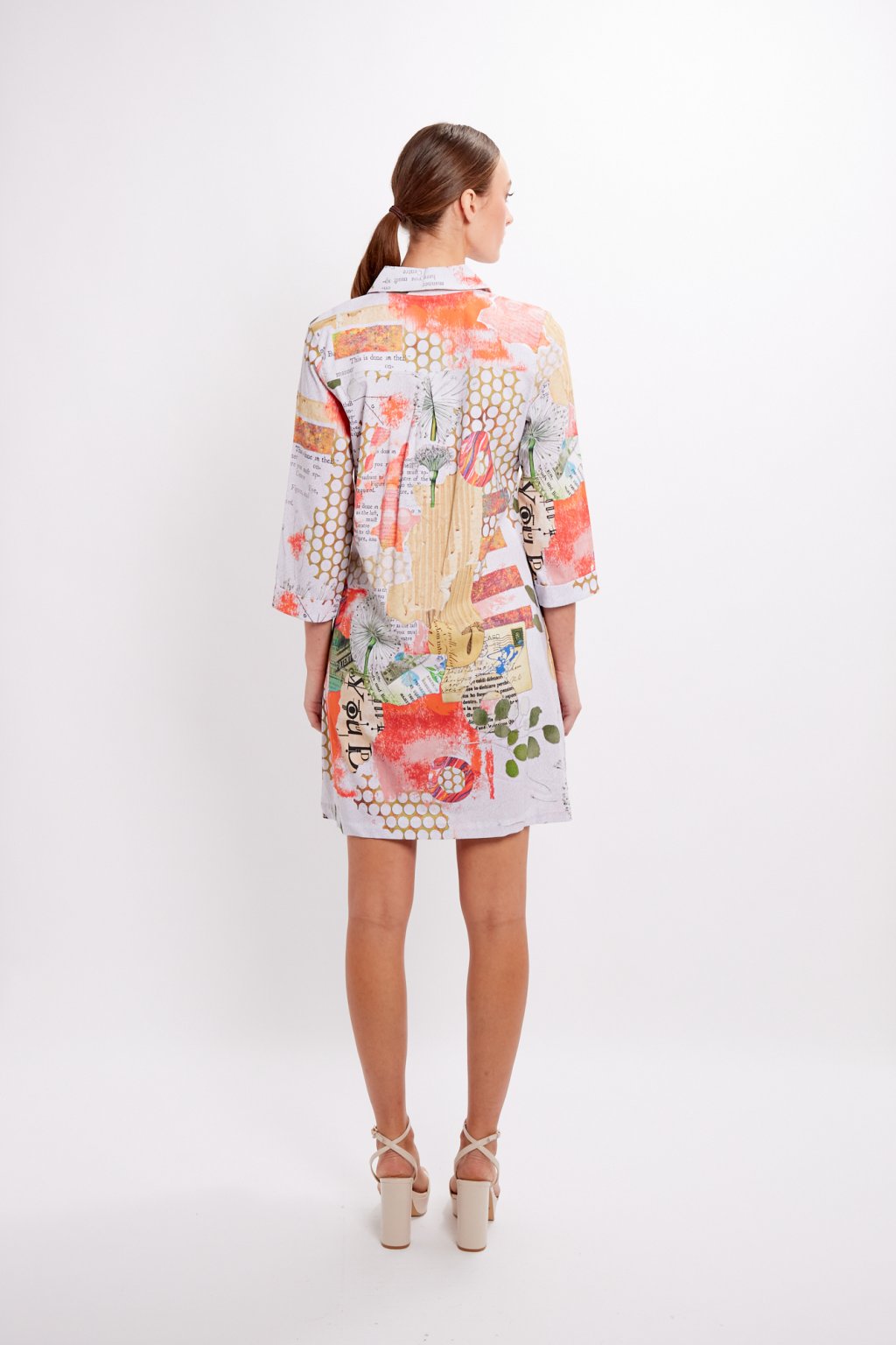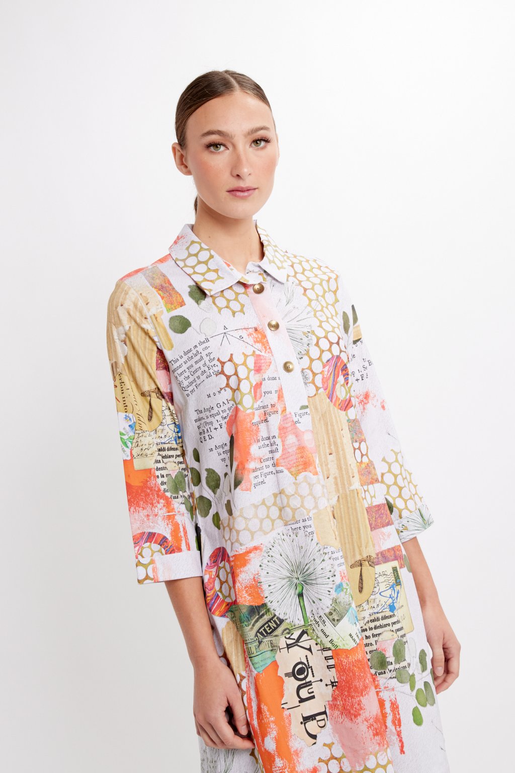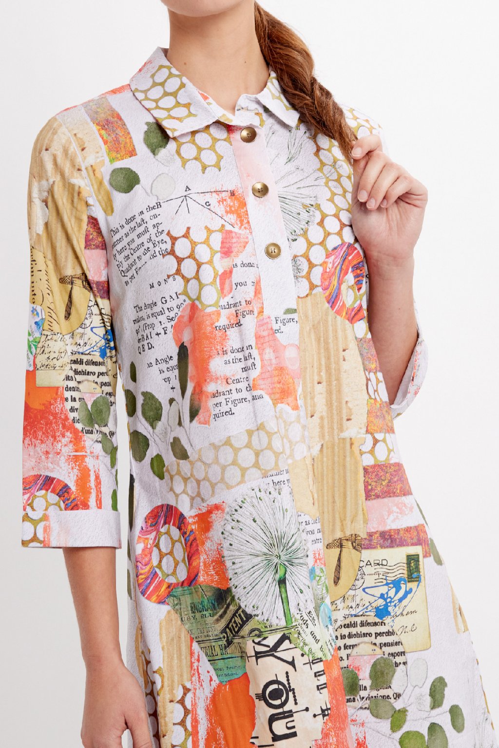 Tieto veľkolepé šaty Dolcezza 'Big Changes' Dress sú súčasťou umeleckej kolekcie Dolcezza od amerických umelcov Gina Startup, jej umelecké diela cez celé šaty vytvárajú odvážne a jedinečné vyhlásenie. Tieto šaty so štýlovým golierom a čiastočným predným zapínaním na gombíky sa môžu pochváliť celoplošnou potlačou a 3/4 rukávmi.