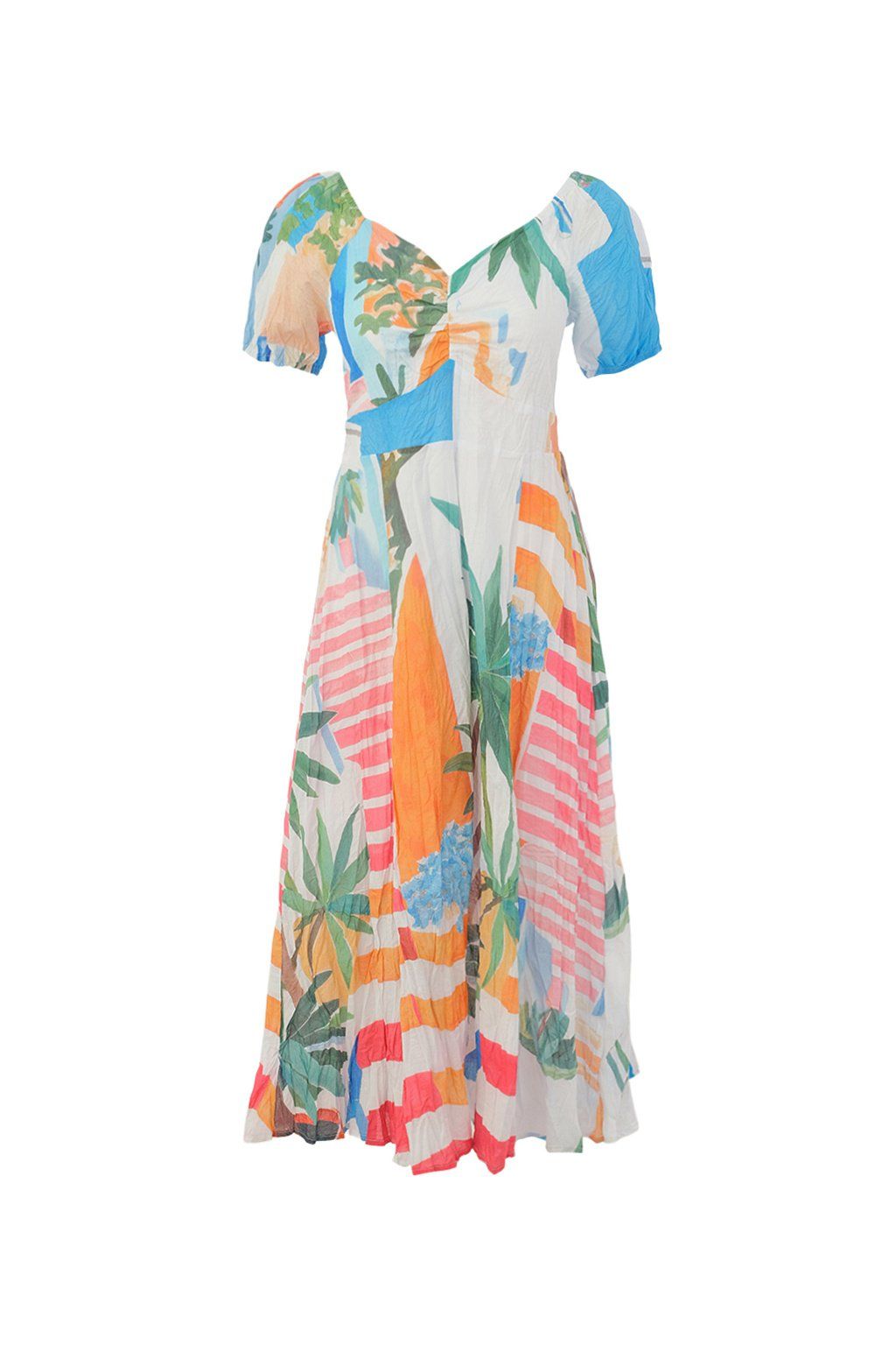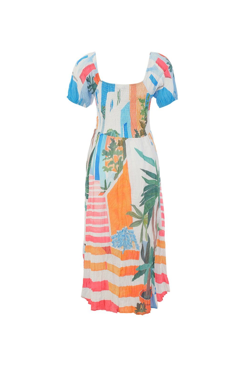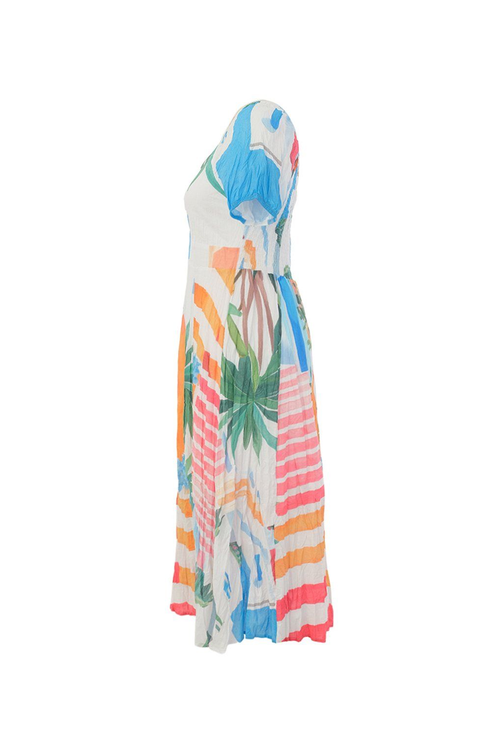 Dámske šaty s výraznou tropickou potlačou sú neprehliadnuteľným kúskom, ktorý rozžiari každý letný outfit. Farebná kombinácia sviežich modrých, zelených, ružových a oranžových tónov pôsobí hravo, energicky a veľmi žensky. Midi dĺžka, jemne priliehavý strih a vzdušná sukňa dodávajú modelu ľahkosť a elegantný pohyb, zatiaľ čo krátke rukávy podčiarkujú jeho letný charakter. Ideálna voľba na dovolenku, letné oslavy aj chvíle, kedy chcete vyzerať štýlovo, originálne a cítiť sa skvele.