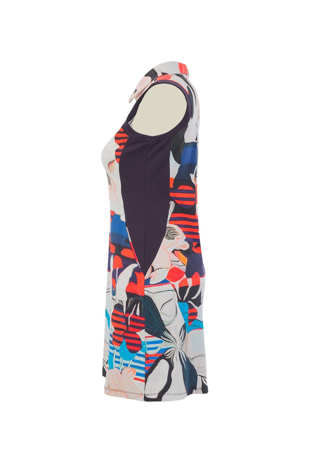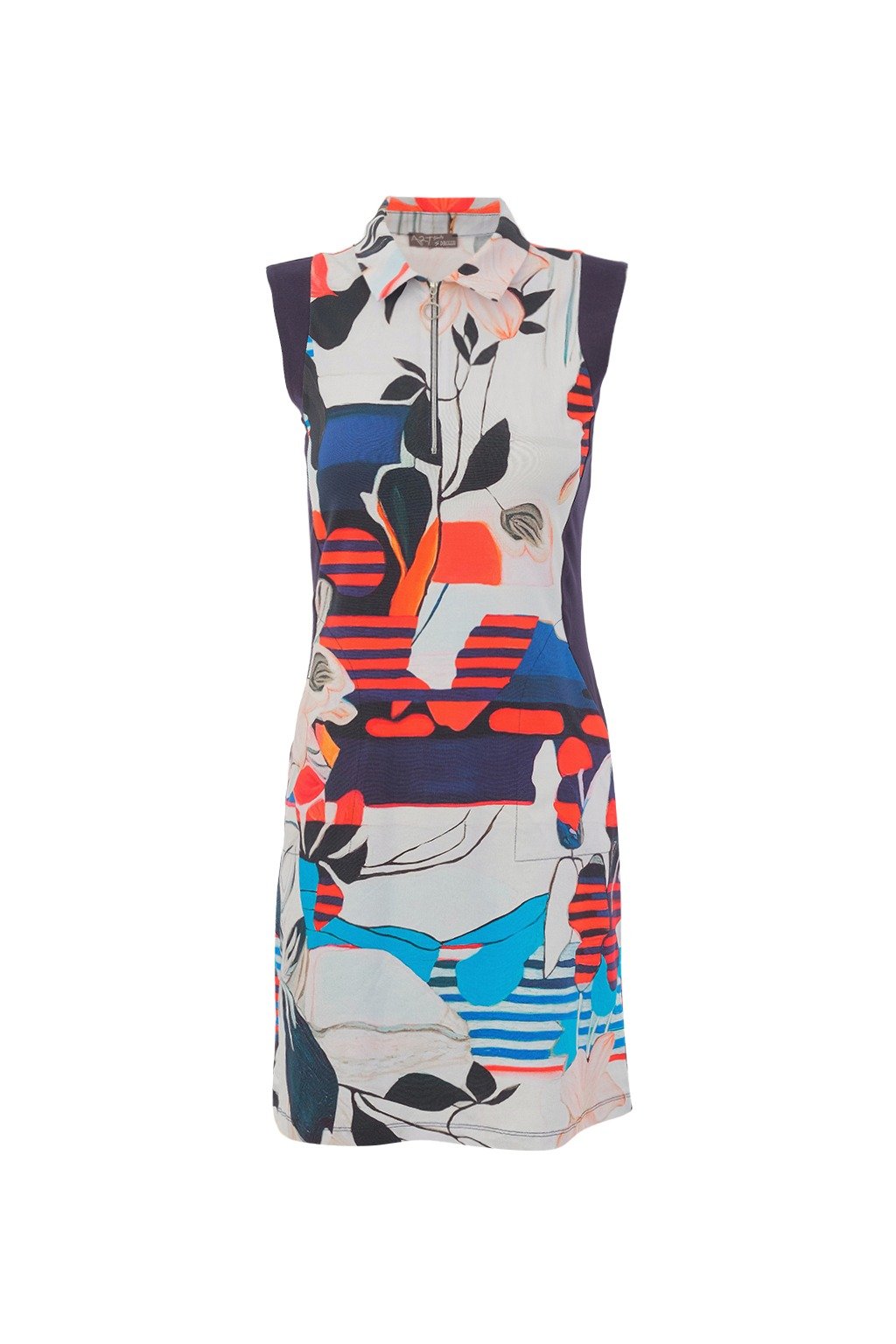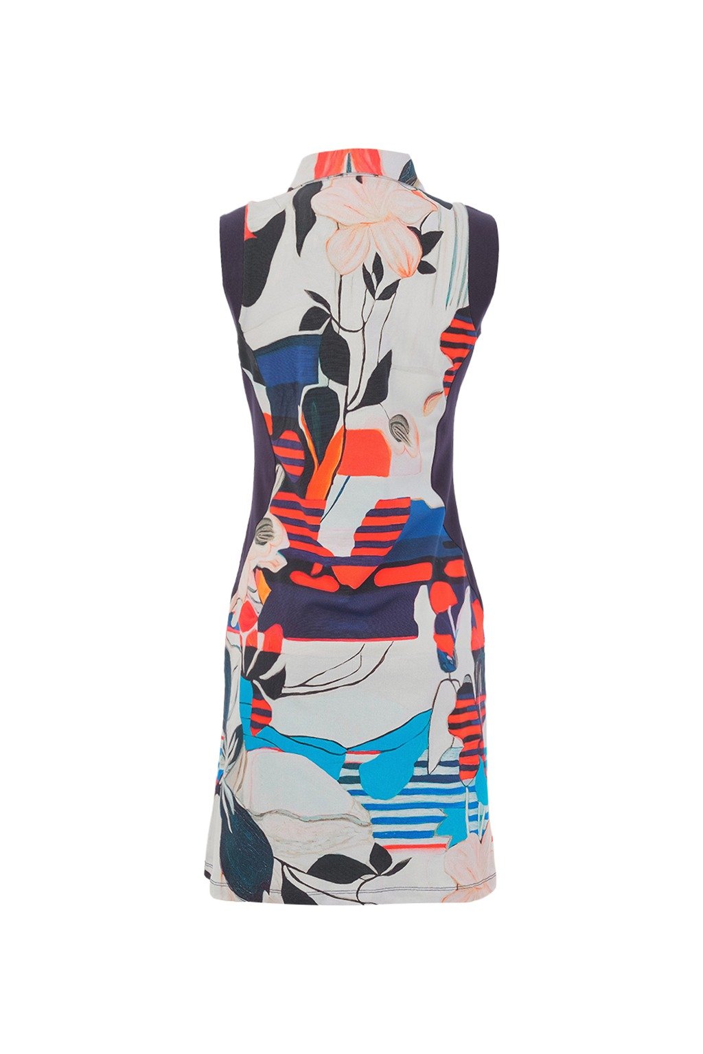 Dámske šaty s výrazným, moderným vzorom, ktoré zaujmú na prvý pohľad a dodajú outfitu svieži letný charakter. Ľahké a príjemné prevedenie zaisťuje komfort aj počas teplých dní. Bezrukávový strih a elegantná dĺžka nad kolená krásne zvýrazňujú siluetu a umožňujú voľnosť pohybu. Originálny farebný design dodáva šatám jedinečný štýl, vďaka ktorému sú ideálnou voľbou na prechádzky mestom, dovolenku aj neformálne spoločenské príležitosti. Skvele sa kombinujú so športovou obuvou aj sandále.
