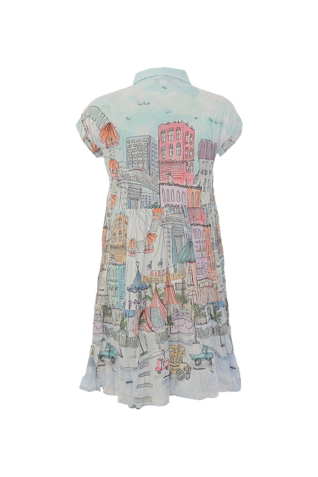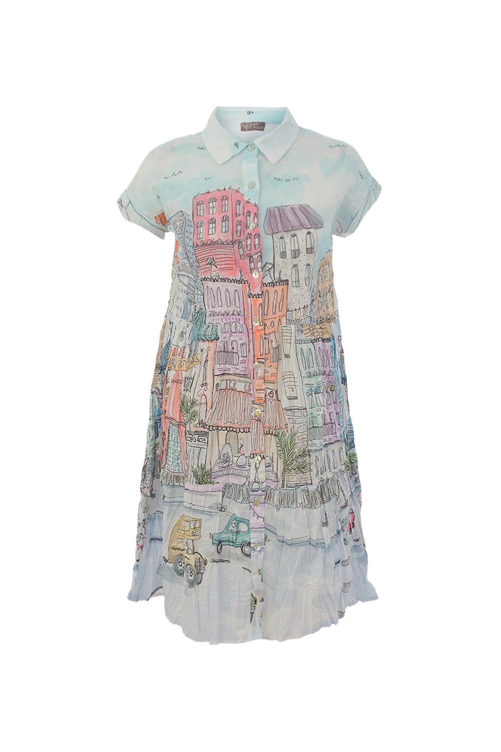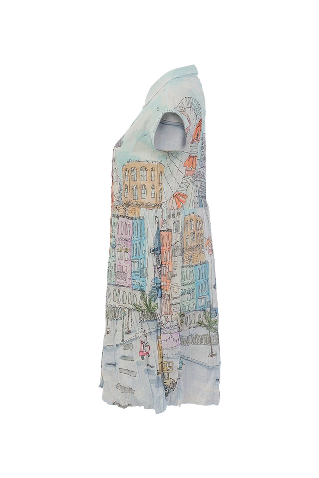 Dámske šaty s originálnou ilustratívnou potlačou pôsobia hravo, sviežo a na prvý pohľad zaujmú svojim umeleckým spracovaním. Ľahké biele prevedenie dopĺňa farebný motív mestských scenérií, ktorý dodáva modelu jedinečný a veľmi nápaditý vzhľad. Voľnejší strih, krátky rukáv a pohodlná kratšia dĺžka zaisťujú príjemné nosenie počas teplých dní, zatiaľ čo vzdušný materiál podčiarkuje ich letný charakter. Ideálna voľba do mesta, na dovolenku aj pre chvíle, kedy chcete vyniknúť originálnym a štýlovým outfitom.
