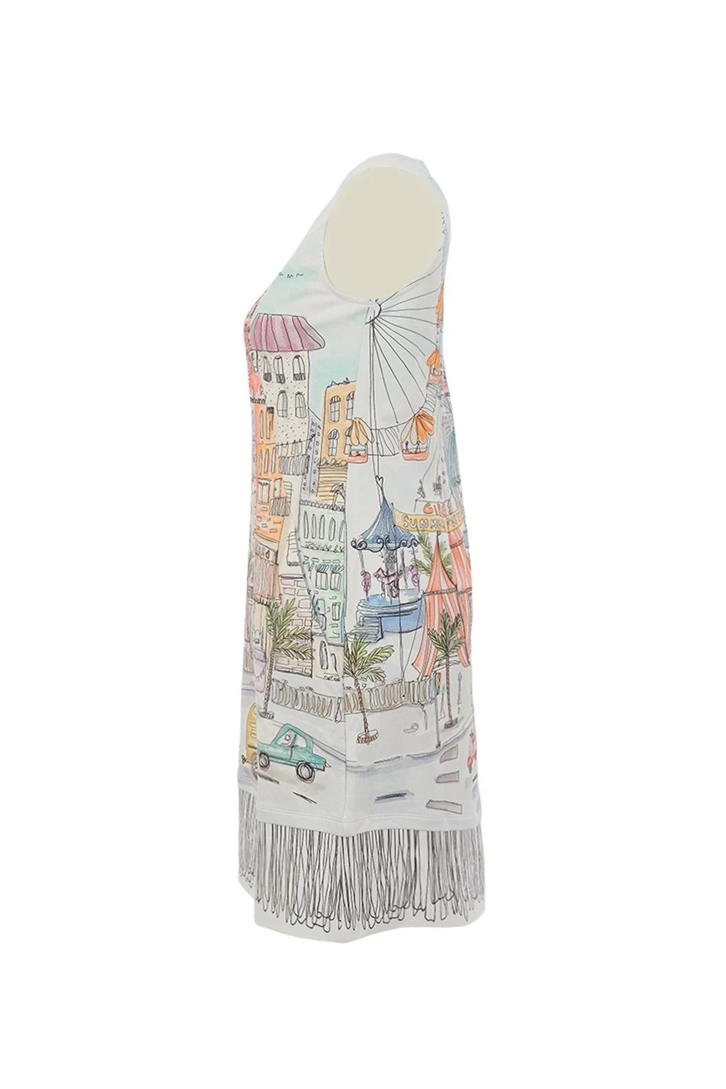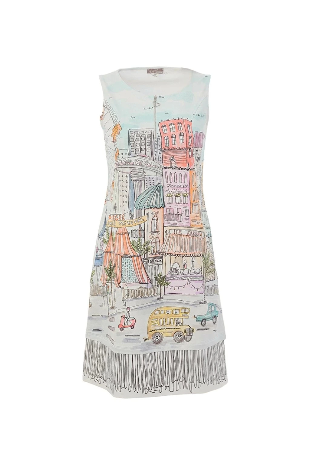 Dámske šaty s originálnou farebnou potlačou mestskej scenérie sú výrazným a hravým kúskom, ktorý okamžite upúta pozornosť. Majú elegantný strih bez rukávov s okrúhlym výstrihom a príjemný materiál, ktorý sa pohodlne nosí. Detailné ilustrácie dodáva šatám jedinečný charakter a štýl. Perfektná voľba pre letné dni, dovolenku aj chvíle, kedy chcete vyniknúť a dodať outfitu šmrnc.