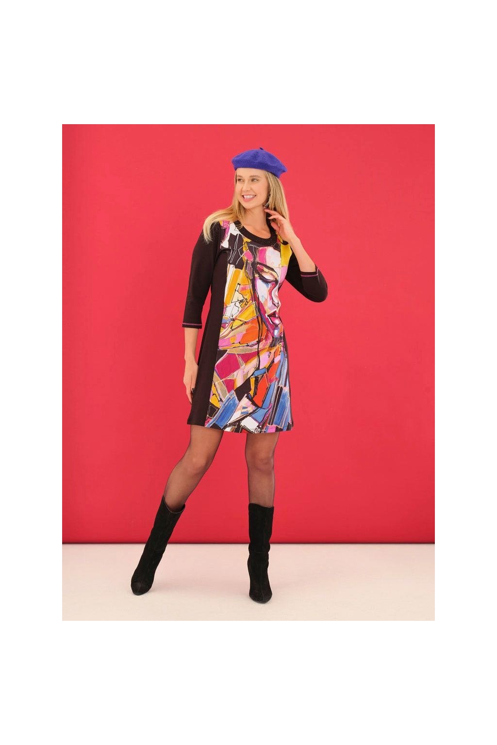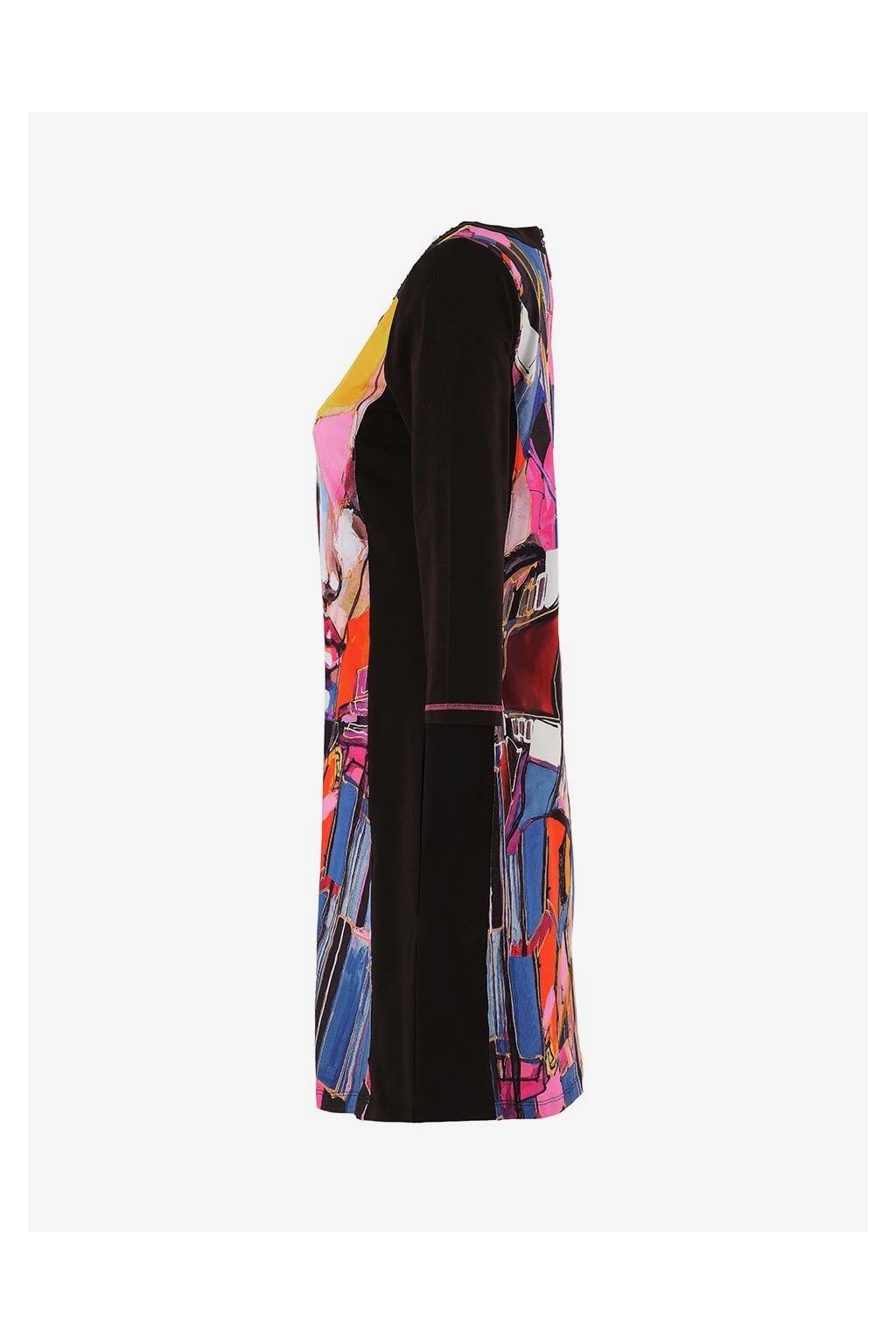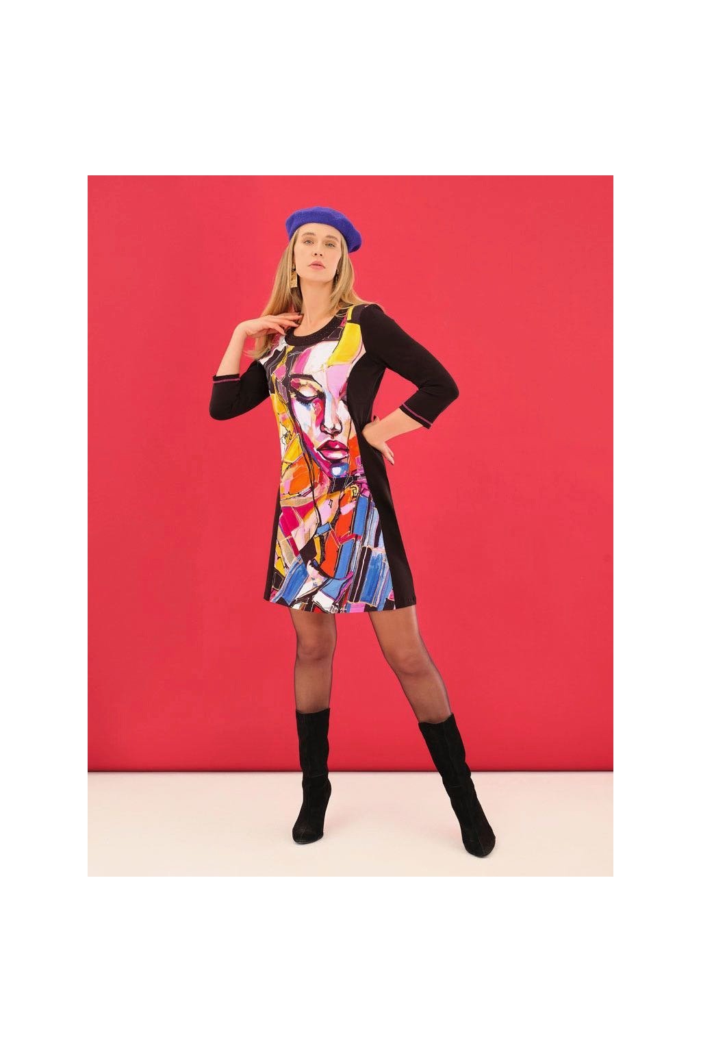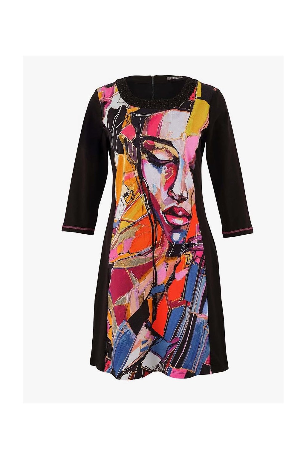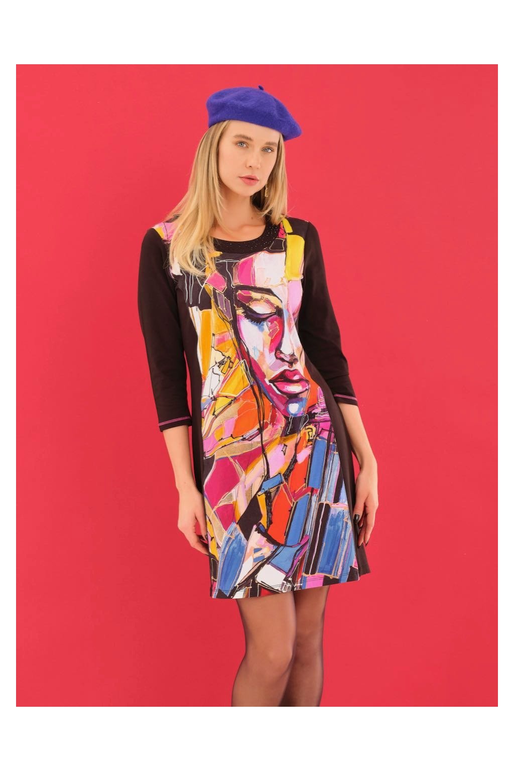 Výnimočné šaty z pohodlnej zmesi bavlny s umeleckým farebným motívom s portrétom, inšpirovaným tvorbou umelkyne Lany Frey z Prahy. Okrúhly výstrih s ozdobnými detailmi, kontrastné bočné panely pre lichotivú siluetu a 3/4 rukávy dodávajú elegantný vzhľad. Pružný materiál zaisťuje maximálne pohodlie a skvelý strih. Jedinečný kúsok „nositeľného umenia“, ktorý rozžiari váš šatník.