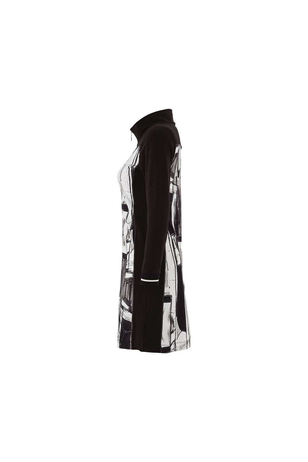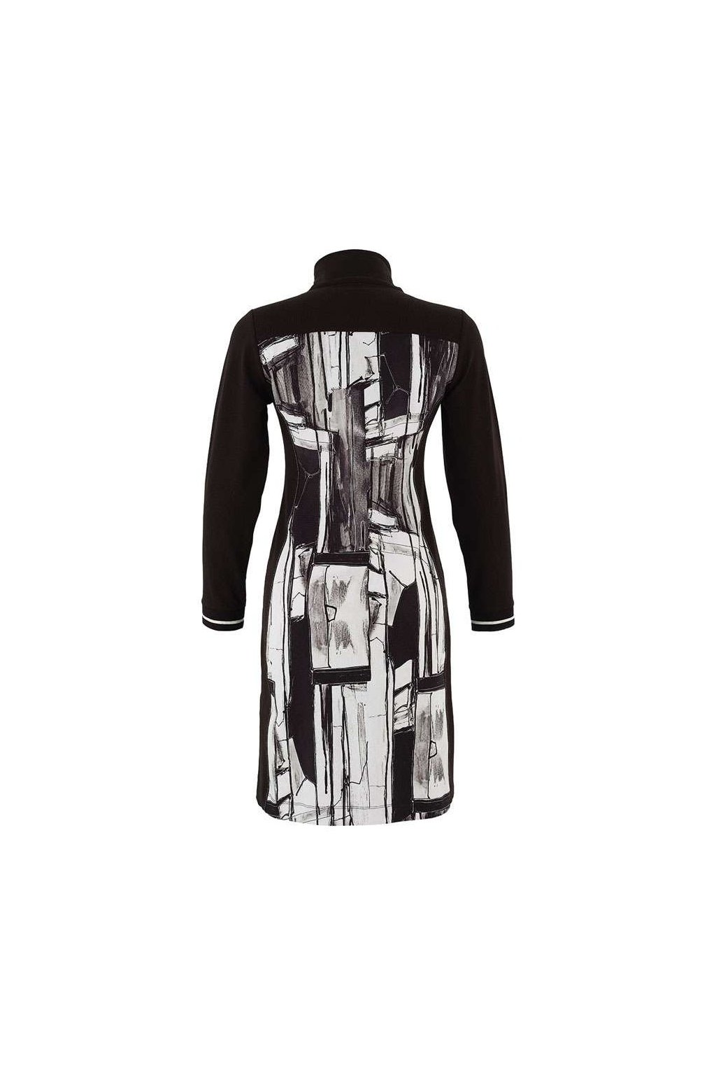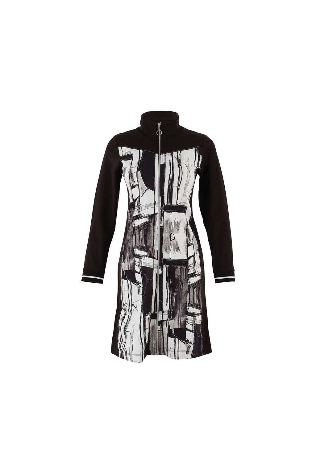 Elegantné a moderné šaty s výraznou čiernobielou abstraktnou potlačou „Baisti“ od umelkyne Lany Frey. Priliehavý strih z pohodlného, pružného bavlneného materiálu lichotí postave, čierne bočné panely opticky zoštíhľujú. Čierny stojačik so strieborným zipsom po celej dĺžke dodáva športovo-elegantný nádych. Dlhé čierne rukávy zakončené pružnými rebrovanými manžetami s bielym prúžkom. Rovný spodný lem, bez vreciek, bez podšívky.