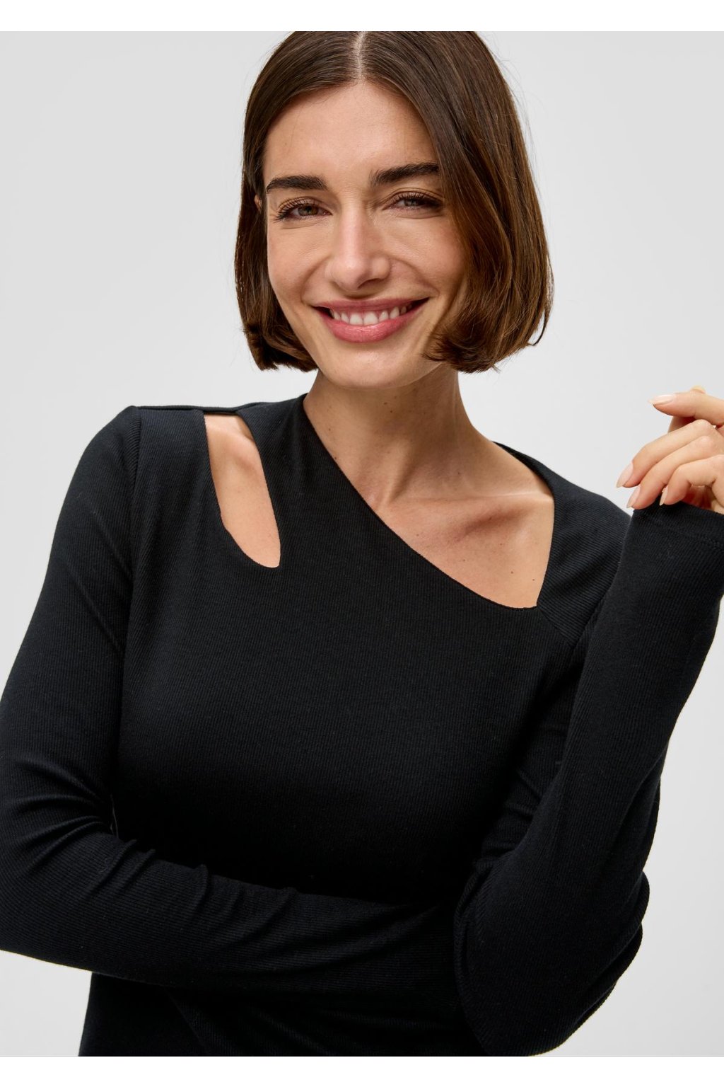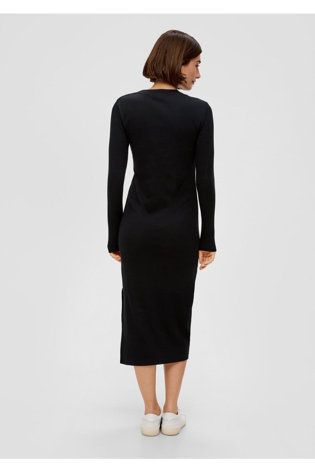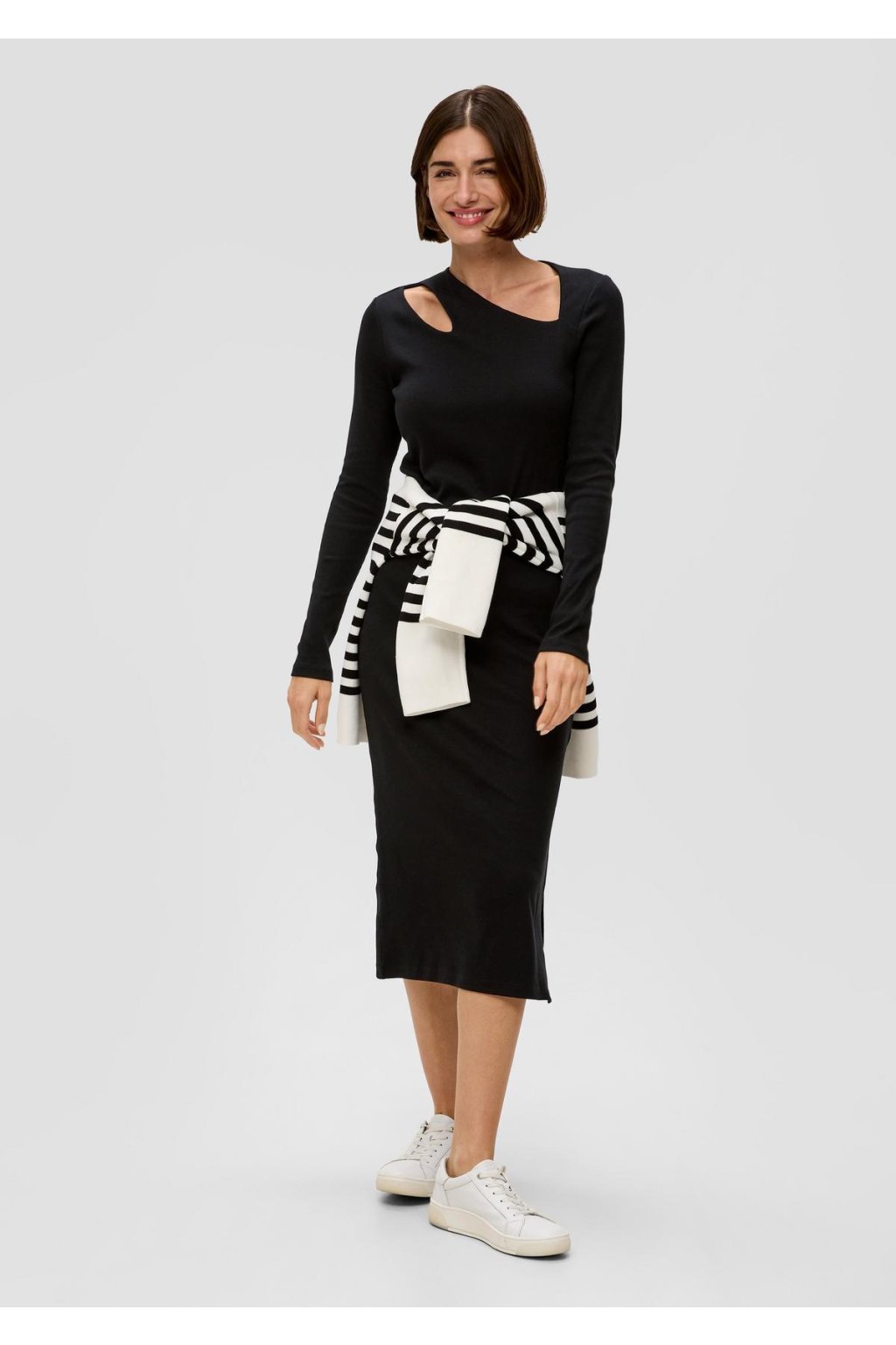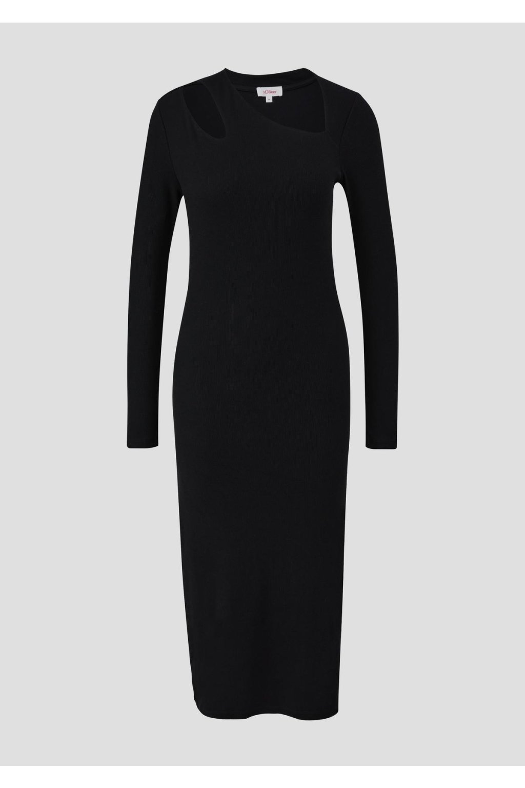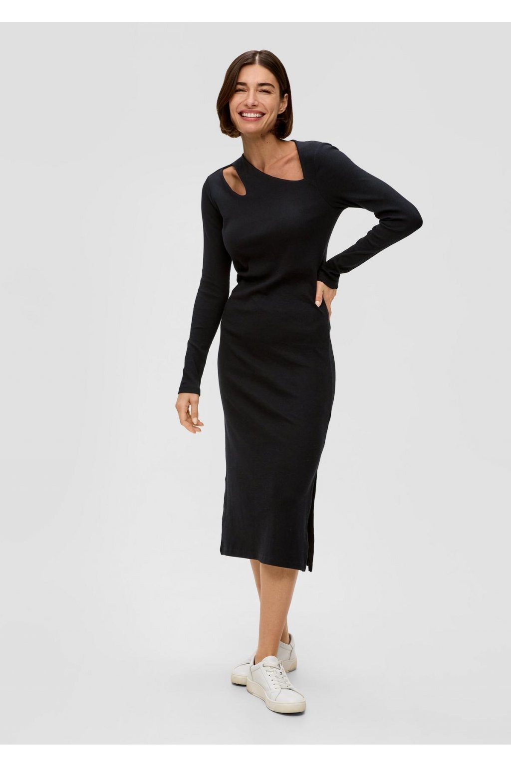 Tieto elegantné dámske šaty od s.Oliver zaujmú dlhým strihom s dlhým rukávom a predovšetkým atraktívnym dizajnom výstrihu. Obľúbená a lichotivá čierna farba dodáva šatám elegantný nádych a je ideálnou voľbou pre štýlové príležitosti. Úspešne kombinuje pohodlie a štýl a bude vás bez námahy sprevádzať po celý deň.