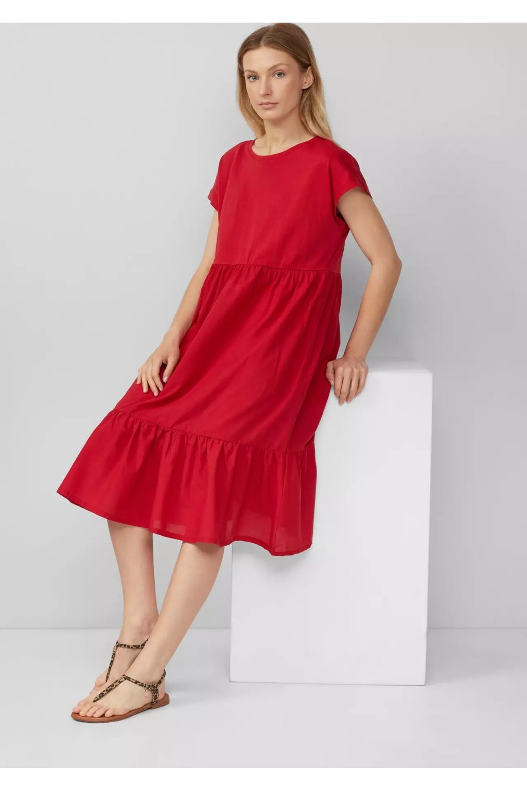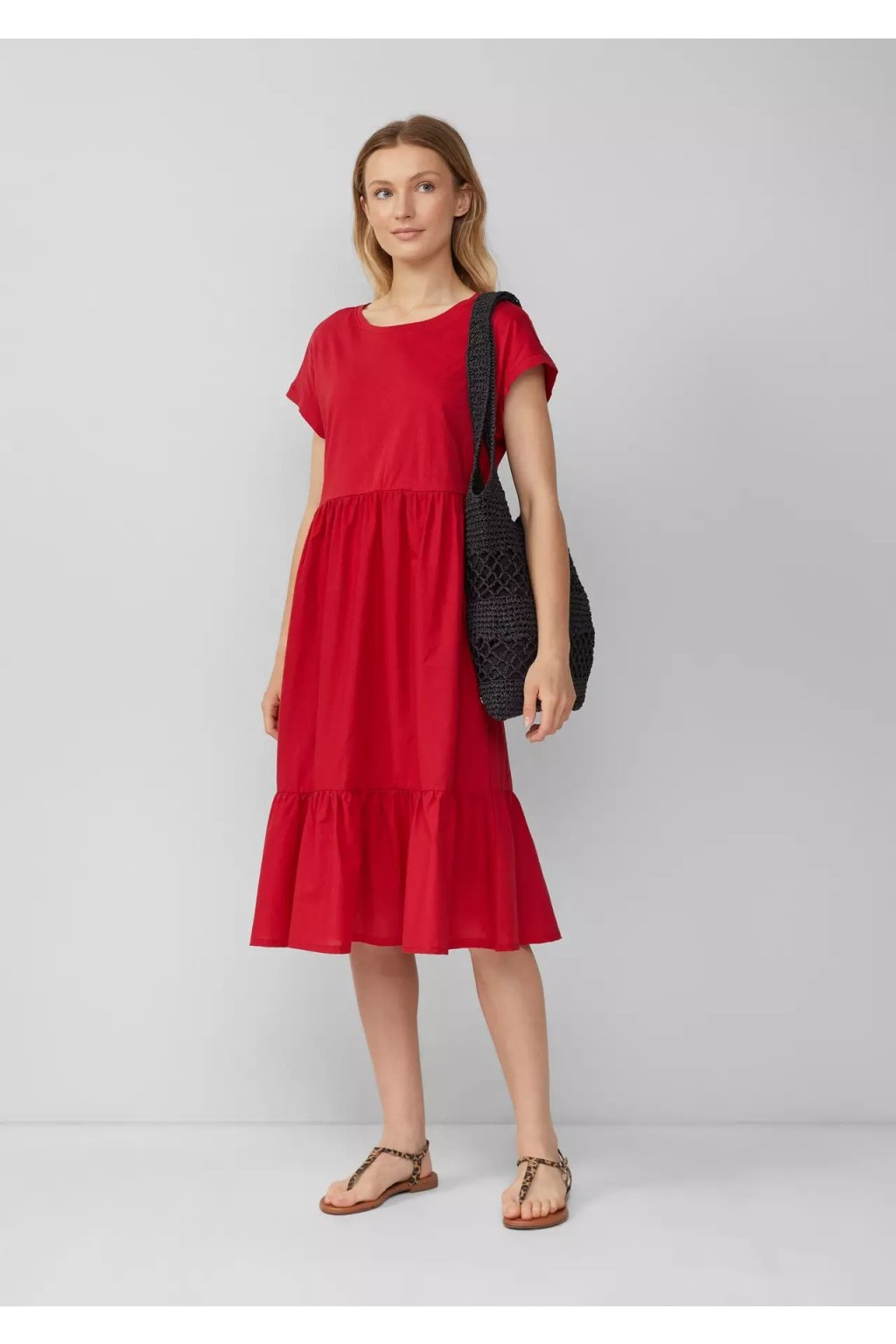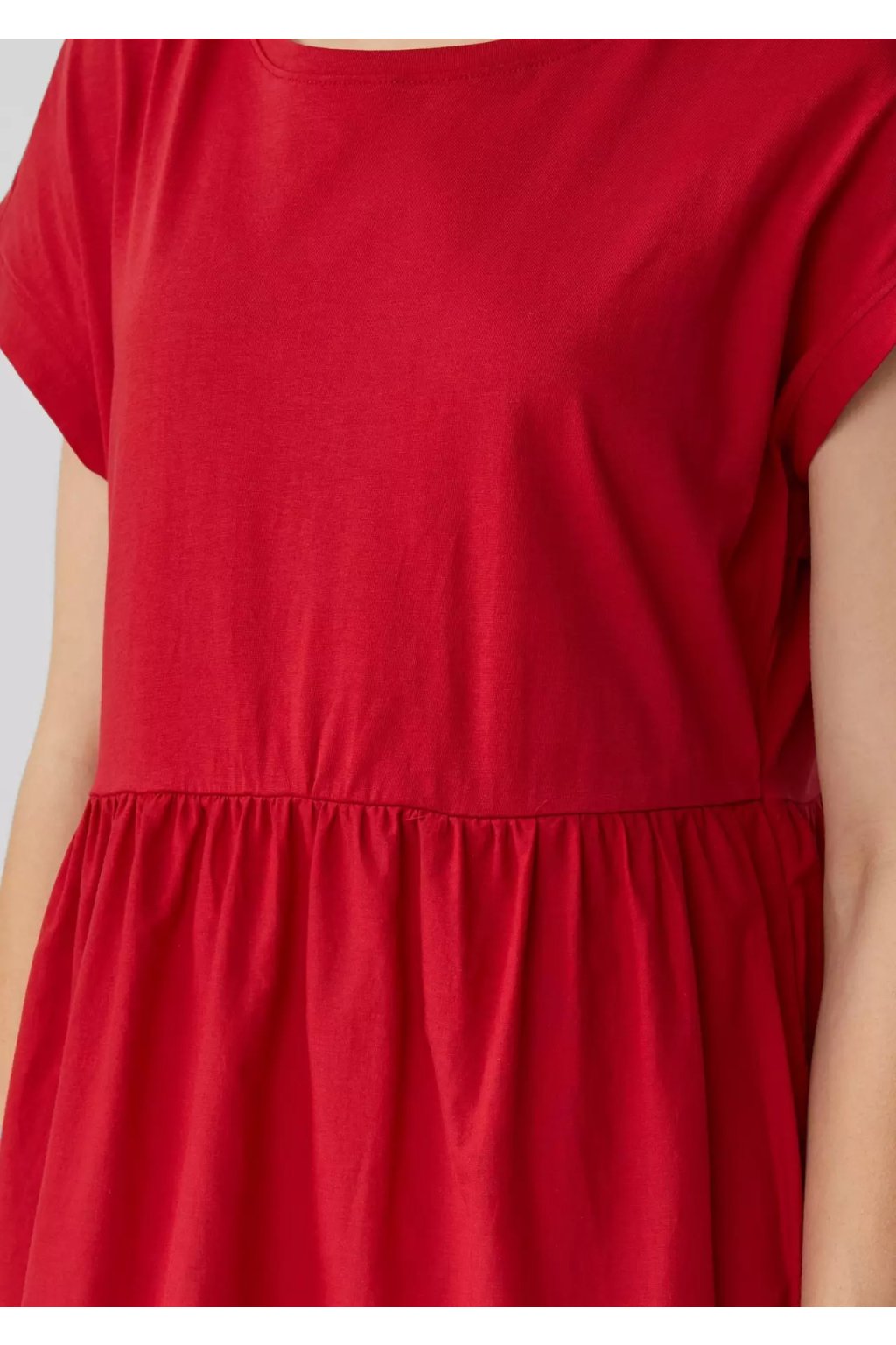 Tieto džersejové šaty v midi dĺžke s voľným strihom a spadnutými ramenami sú ideálne pre všedné dni. Mäkká tkanina a skryté vrecká dodávajú pohodlie, zatiaľ čo okrúhly výstrih a rozšírený spodný lem vytvárajú štýlovú siluetu.