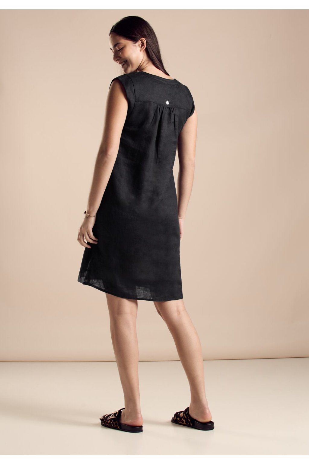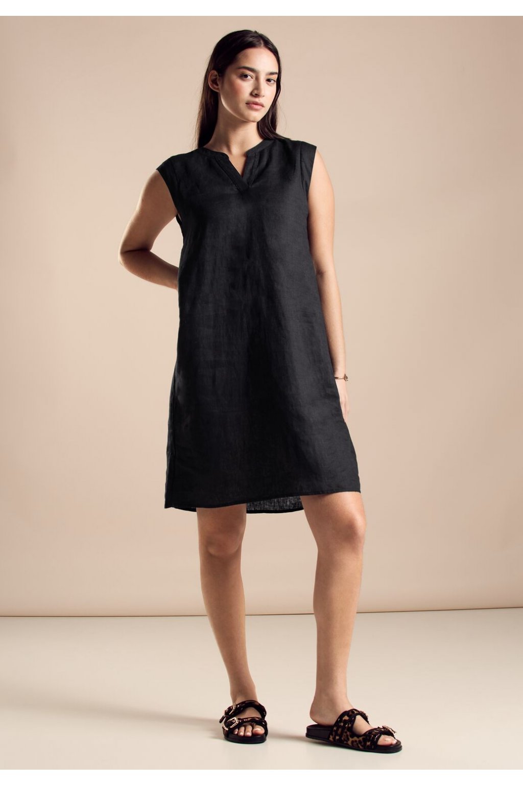 Dámske plátené šaty Street One bez rukávov s výstrihom do V si zamilujete. Je jednofarebné, po kolená a ideálne na leto. Užite si v lete pohodlnú ľahkosť tohto všestranného oblečenia.
