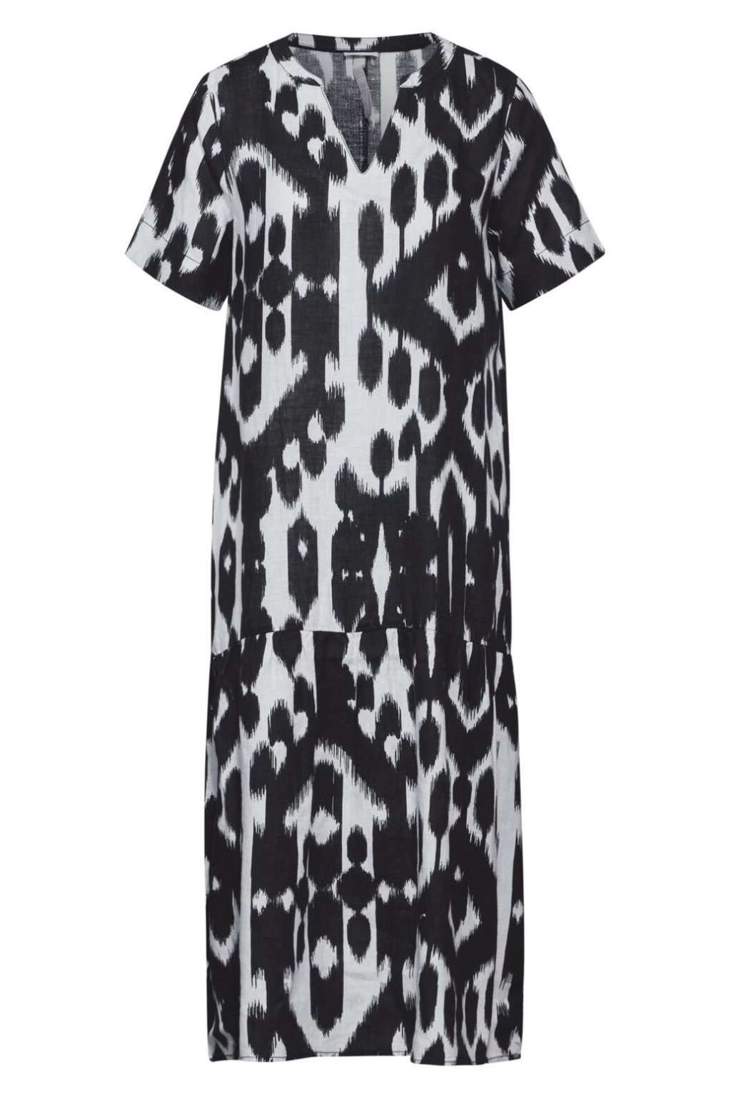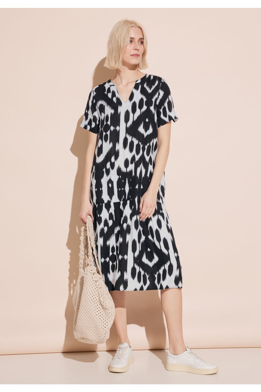 Dámske midi šaty s volánikmi od Street One sú naozajstným pútačom pre oči. Jej dizajn v kombinácii s atraktívnym výstrihom do V a krátkymi rukávmi s malými rázporkami jej dodáva elegantný nádych. Vďaka ľahkému a vzdušnému plátenému materiálu a grafickému vzoru sa skvele hodí ako pre špeciálne príležitosti, tak aj pre každodenný život.