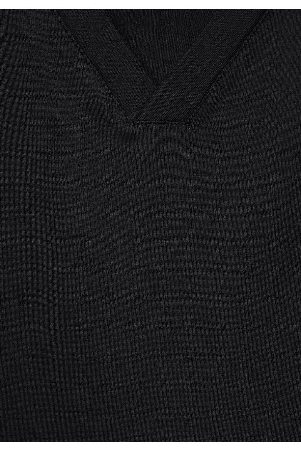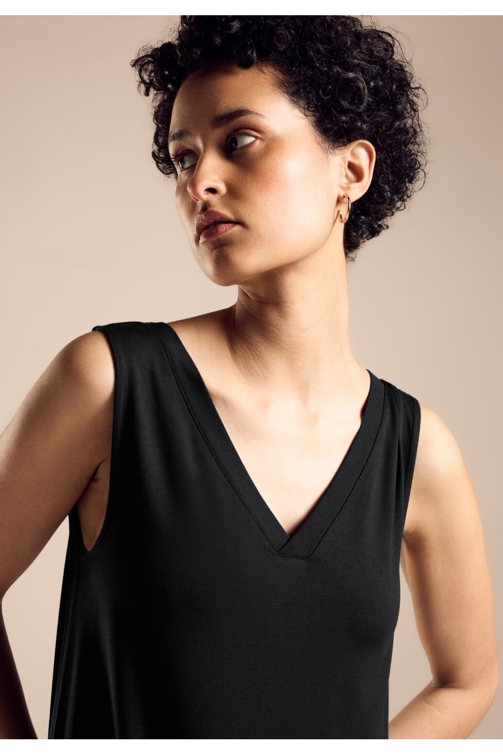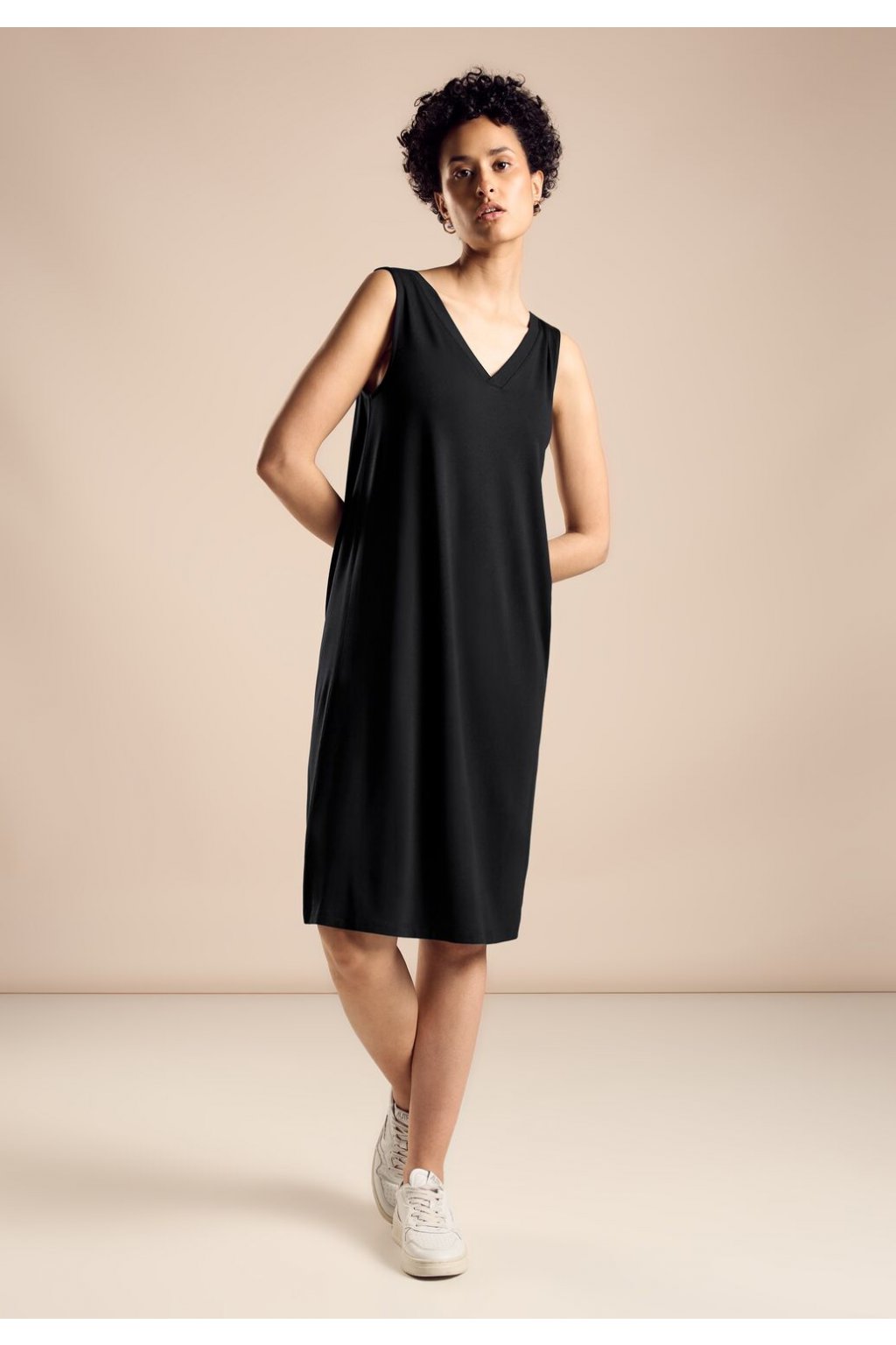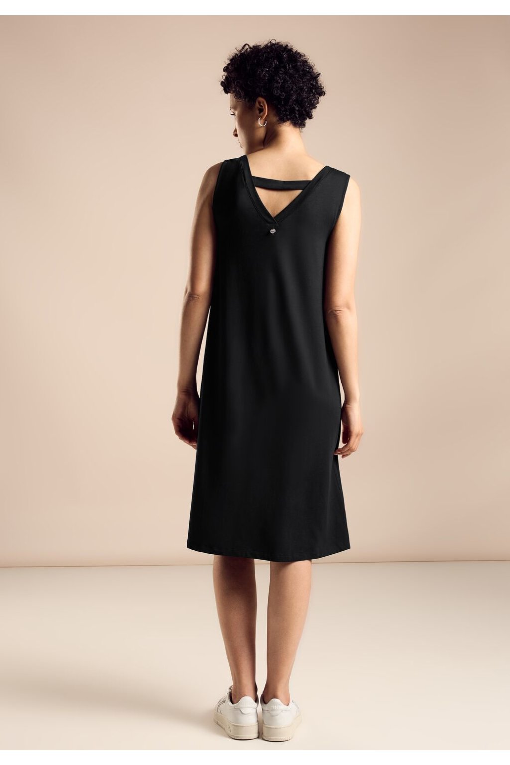 Džersejové šaty bez rukávov od Street One pre ženy sú perfektné letné šaty, ktoré obohatia váš šatník. Vďaka výstrihu do V a detailu stuhy vzadu ponúka ženský vzhľad. Pohodlné pohodlie a streč robia z týchto šiat ideálneho spoločníka do teplých dní.