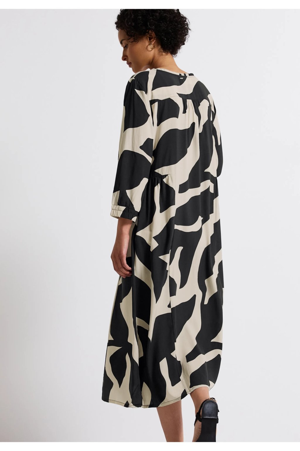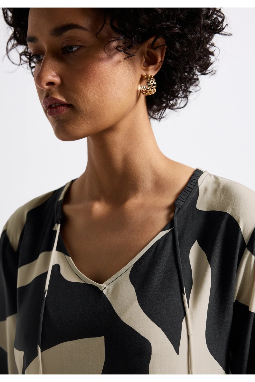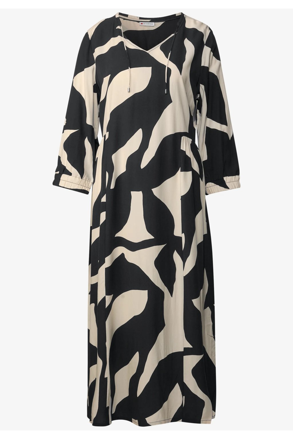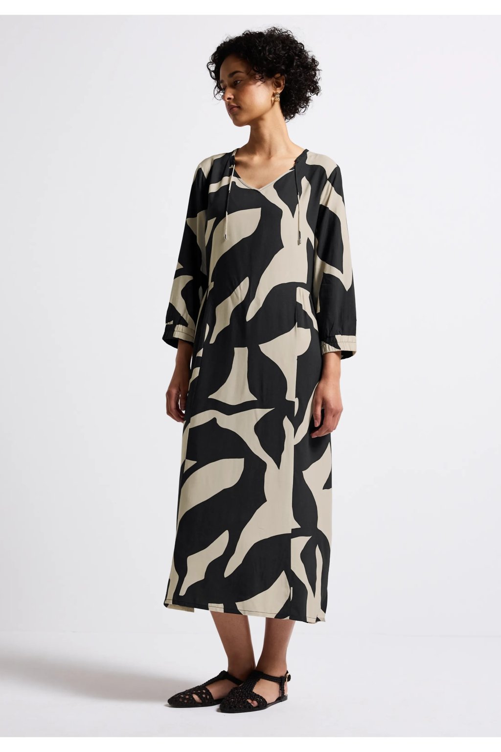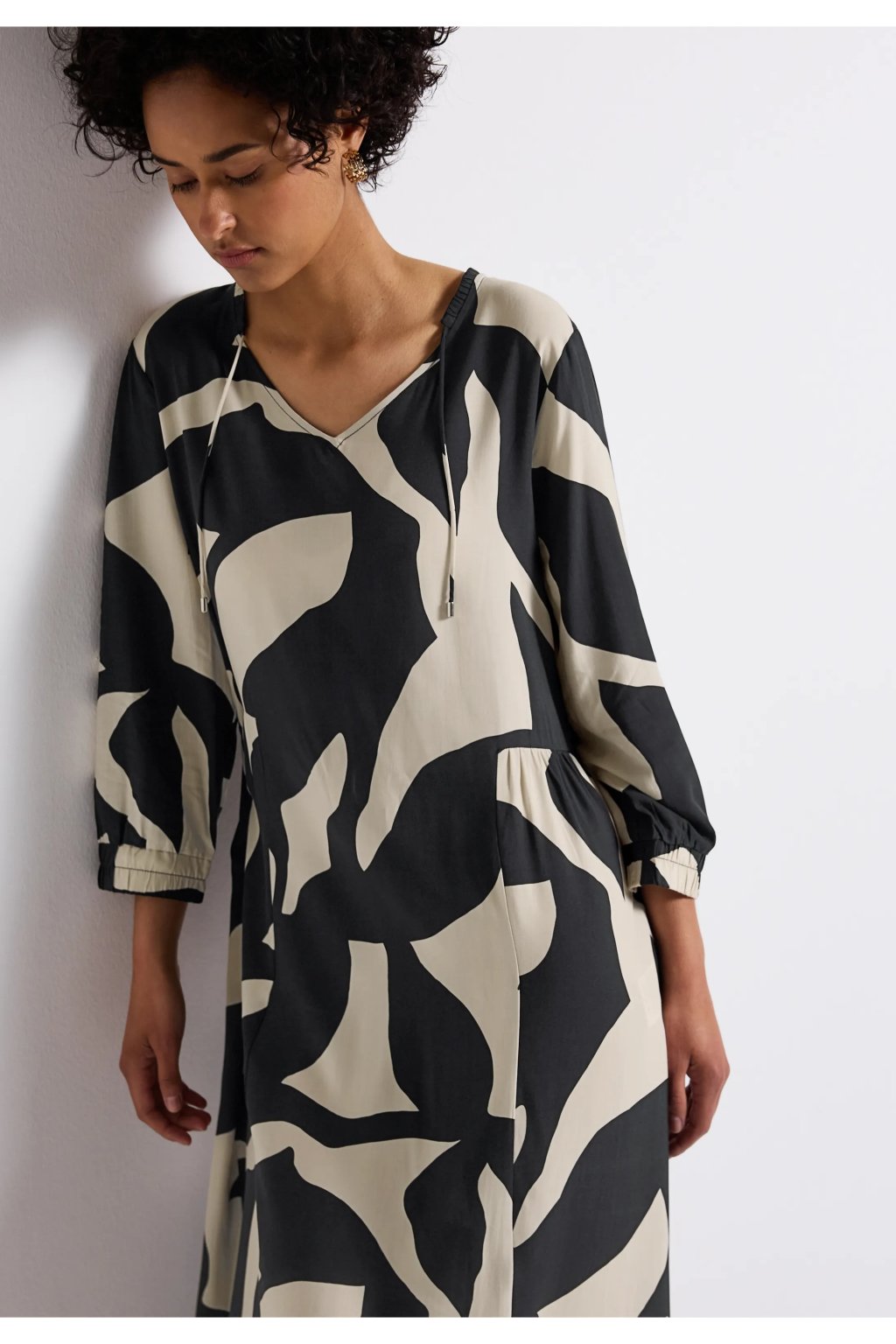 Tieto potlačené šaty od Street One pre ženy sú módnym doplnkom vďaka svojmu grafickému vzoru. Výstrih do V so stuhami a riasenie v páse dodávajú šatám po kolená ženskú siluetu. Vďaka mäkkej viskóze sú obzvlášť príjemné.