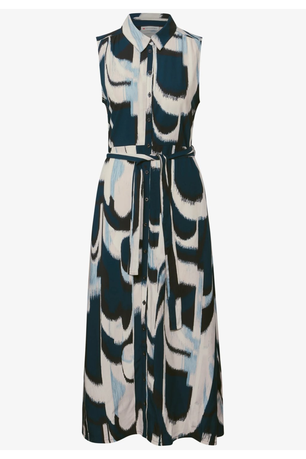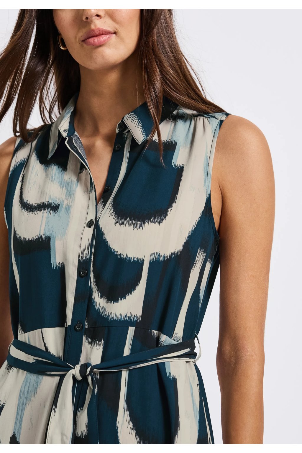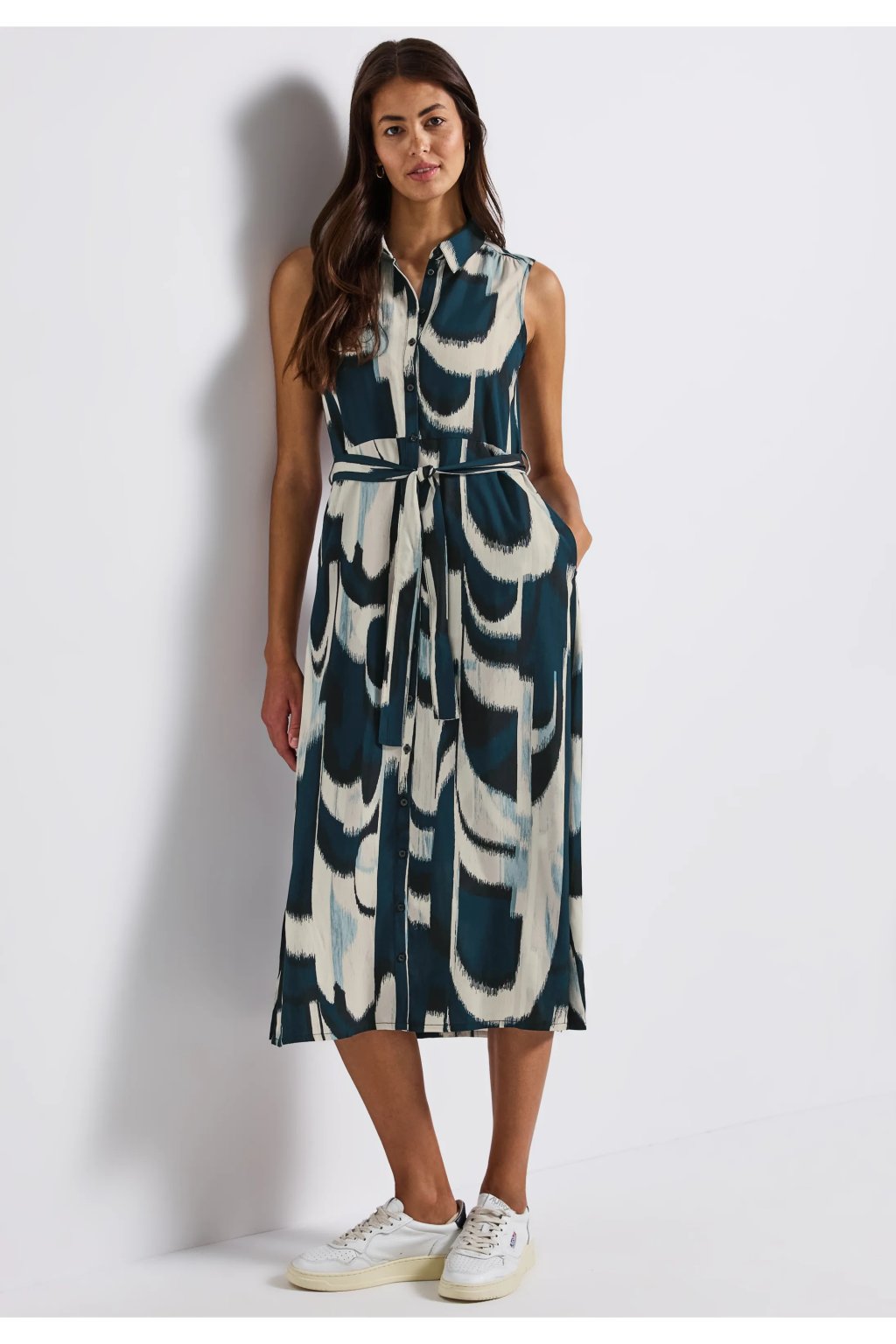 Tieto bezrukávové blúzkové šaty od Street One pre ženy kombinujú klasický strih s moderným vzorom. Mäkká viskózová tkanina je príjemne ľahká, zatiaľ čo košeľový golier, zapínanie na gombíky a opasok na zaväzovanie vytvárajú ženskú siluetu. Praktické bočné vrecká robia z týchto midi šiat štýlový kúsok na každý deň.