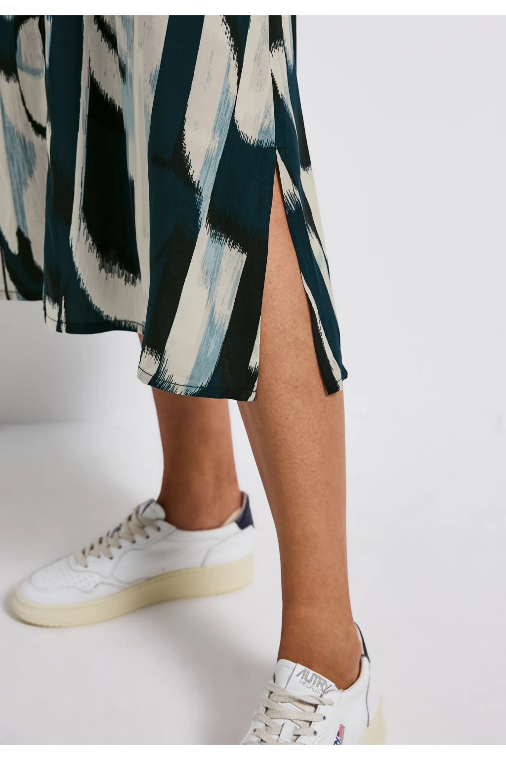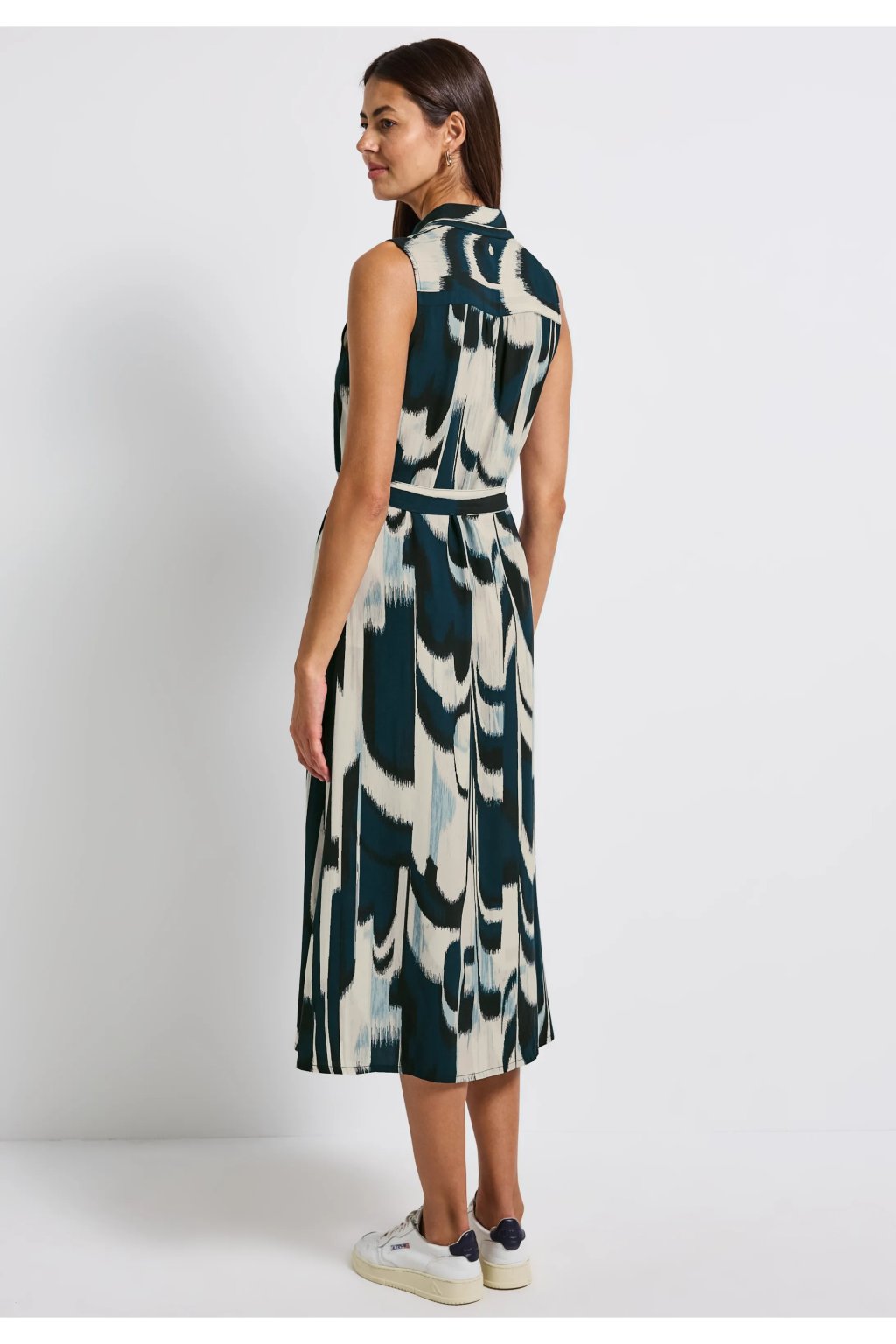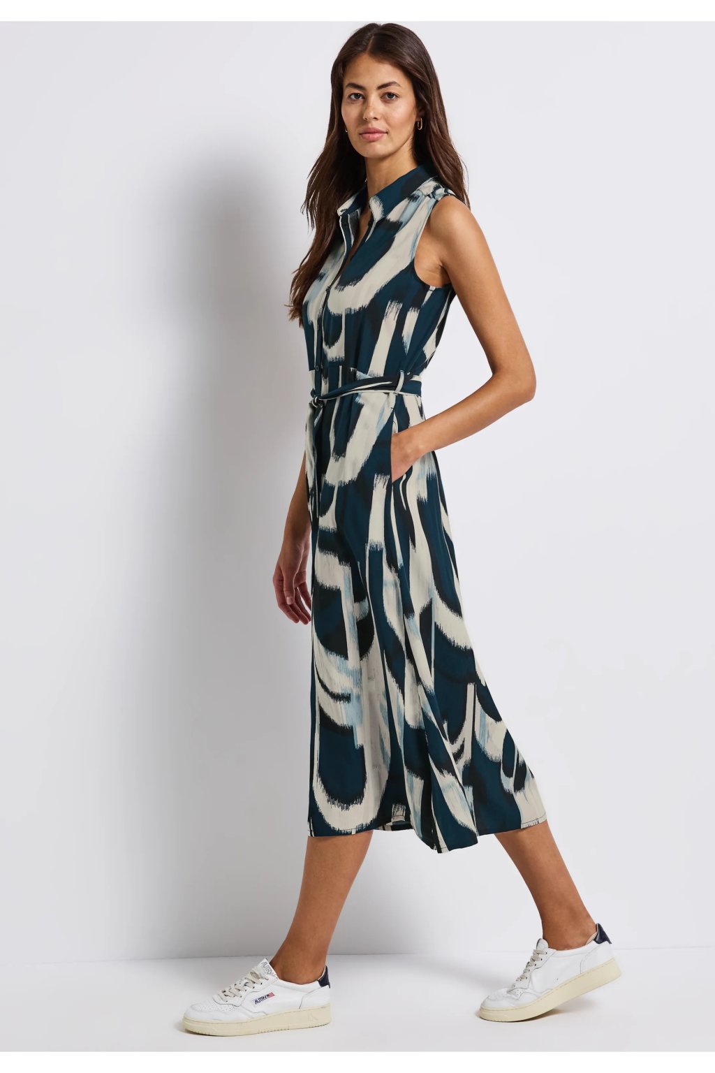 Tieto bezrukávové blúzkové šaty od Street One pre ženy kombinujú klasický strih s moderným vzorom. Mäkká viskózová tkanina je príjemne ľahká, zatiaľ čo košeľový golier, zapínanie na gombíky a opasok na zaväzovanie vytvárajú ženskú siluetu. Praktické bočné vrecká robia z týchto midi šiat štýlový kúsok na každý deň.