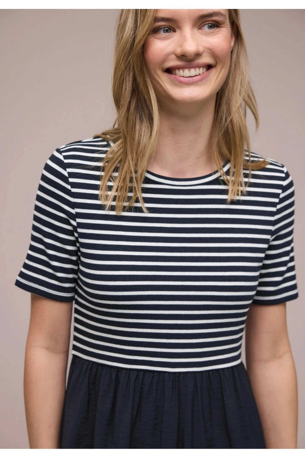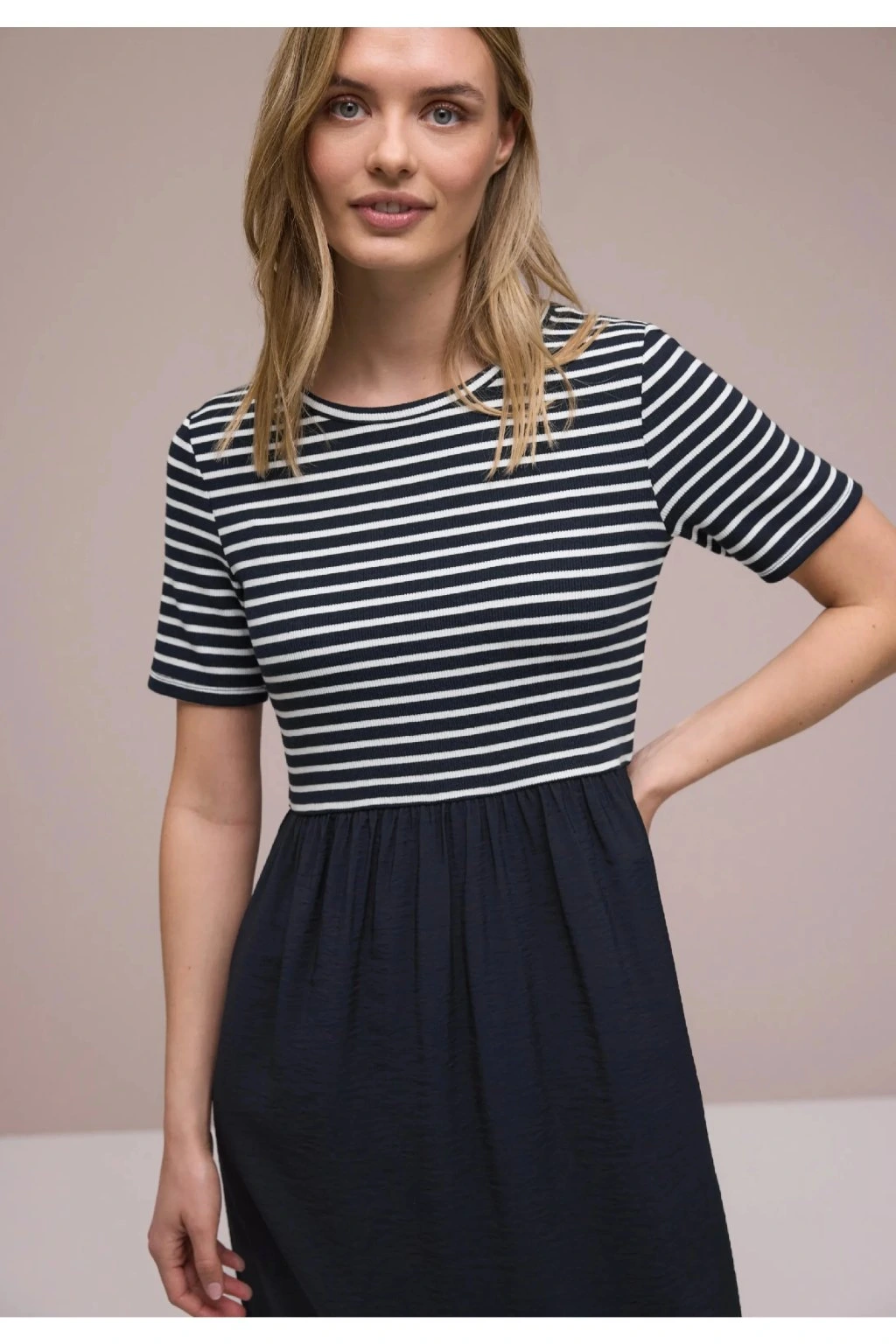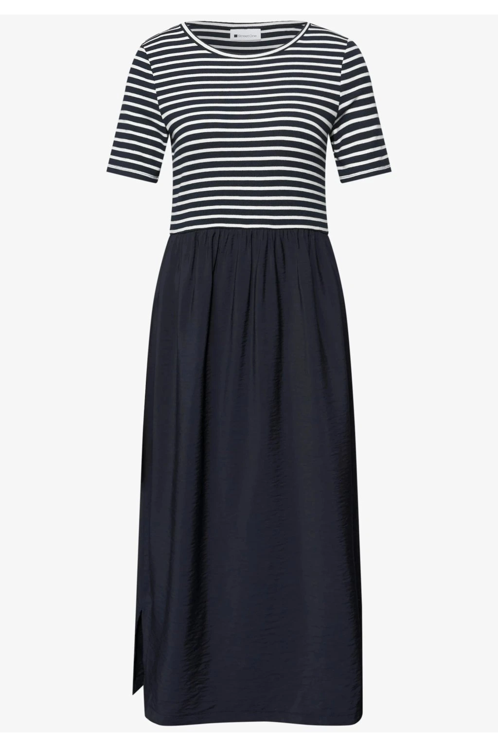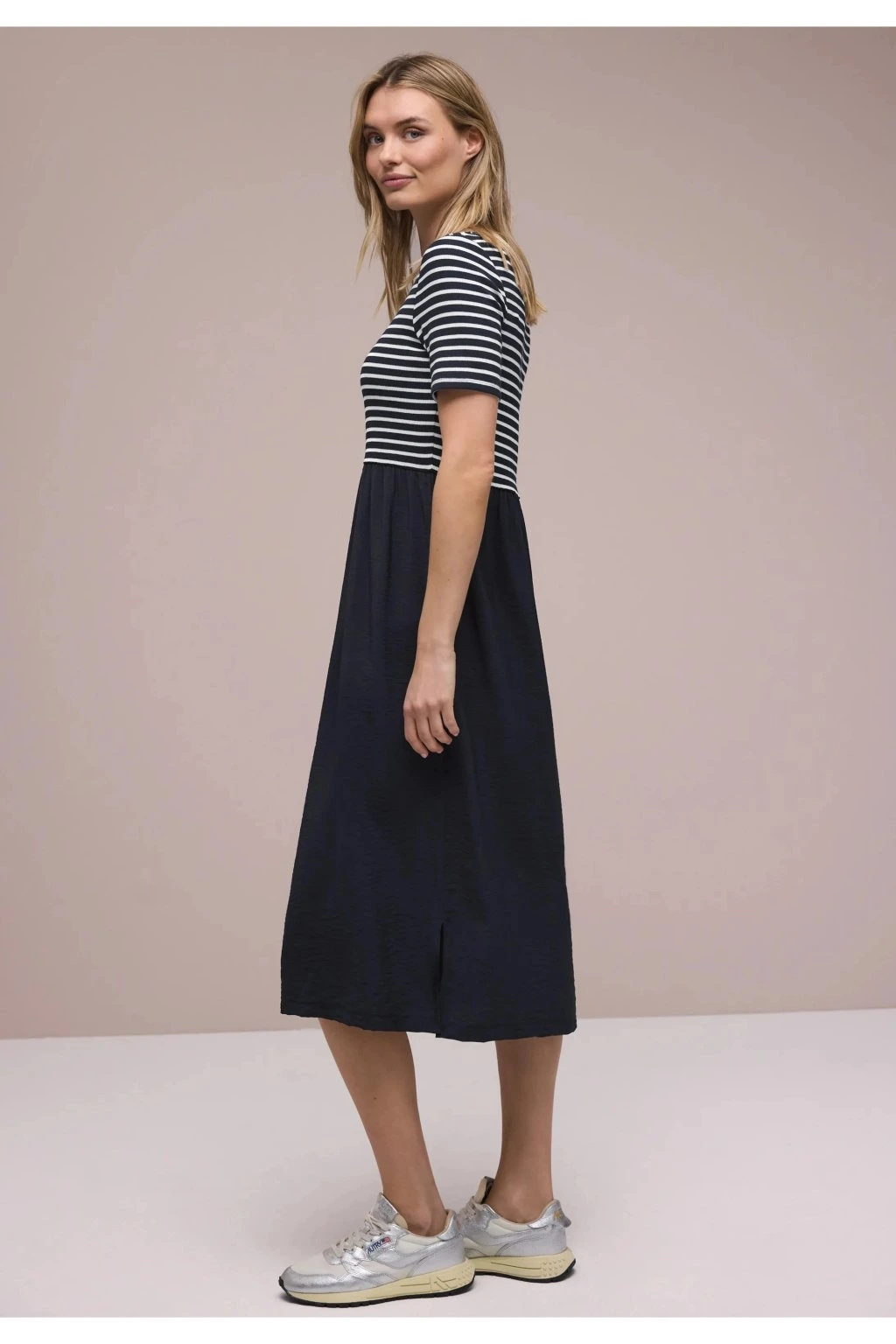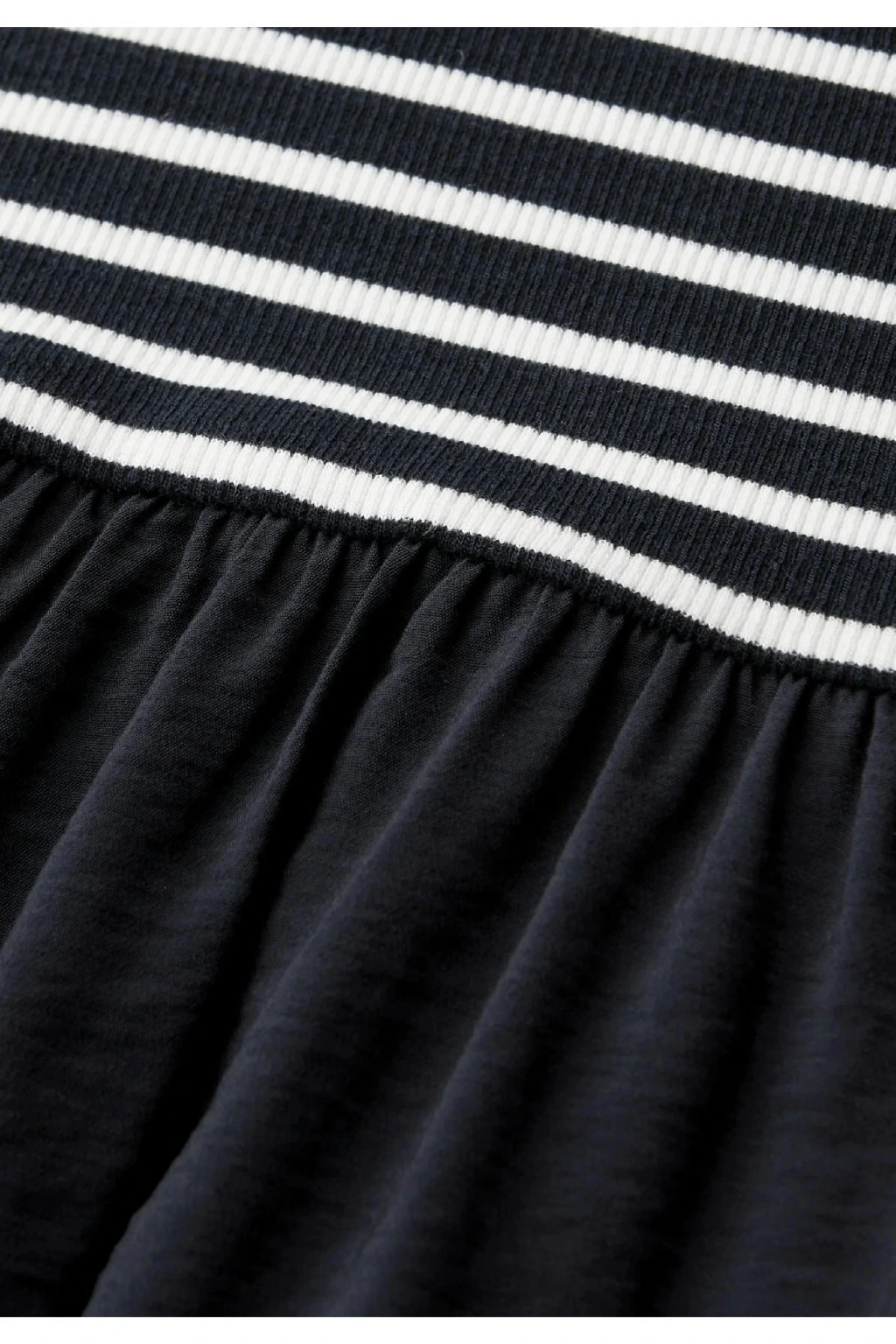 Dámske midi šaty v nadčasovej tmavo modrej farbe s pruhovaným vrškom pôsobia sviežo a veľmi žensky. Horná časť s jemnými prúžkami a krátkym rukávom krásne dopĺňa voľne splývavú sukňu, ktorá zaisťuje pohodlie pri nosení. Šaty majú okrúhly výstrih, príjemný a ľahký materiál a vďaka jednoduchému strihu sa skvele hodí ako na bežné nosenie, tak na voľnočasové aktivity. Ľahko ich skombinujete s teniskami pre športovo-ležérny look alebo so sandálkami pre elegantnejší štýl.