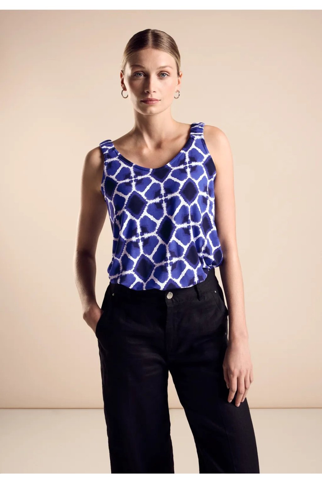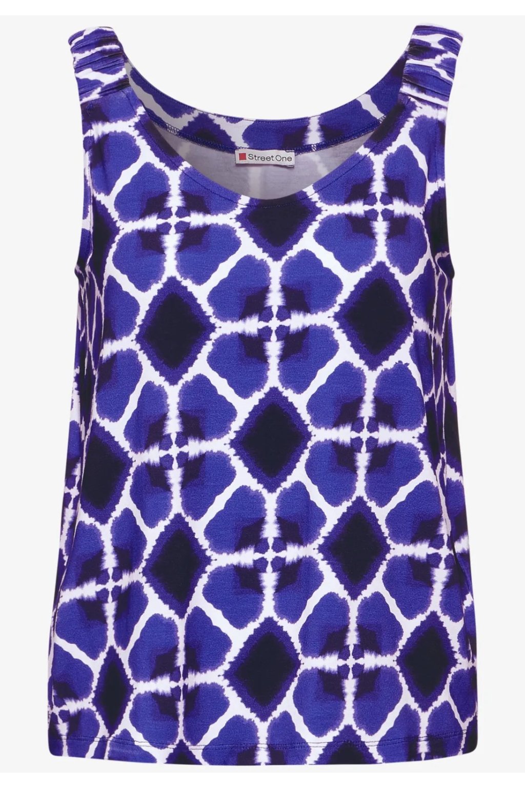 Street One Women's Printed Top je módny letný top s lichotivým výstrihom do V a nariasenými ramienkami. Vyrobené z viskózy so strečovým obsahom, ponúka optimálny strih a voľnosť pohybu. Tento top, ideálny pre teplé dni, dodá vášmu vzhľadu trendy a ženský nádych.